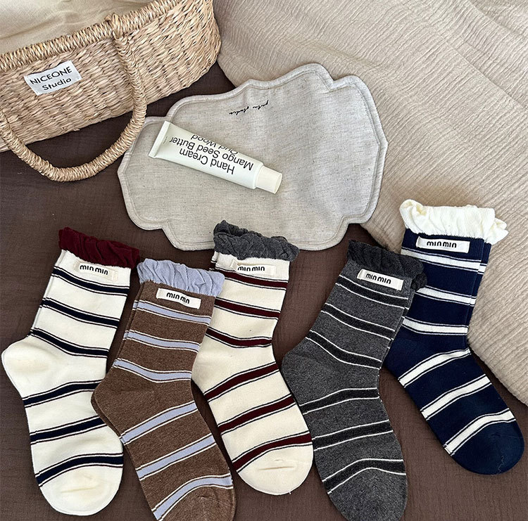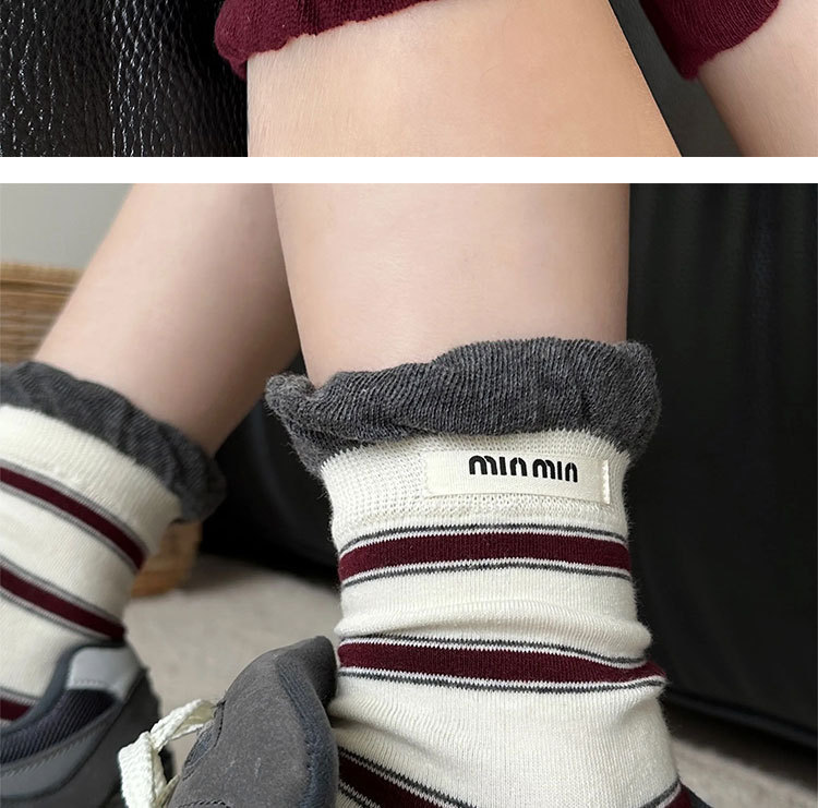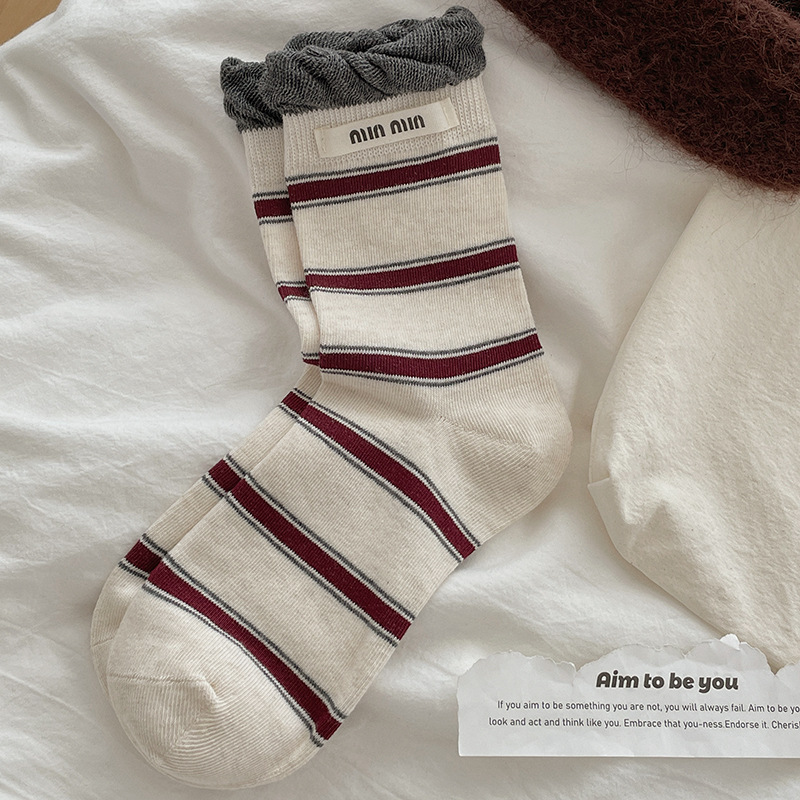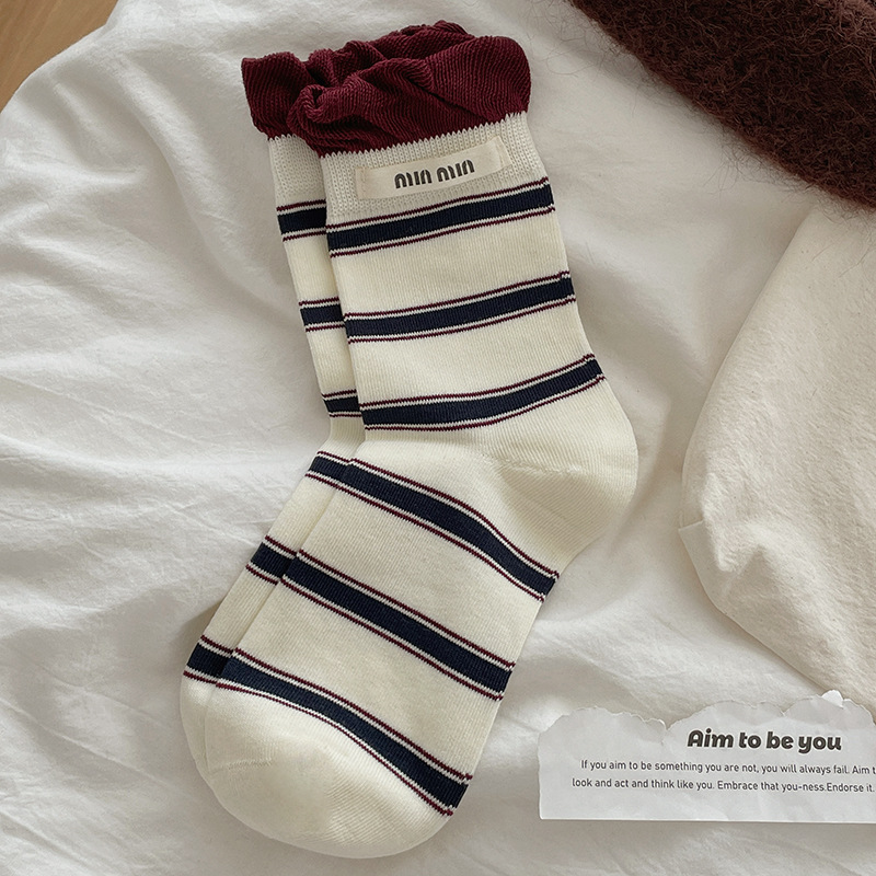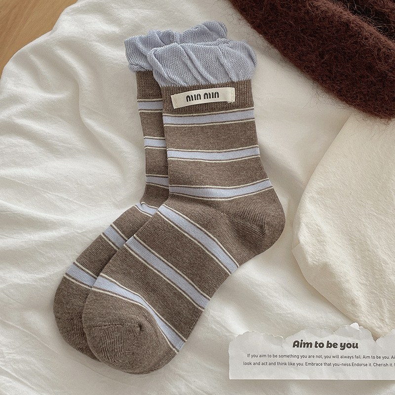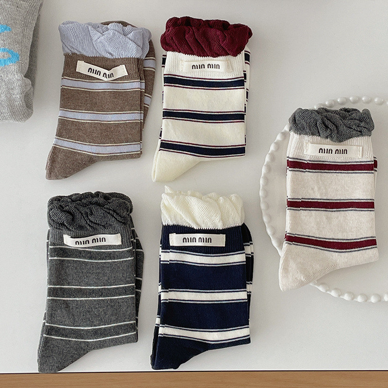 袜子女花边泡泡口条纹中筒袜秋冬季ins潮布标字母无骨纯棉堆堆袜