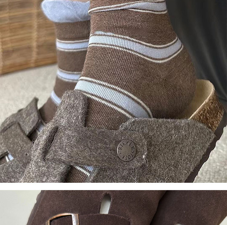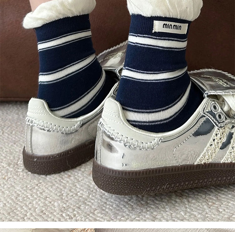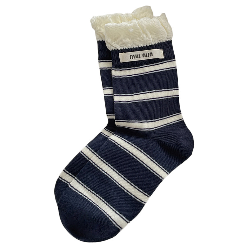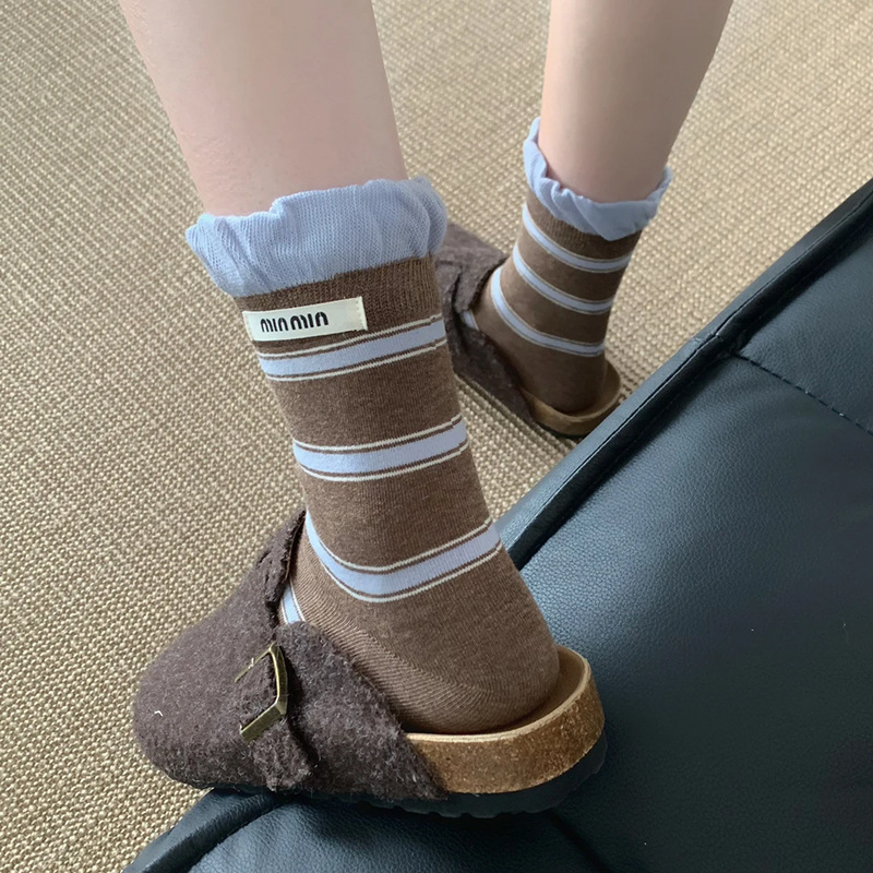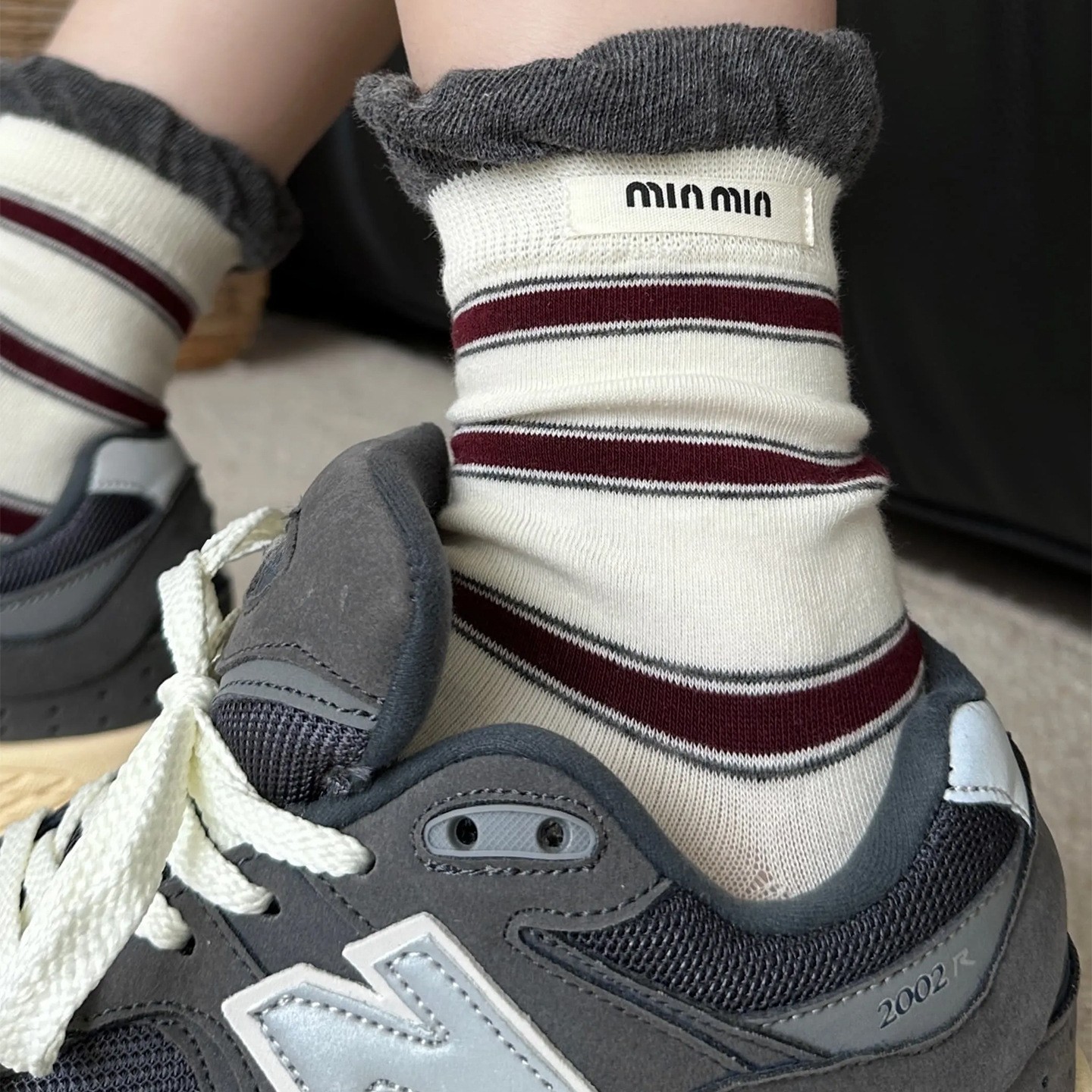 袜子女花边泡泡口条纹中筒袜秋冬季ins潮布标字母无骨纯棉堆堆袜