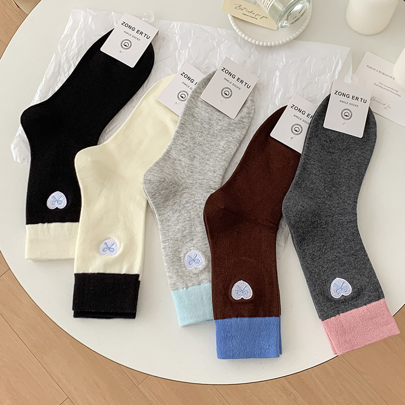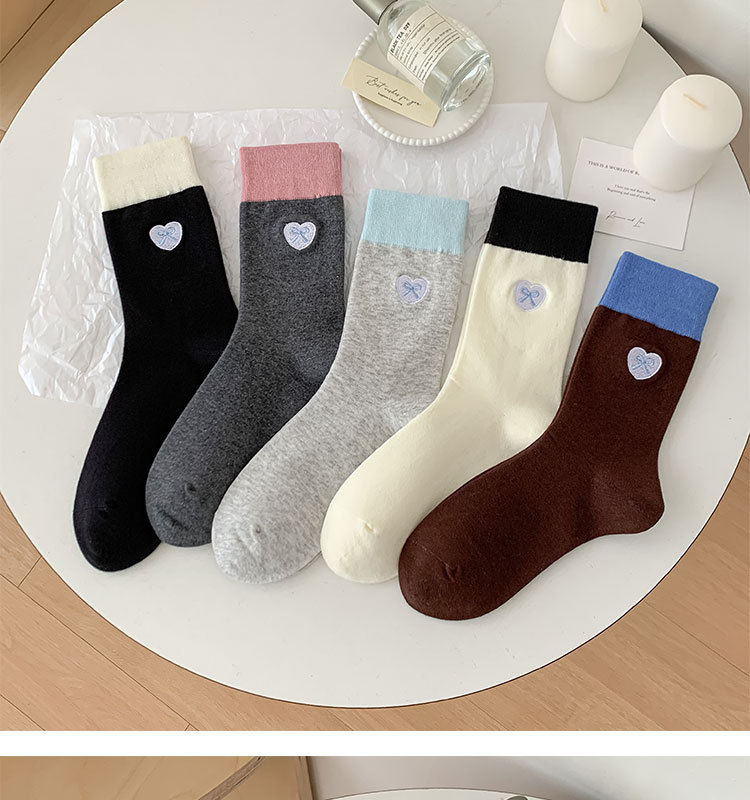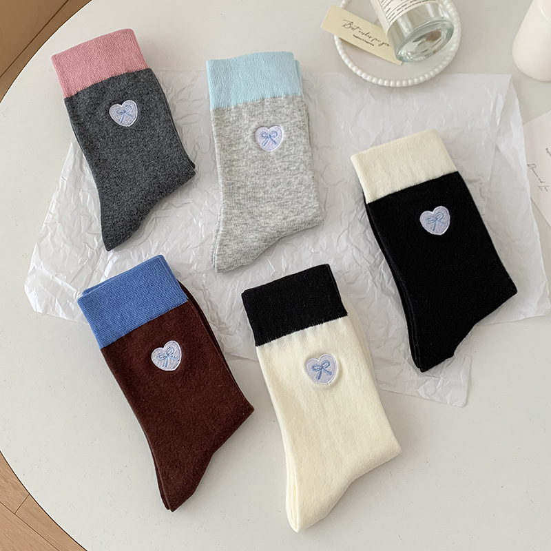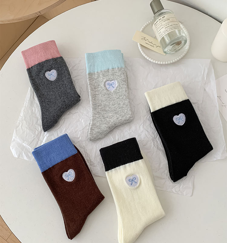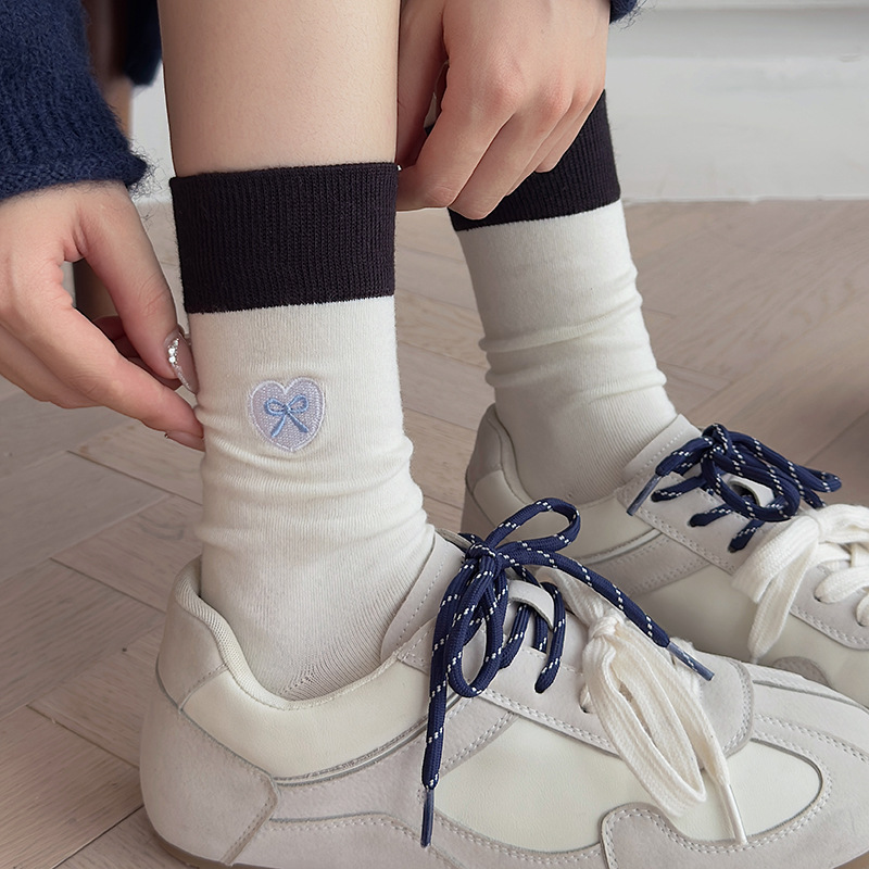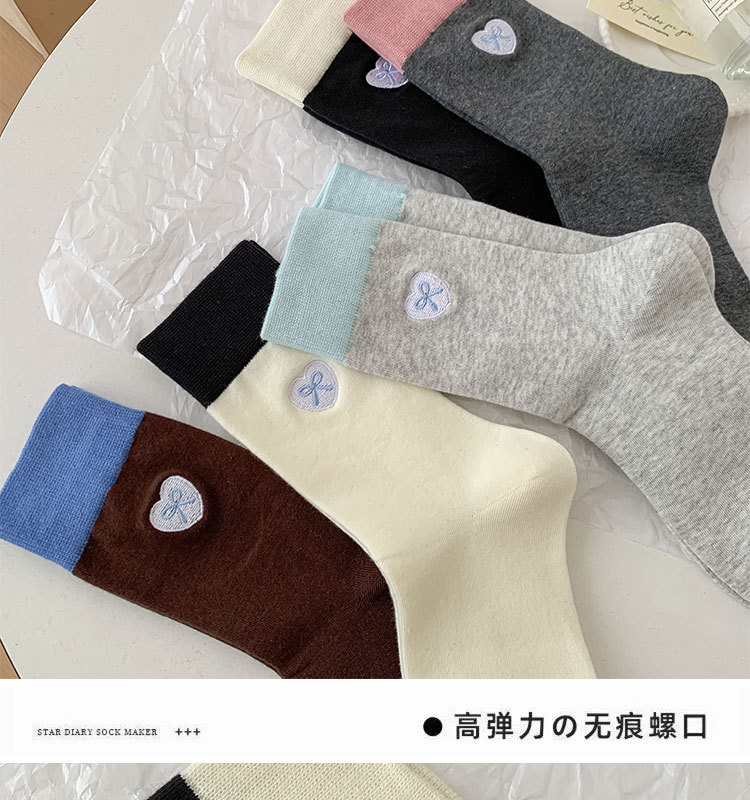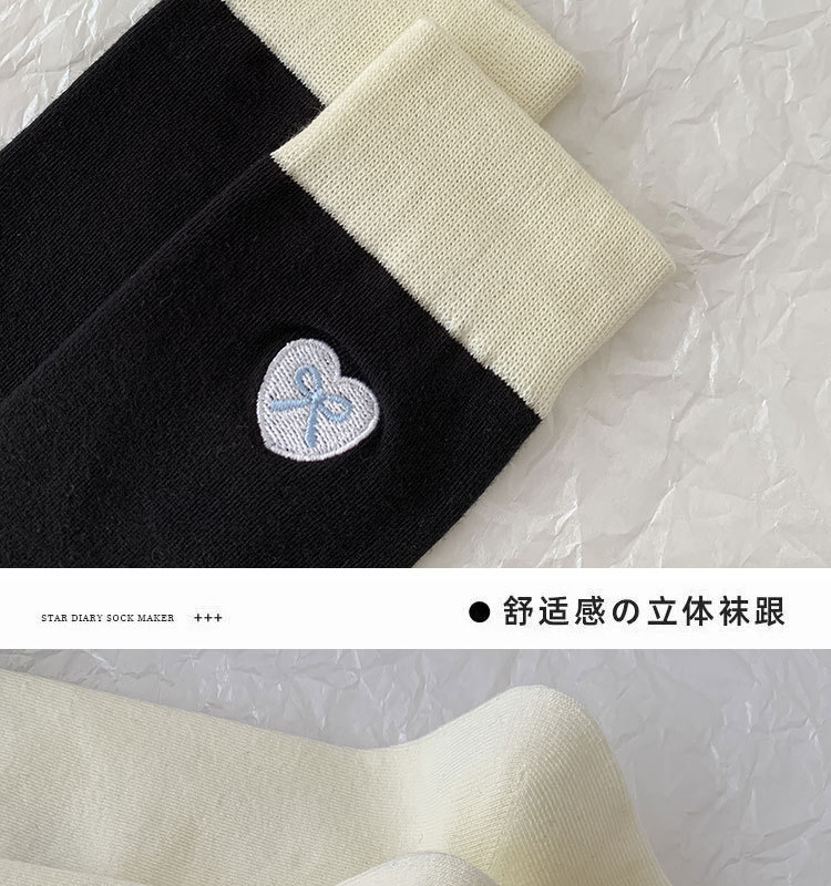 拼色袜子女纯棉堆堆袜刺绣蝴蝶结爱心韩国东大门秋冬季全棉中筒袜