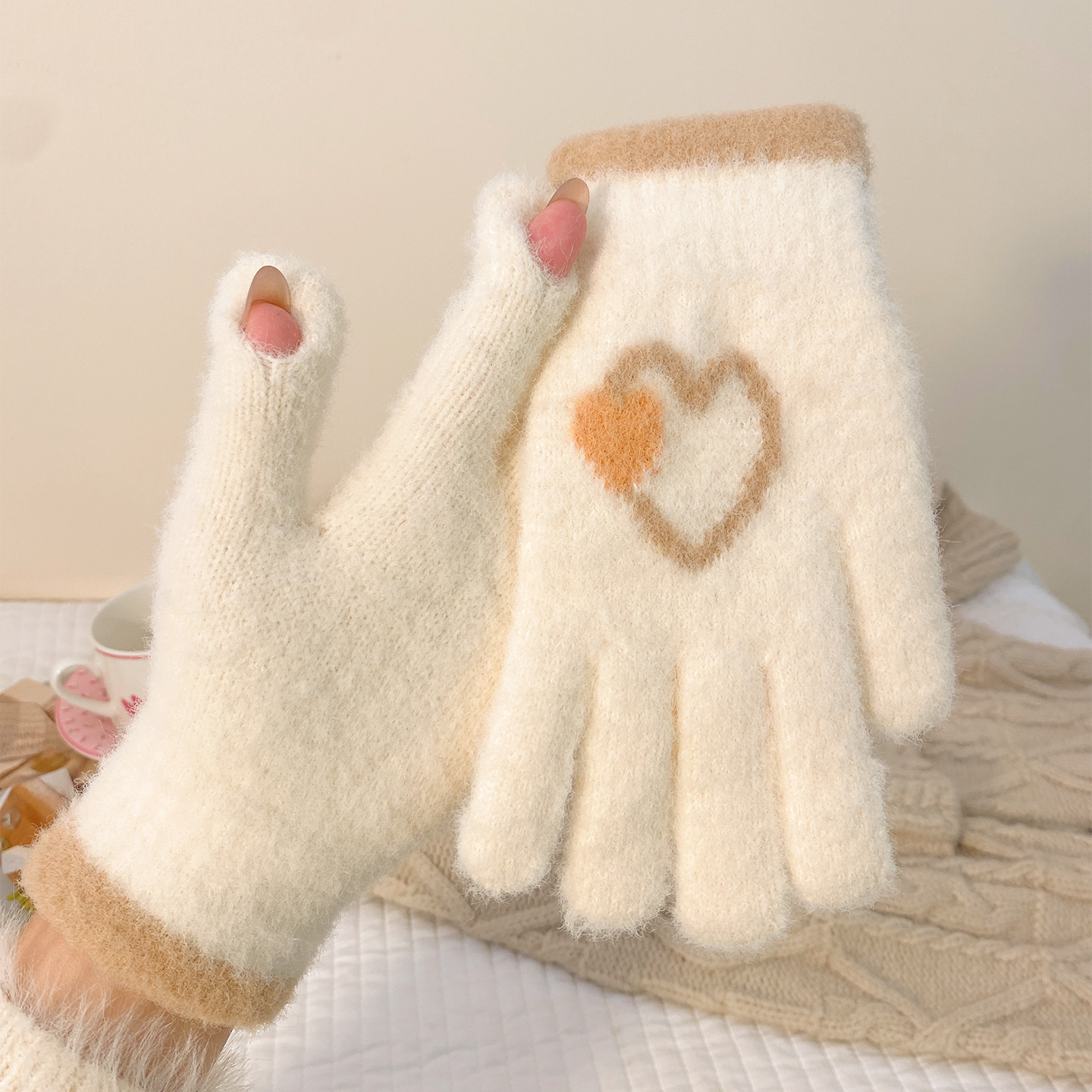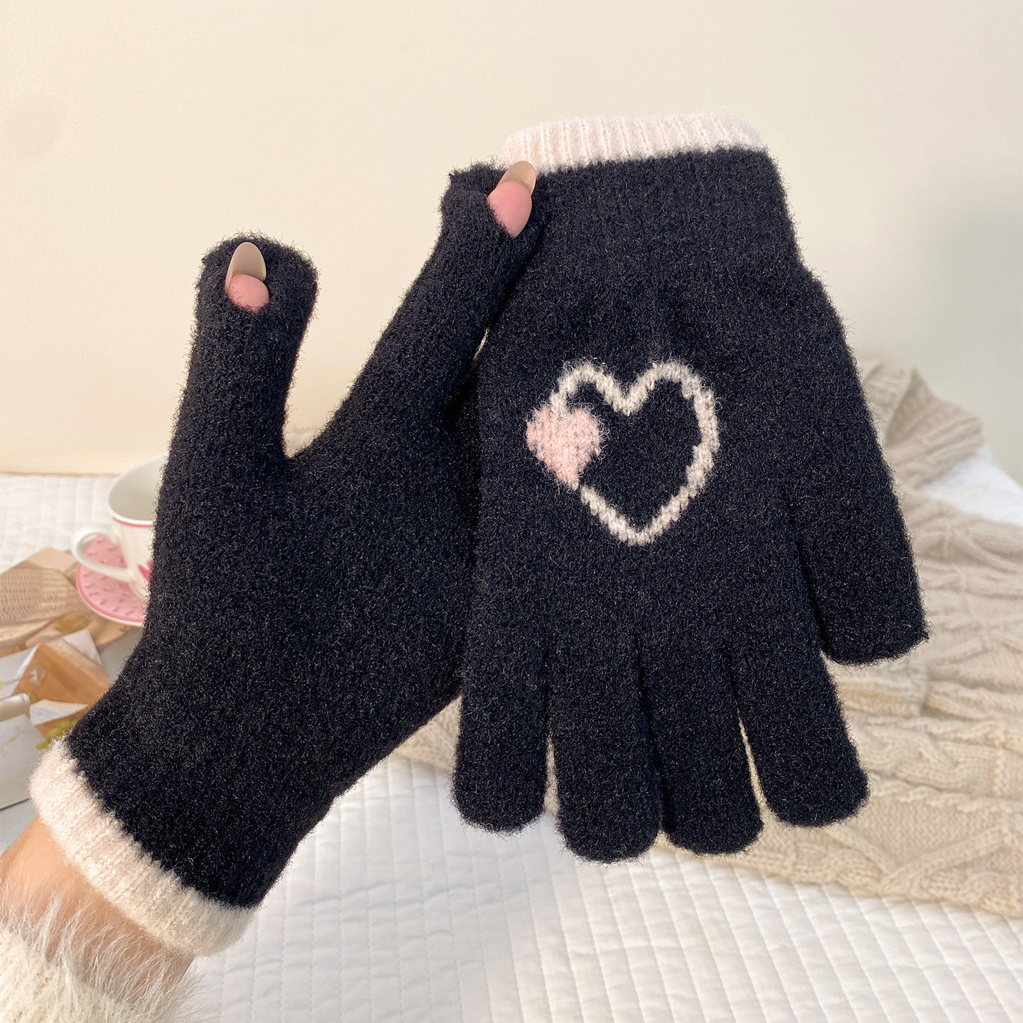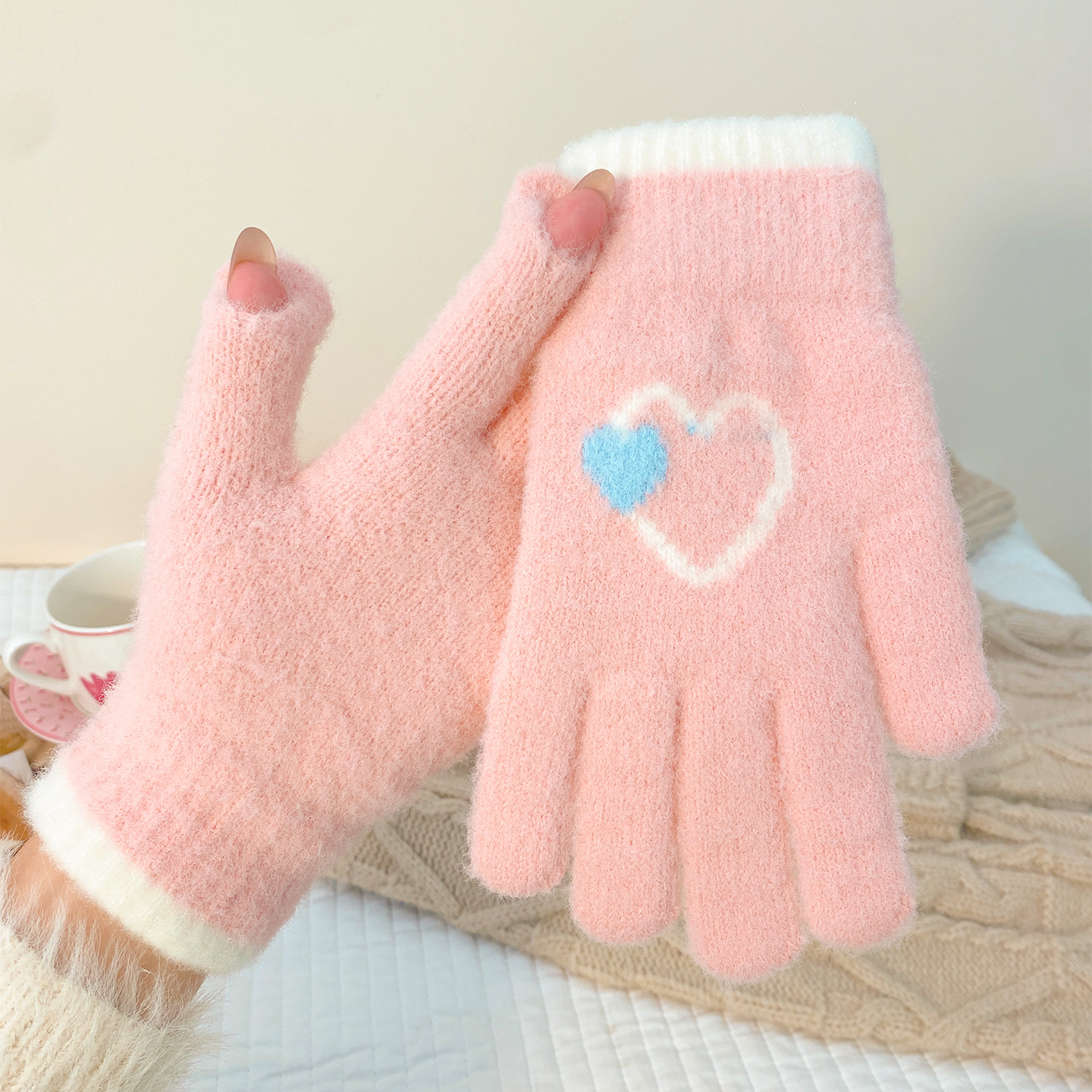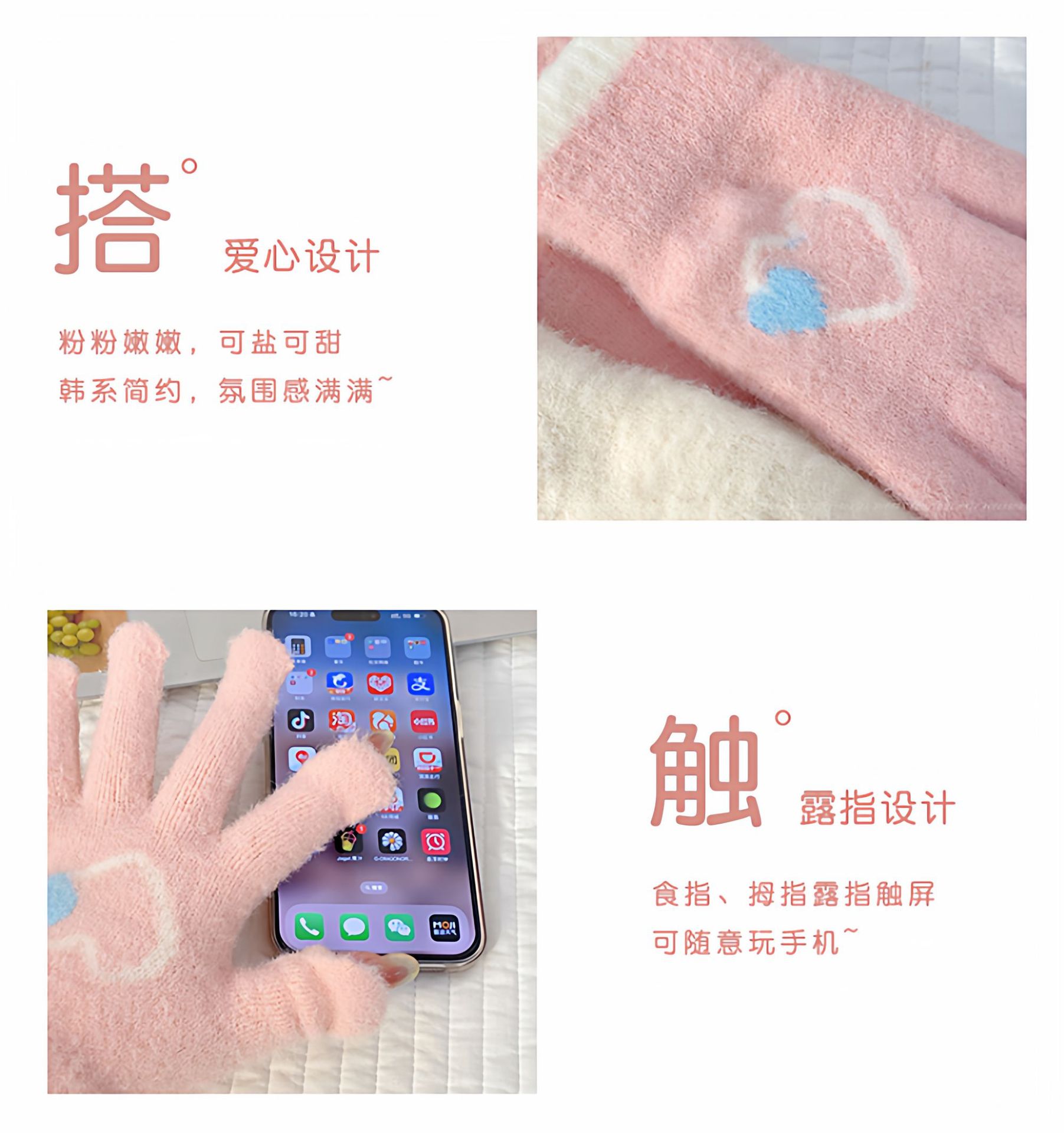 冬季新款保暖露指可触屏手套女针织可爱时尚拼色学生骑行手套批发