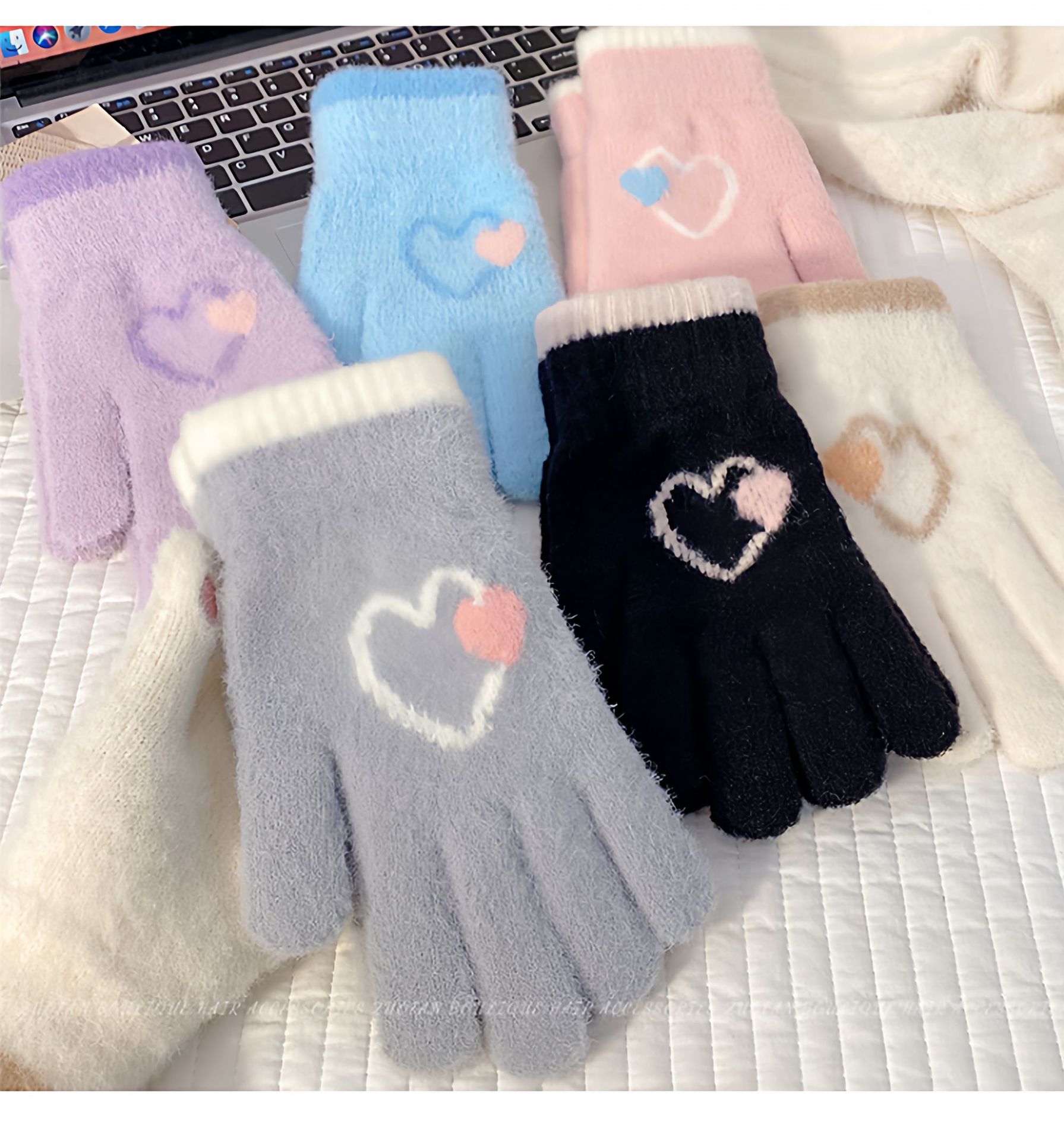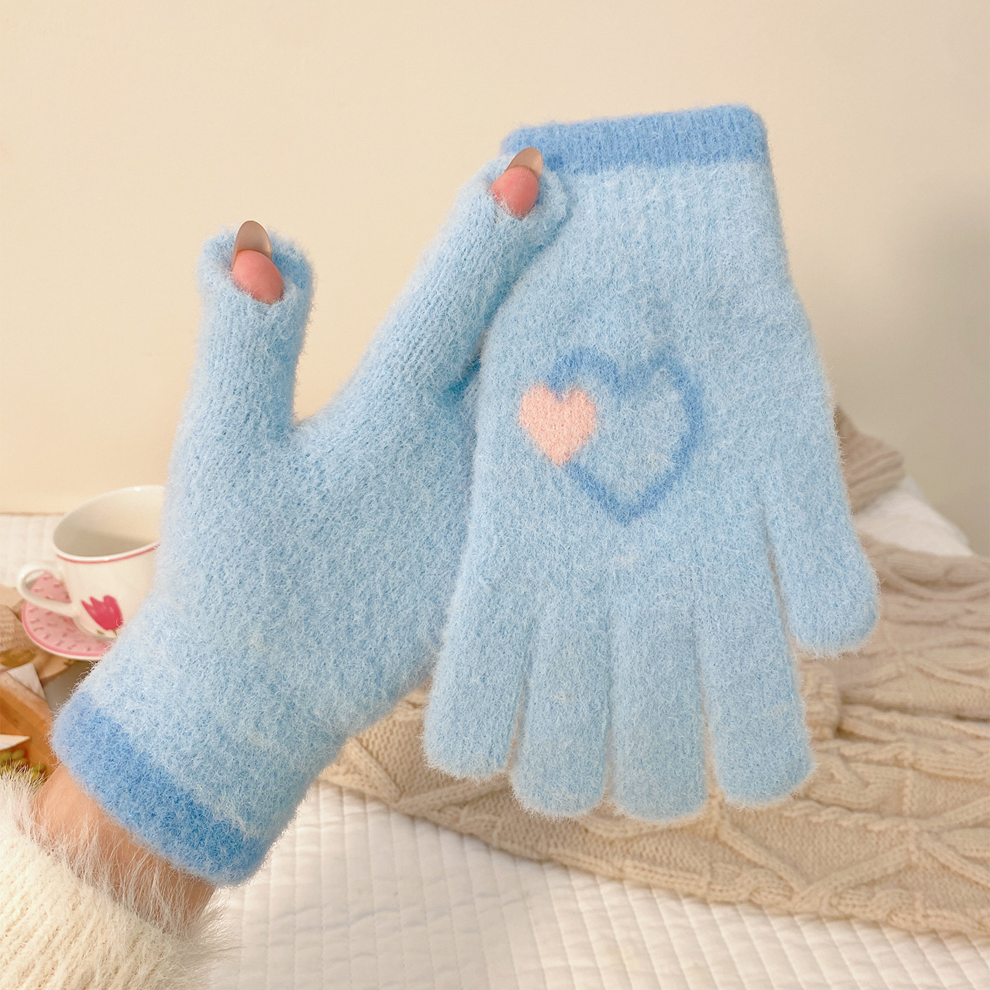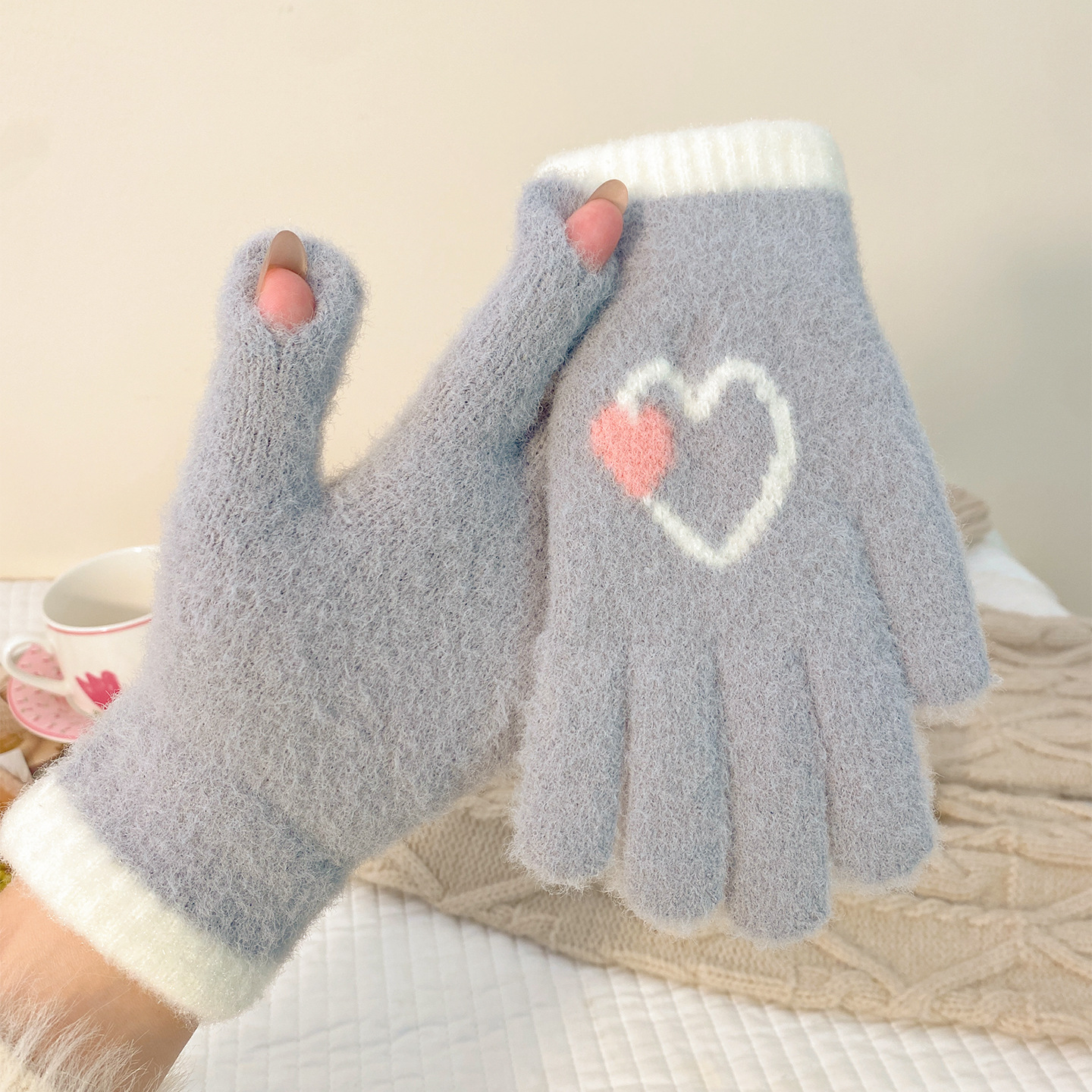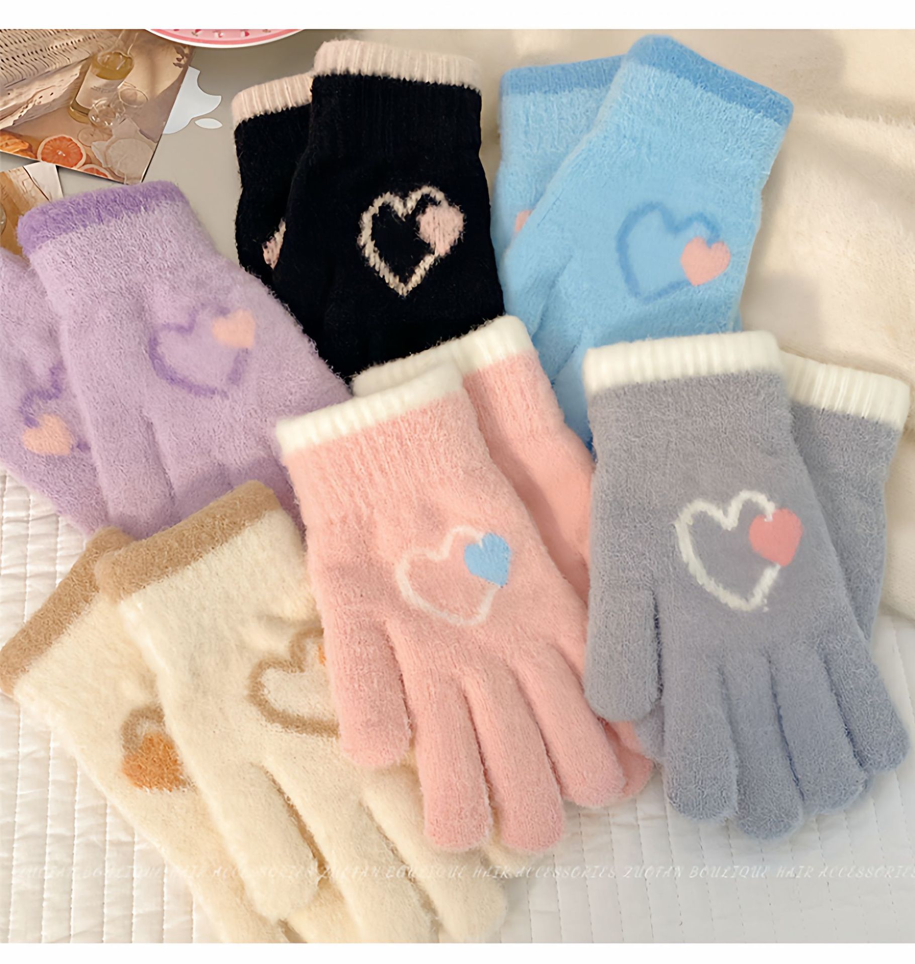 冬季新款保暖露指可触屏手套女针织可爱时尚拼色学生骑行手套批发