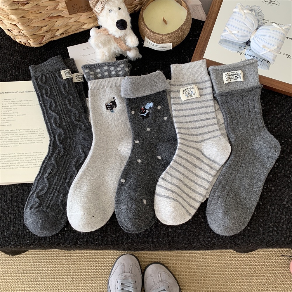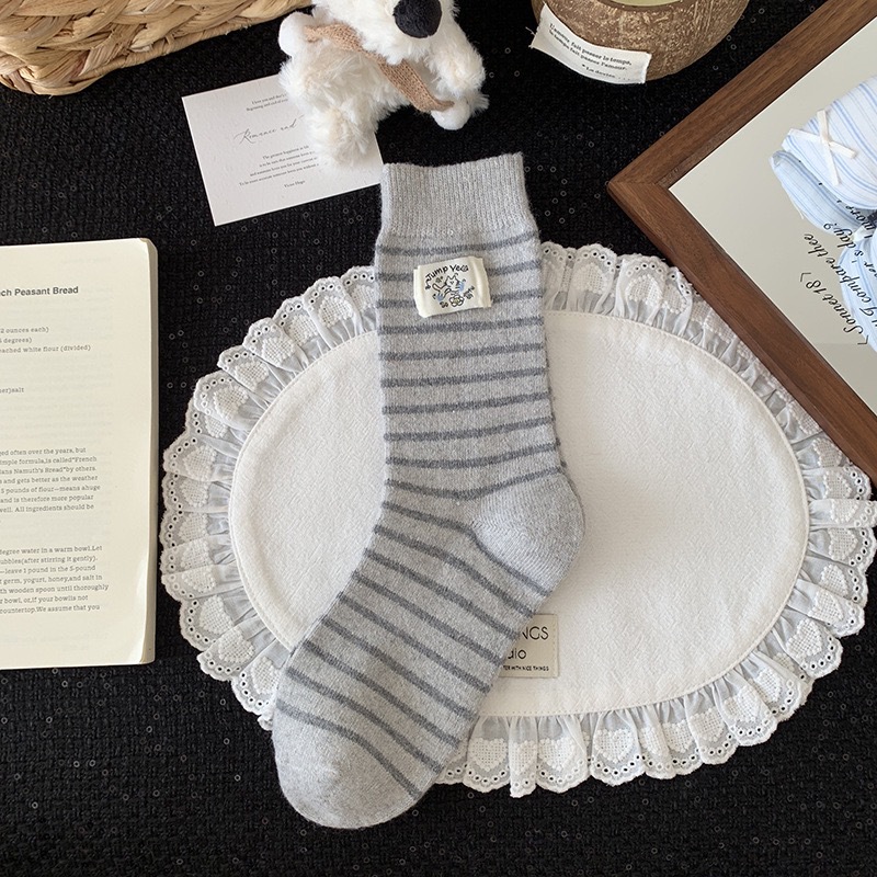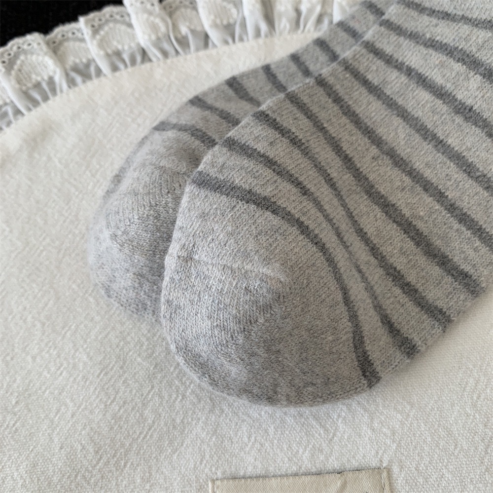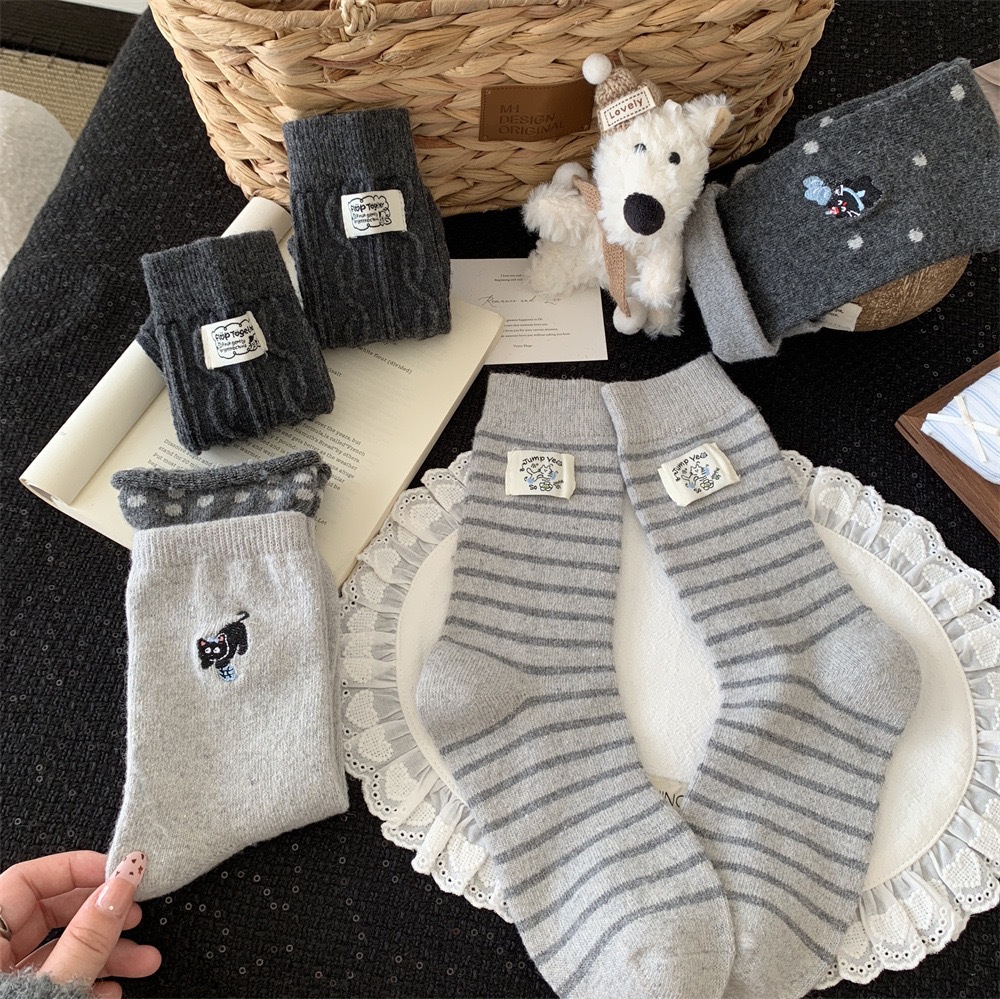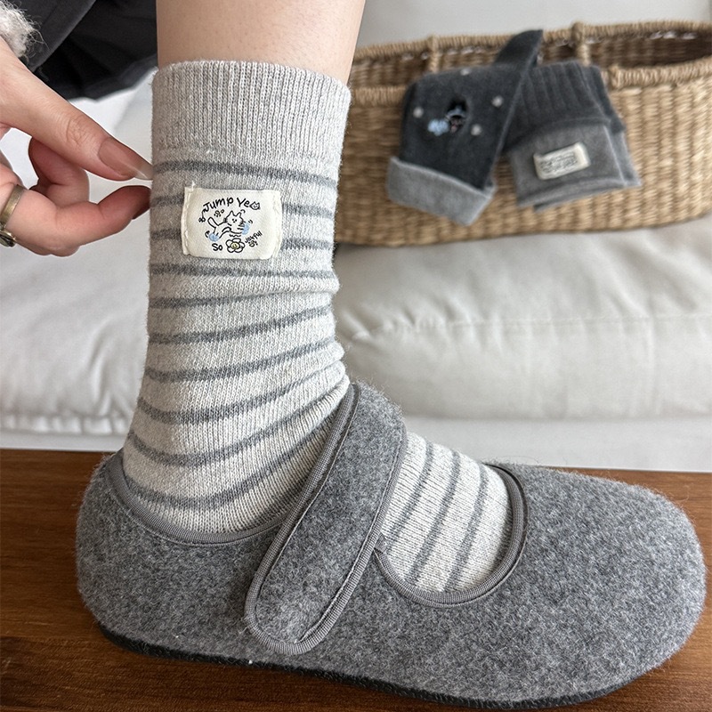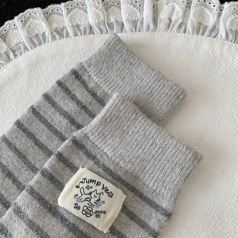 秋冬灰系保暖袜子女袜ins韩系条纹布标费尔岛猫咪羊毛堆堆袜袜子