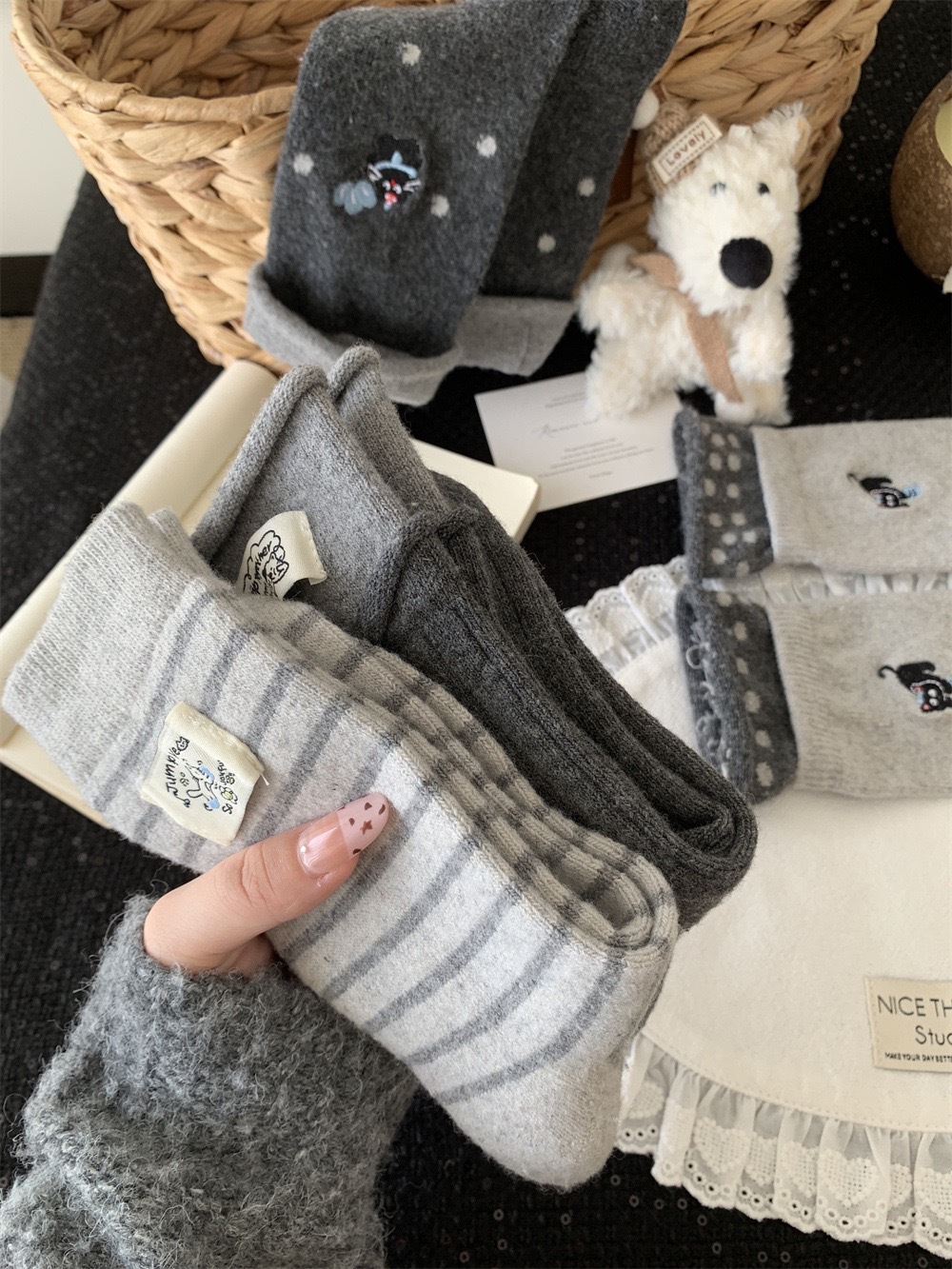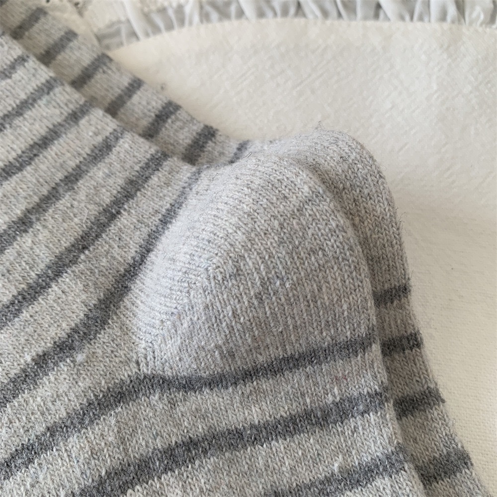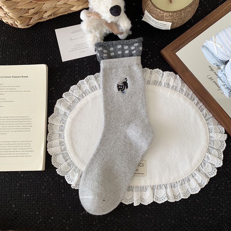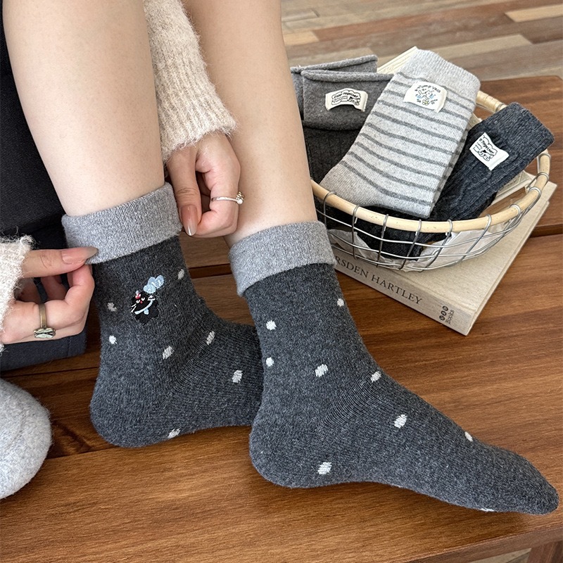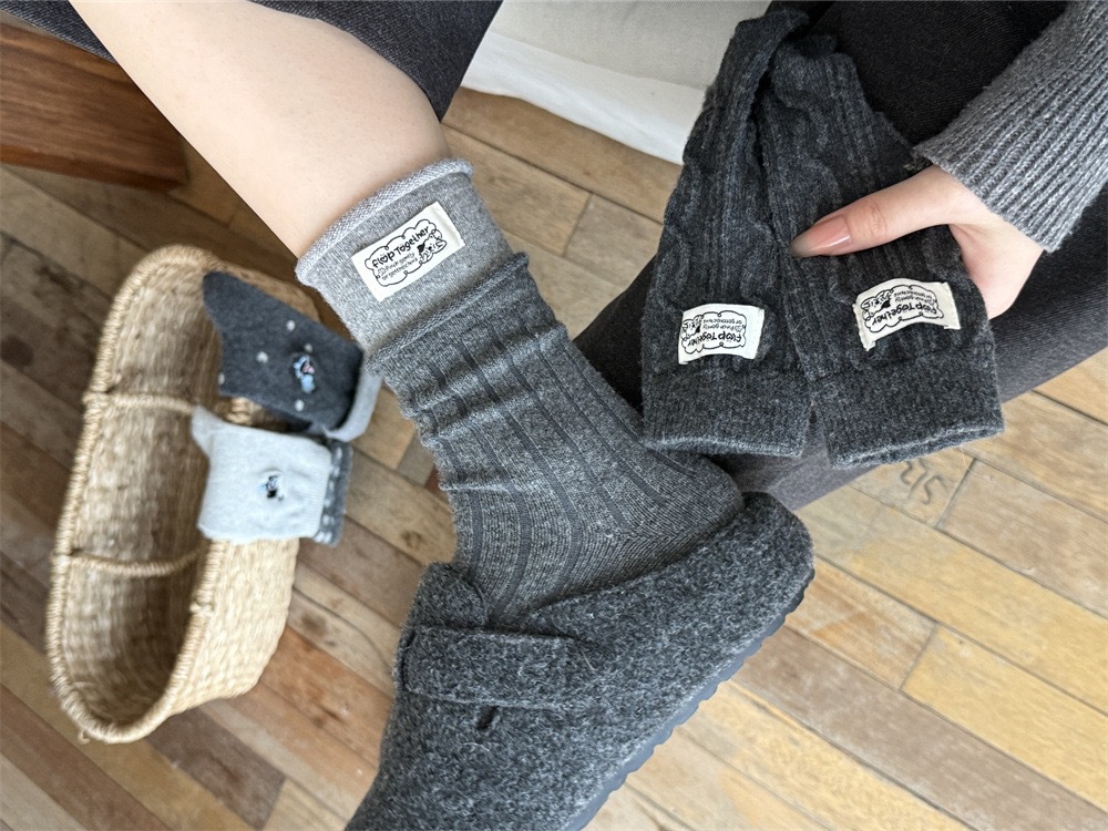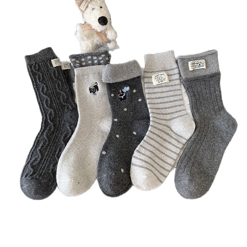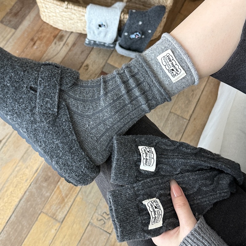秋冬灰系保暖袜子女袜ins韩系条纹布标费尔岛猫咪羊毛堆堆袜袜子