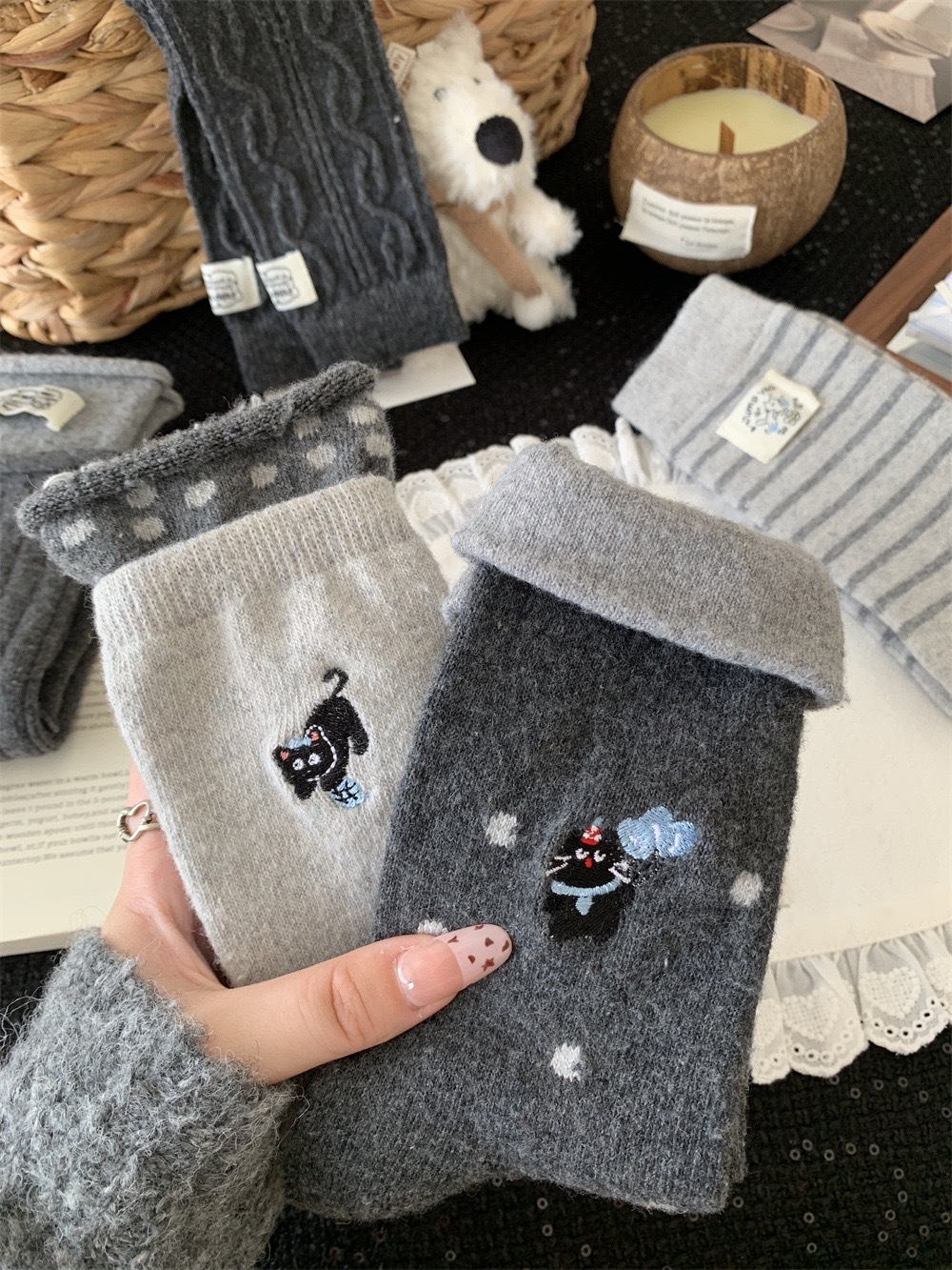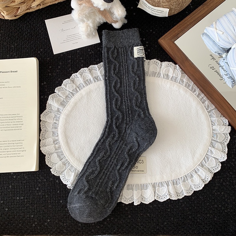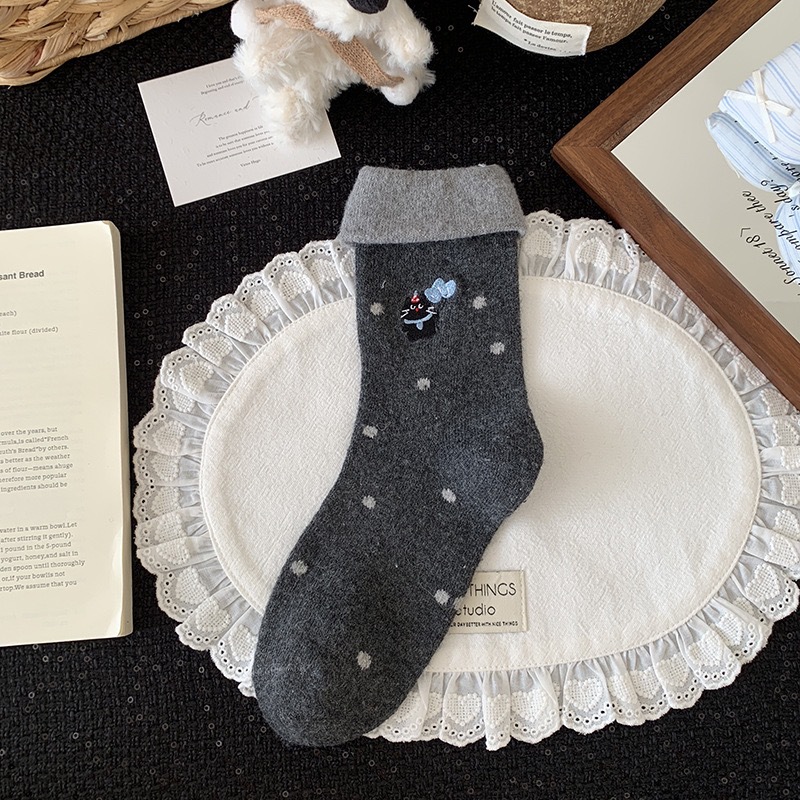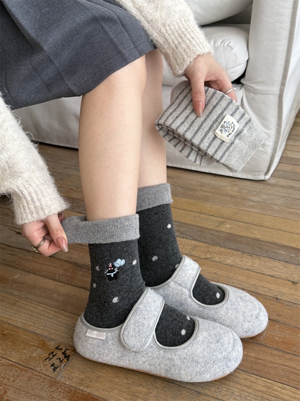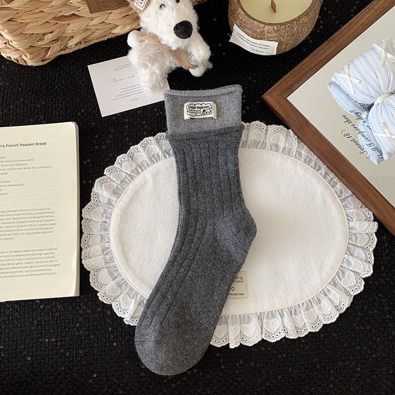 秋冬灰系保暖袜子女袜ins韩系条纹布标费尔岛猫咪羊毛堆堆袜袜子