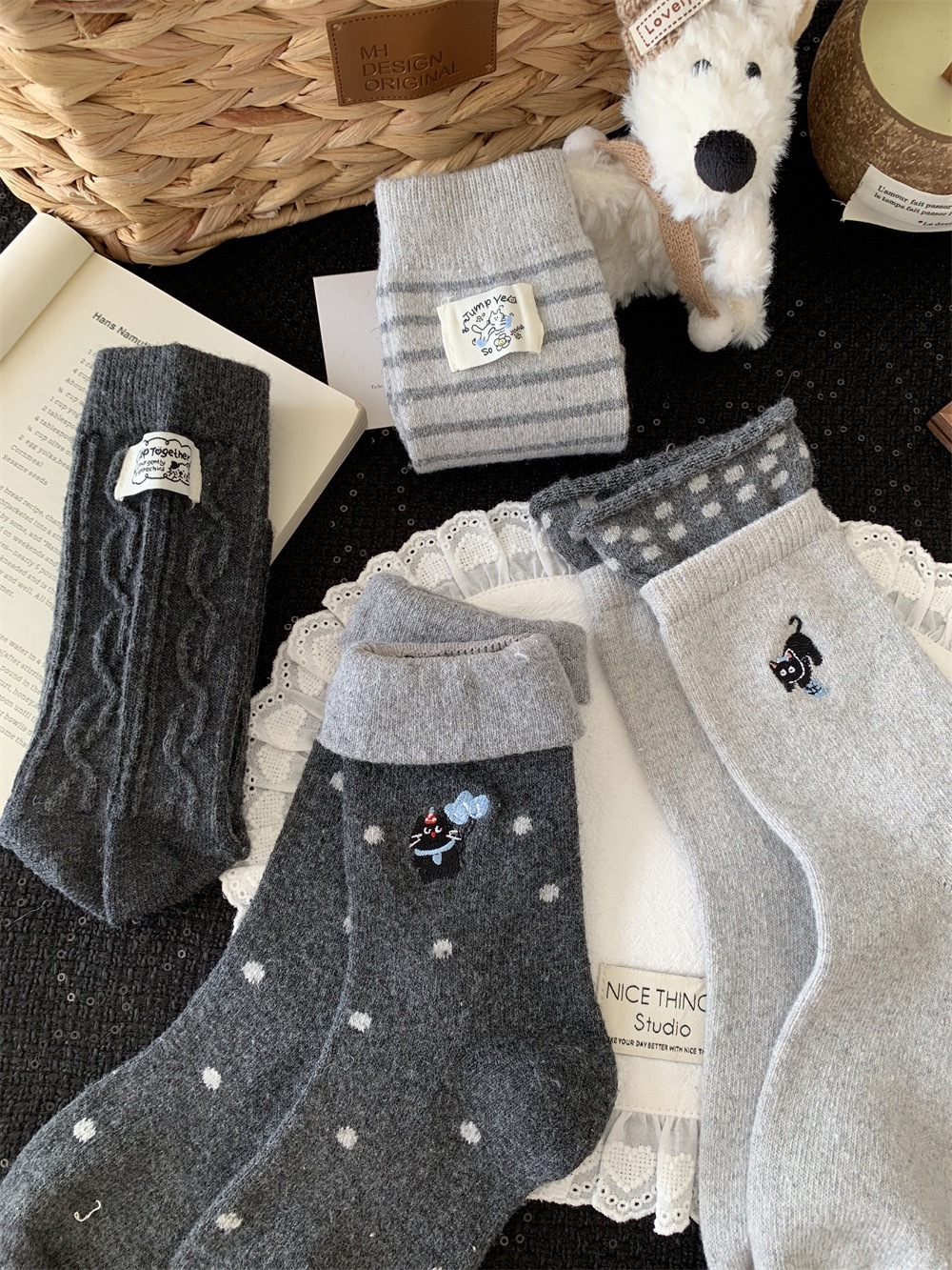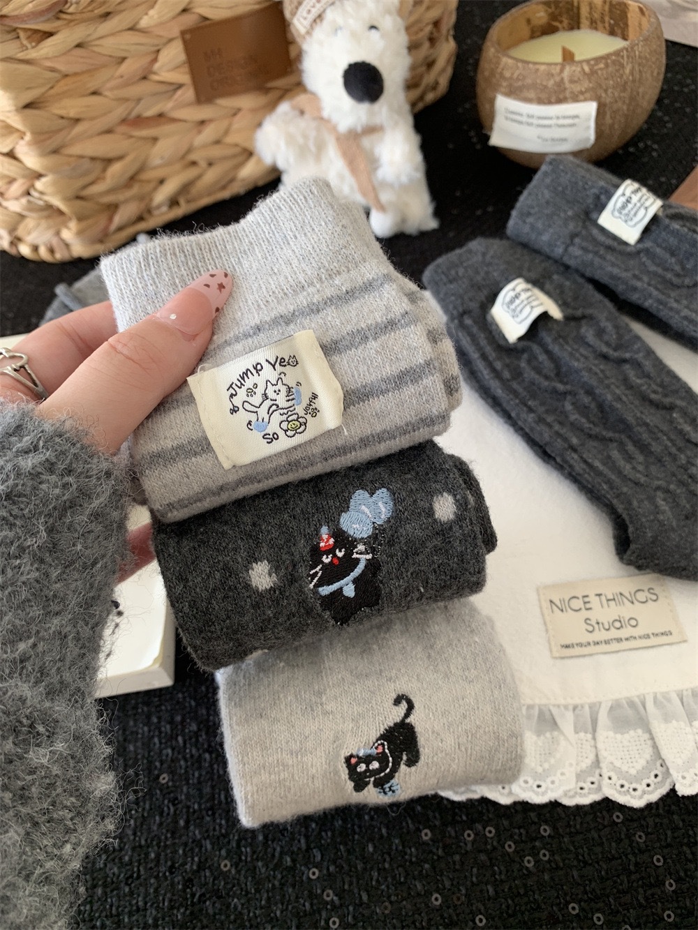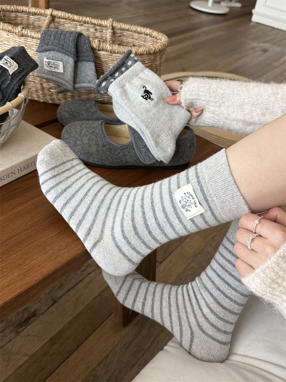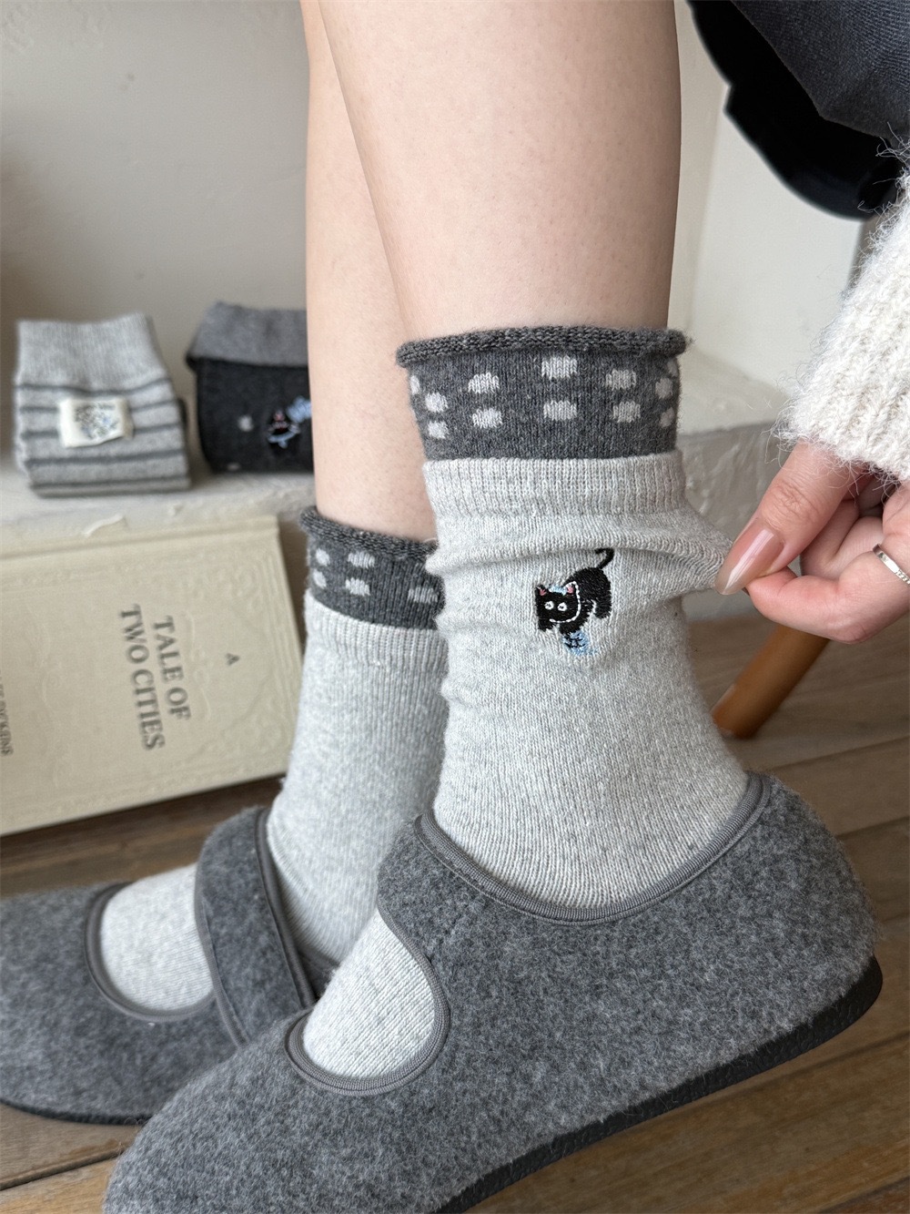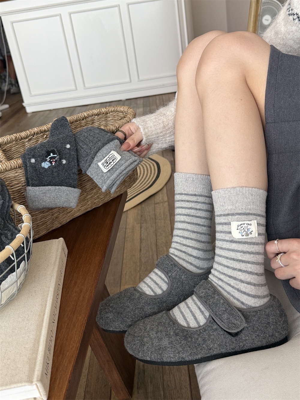 秋冬灰系保暖袜子女袜ins韩系条纹布标费尔岛猫咪羊毛堆堆袜袜子
