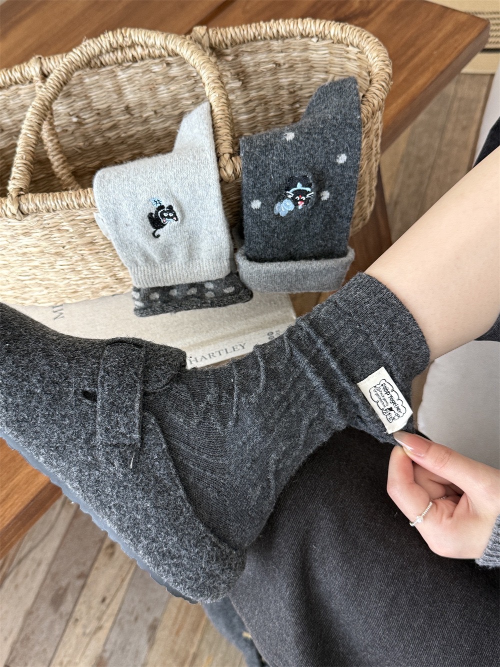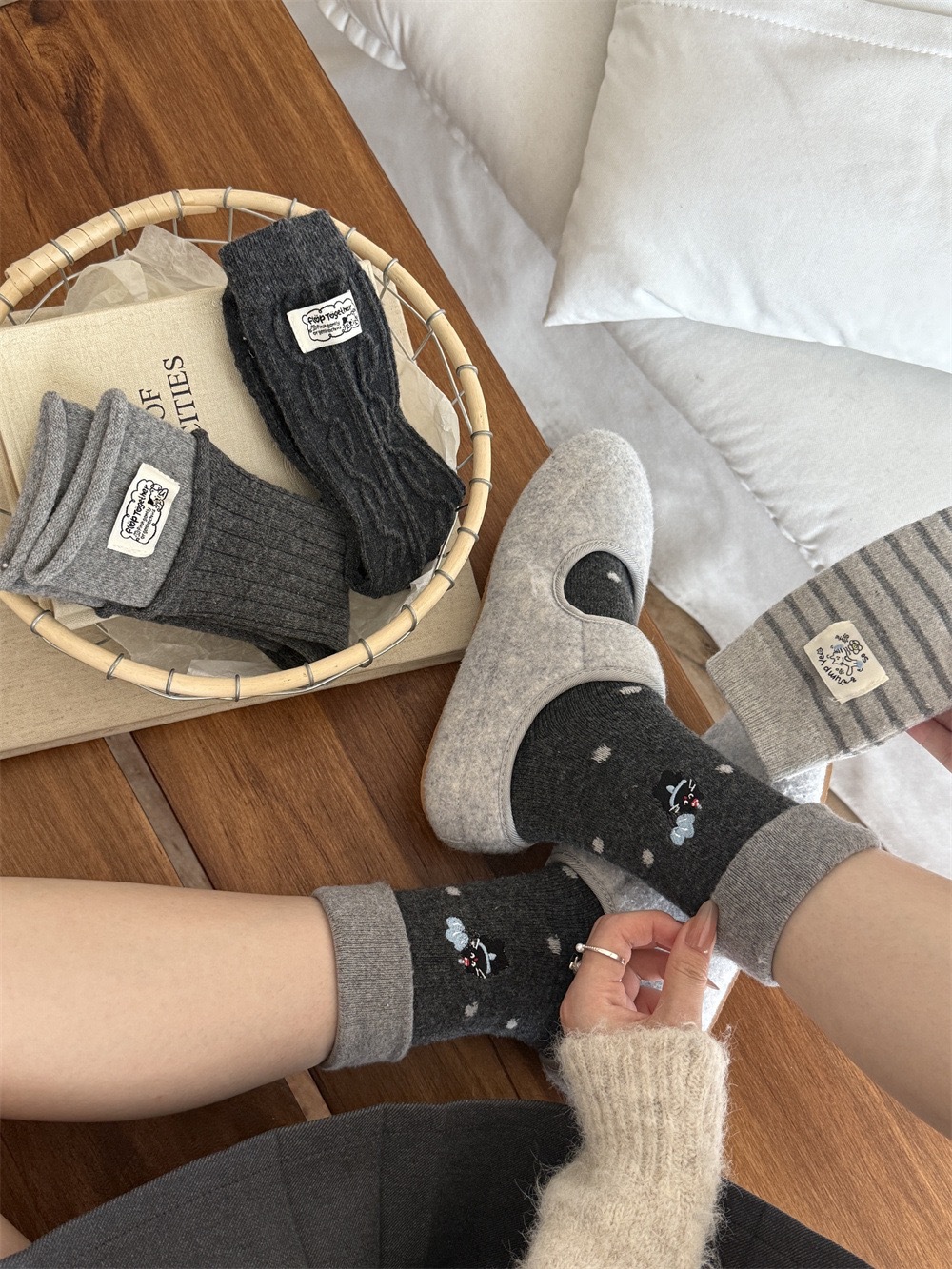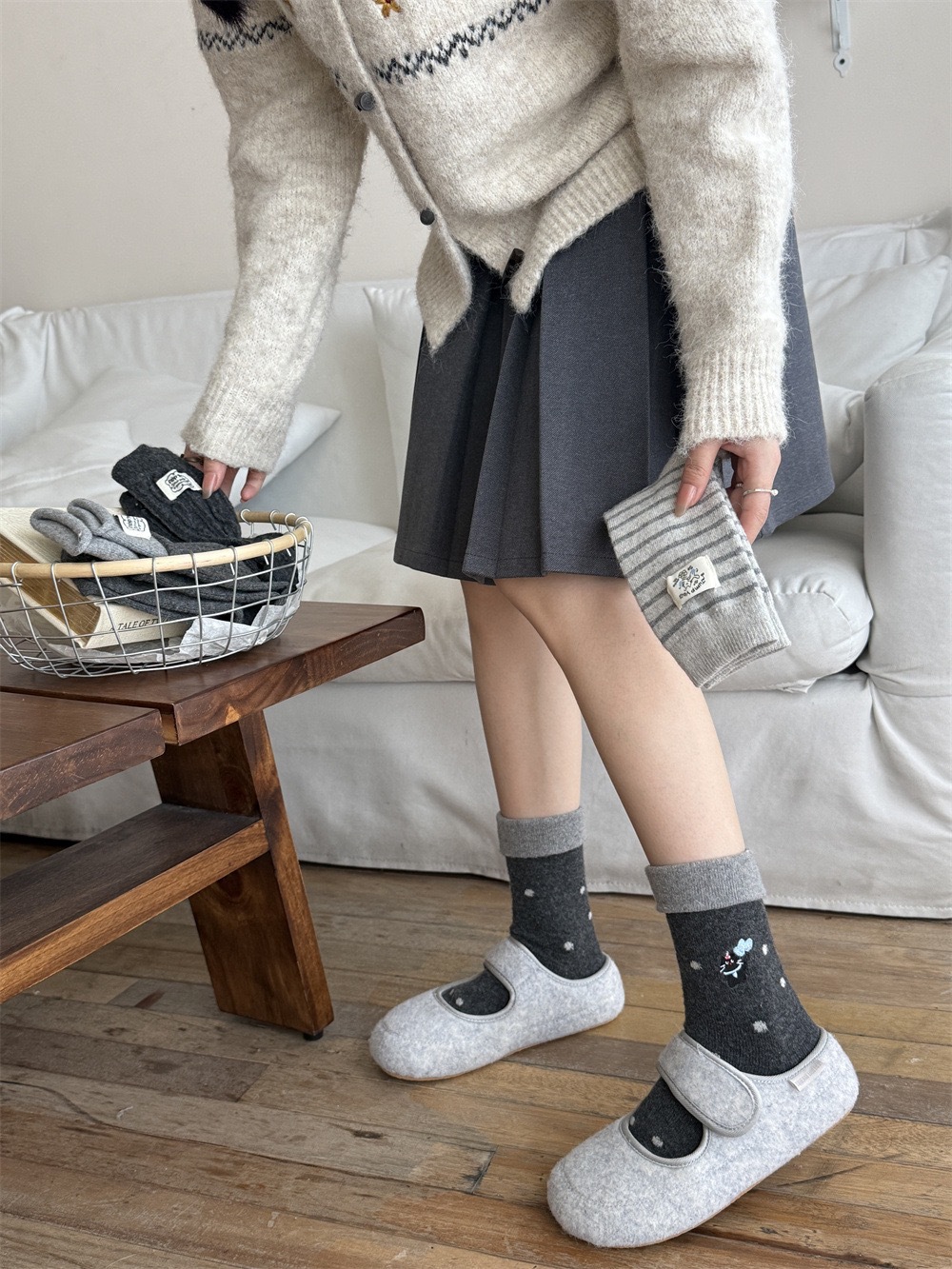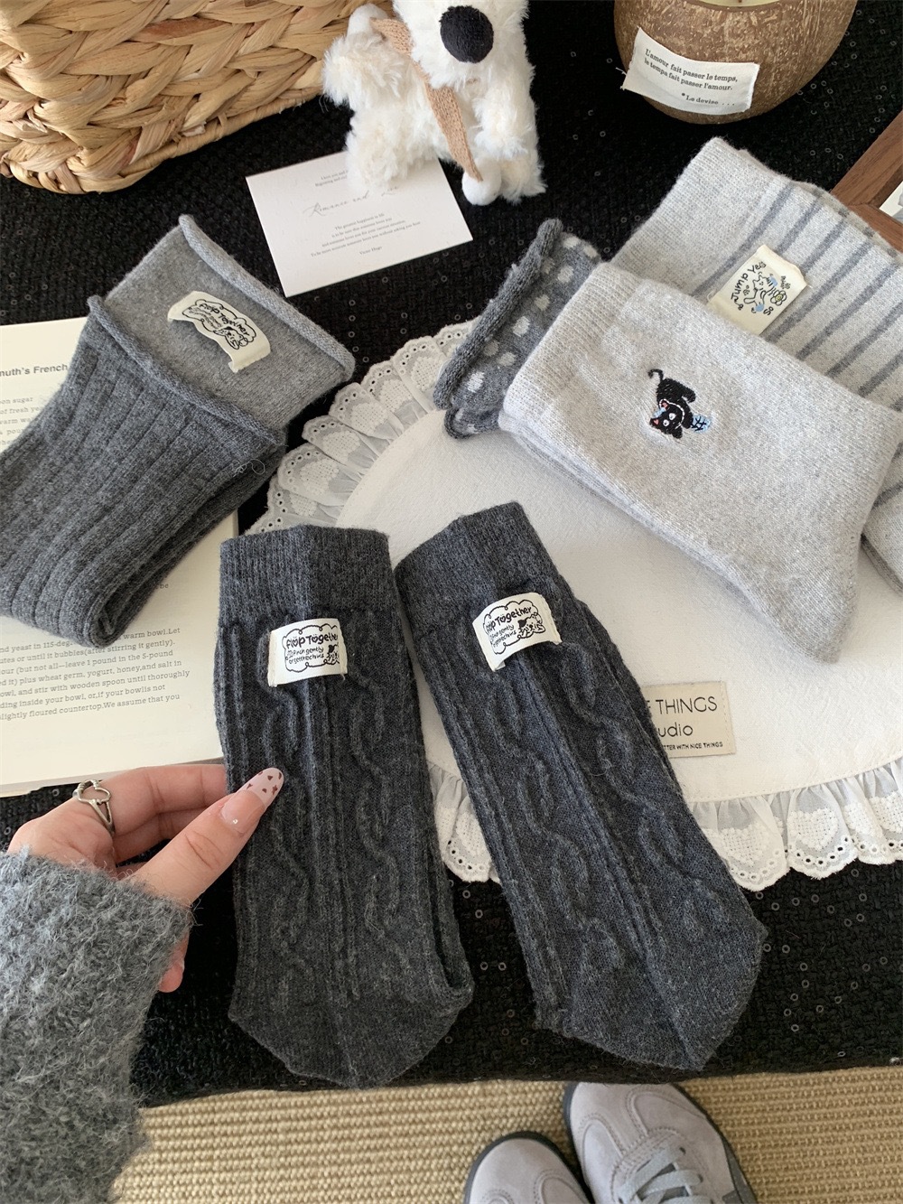 秋冬灰系保暖袜子女袜ins韩系条纹布标费尔岛猫咪羊毛堆堆袜袜子