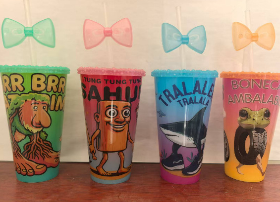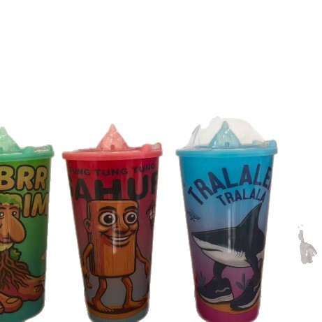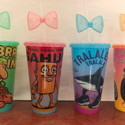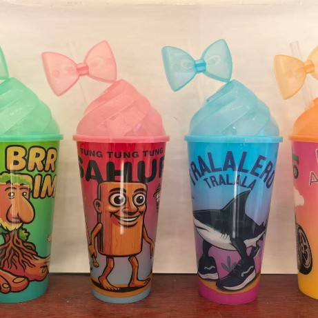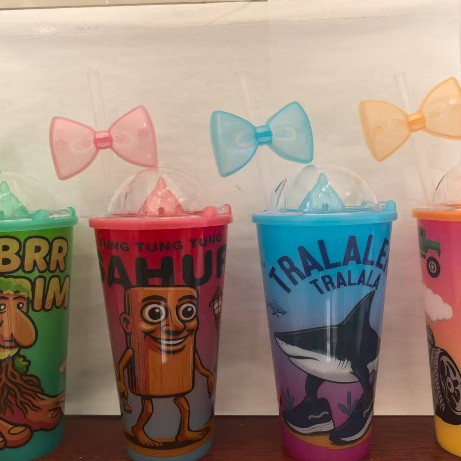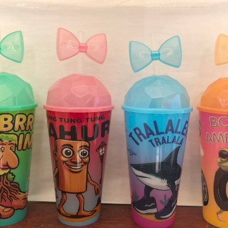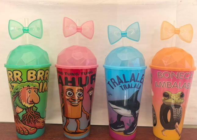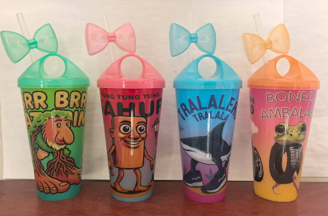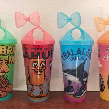 2025新款塑料吸管杯蝴蝶结榨汁杯饮料杯带吸管东南亚批发山海经款