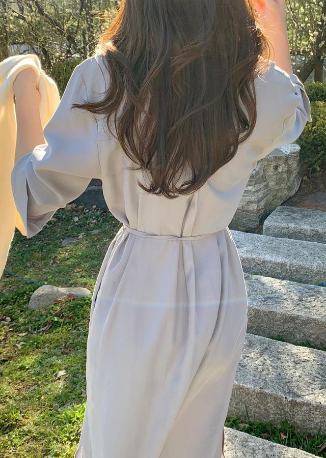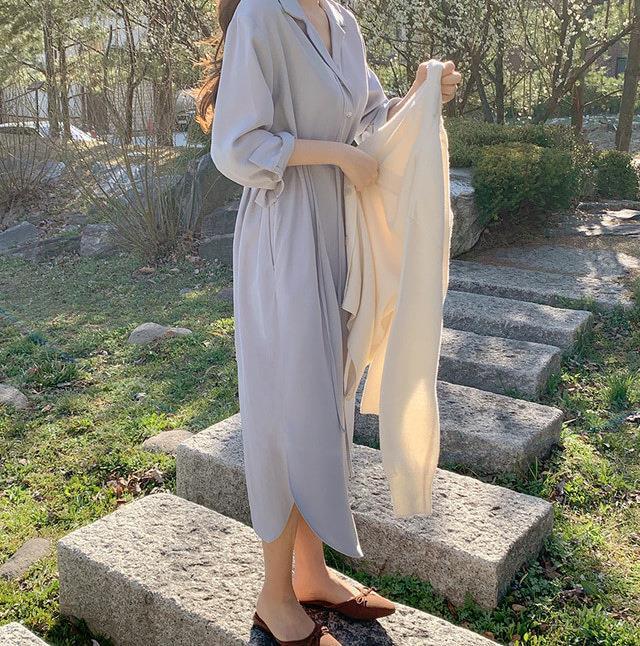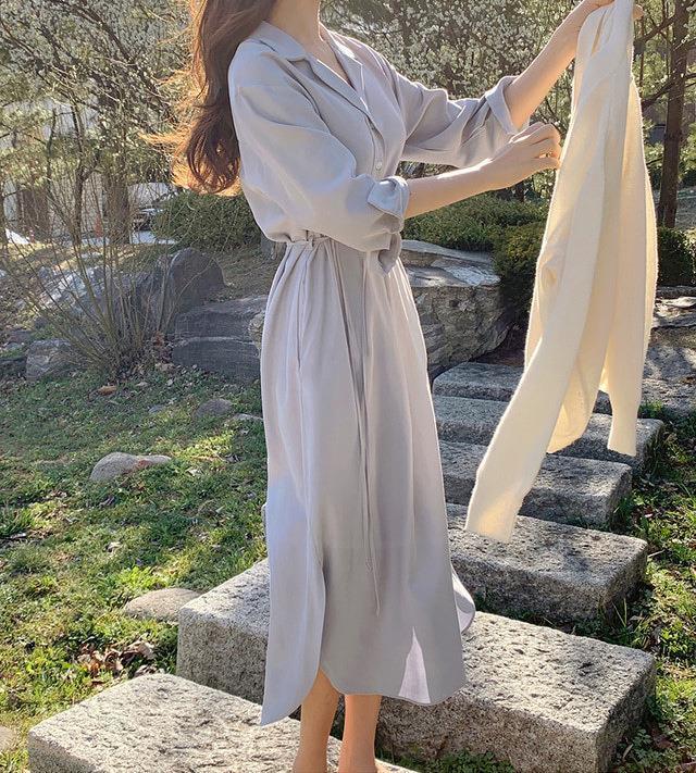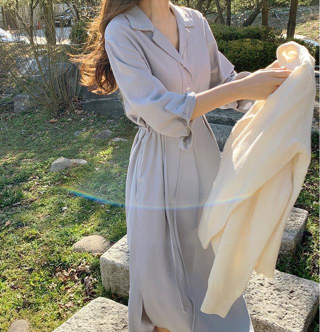 韩国chic极简主义 百搭翻领单排扣系带收腰下摆开叉衬衫连衣裙女