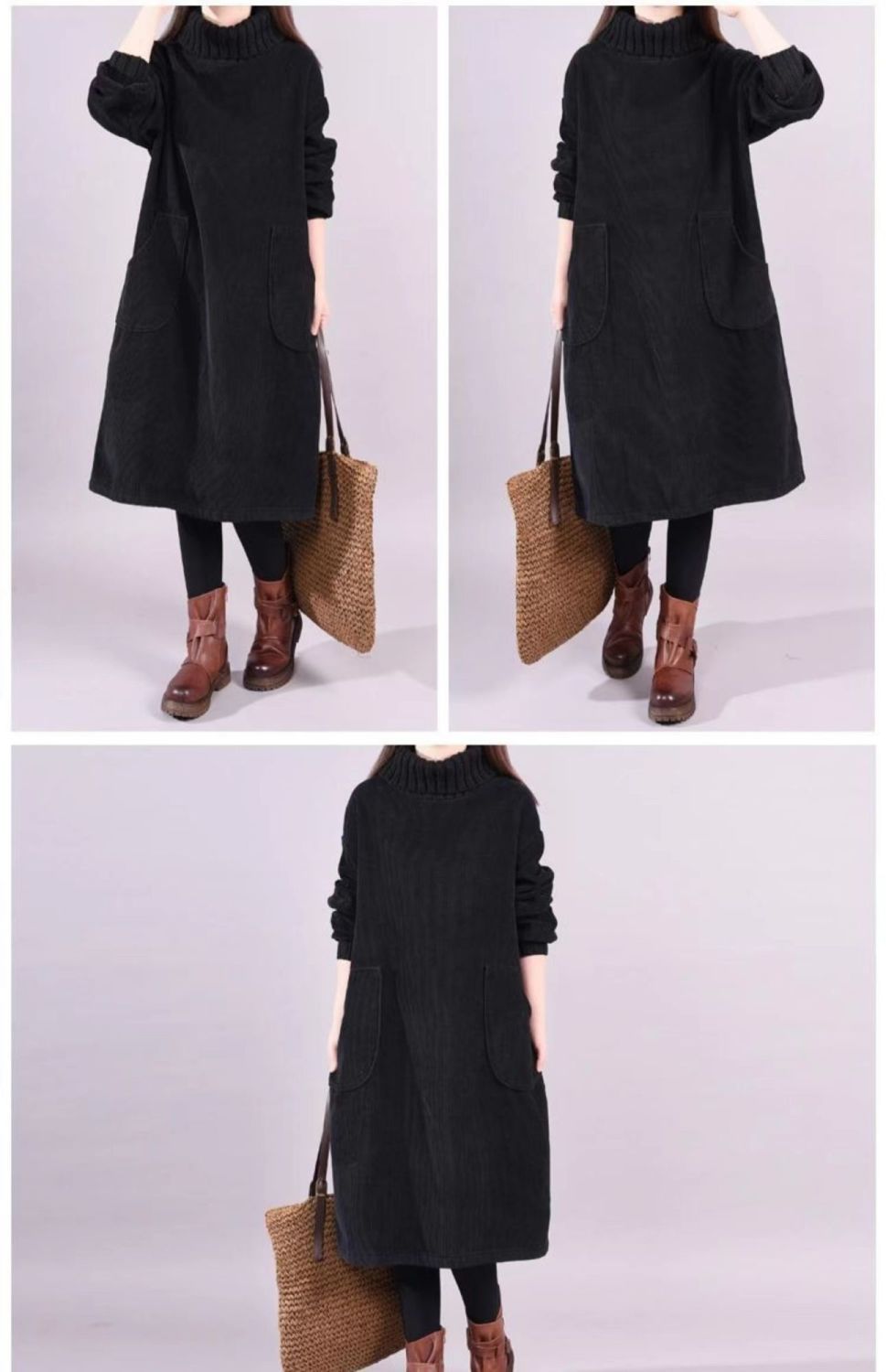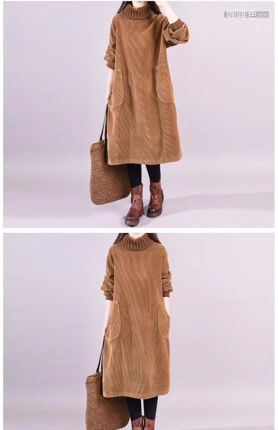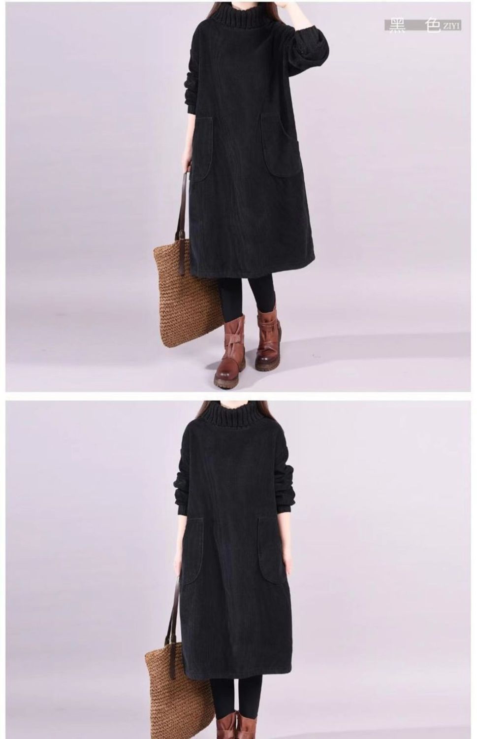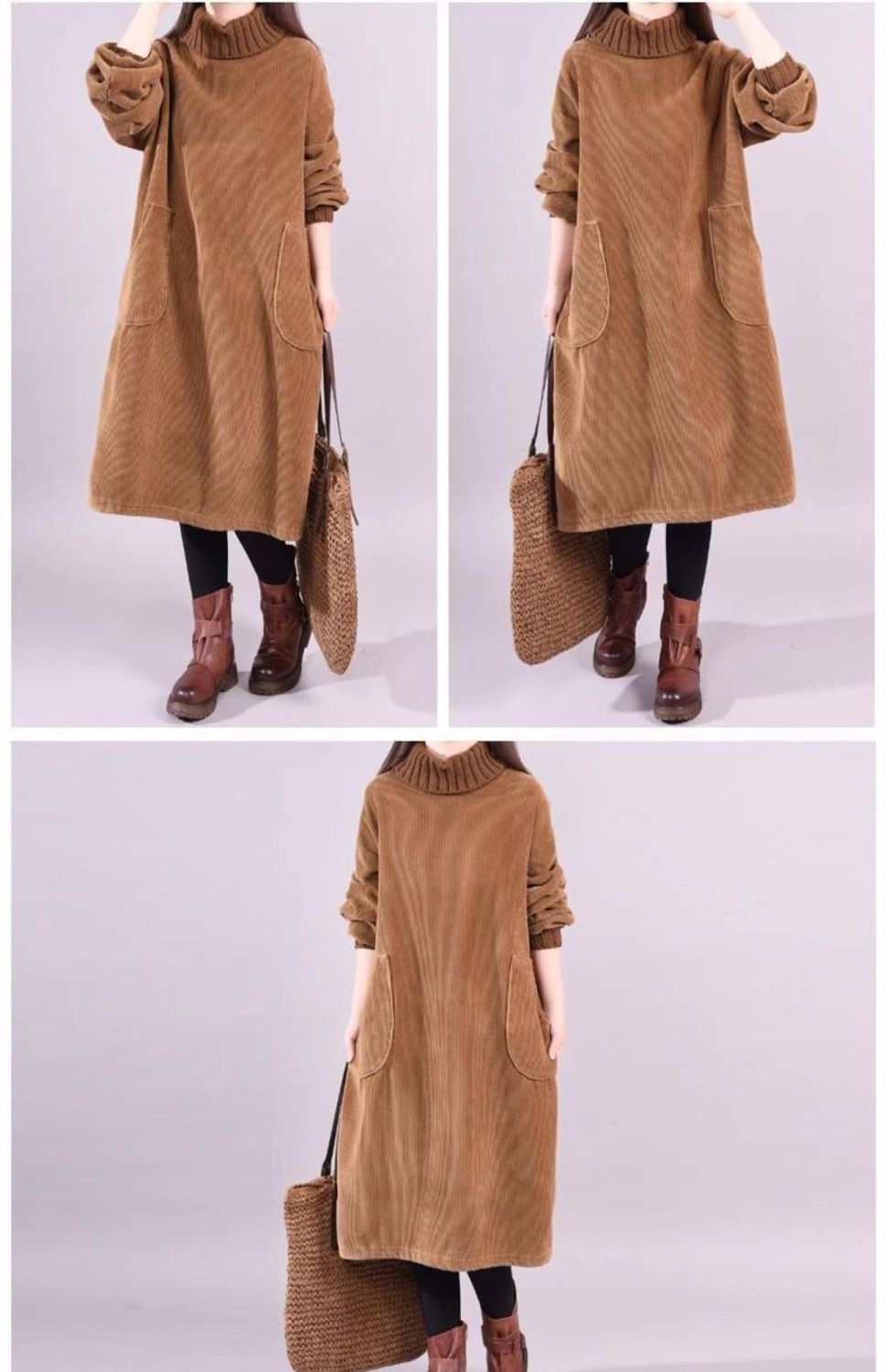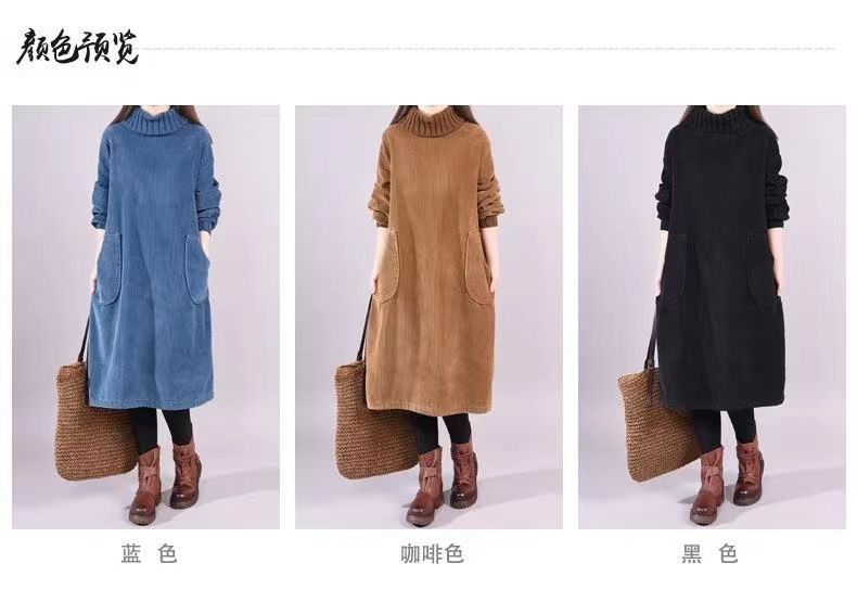 特大码300斤高领条绒加绒加厚中长灯芯绒连衣裙