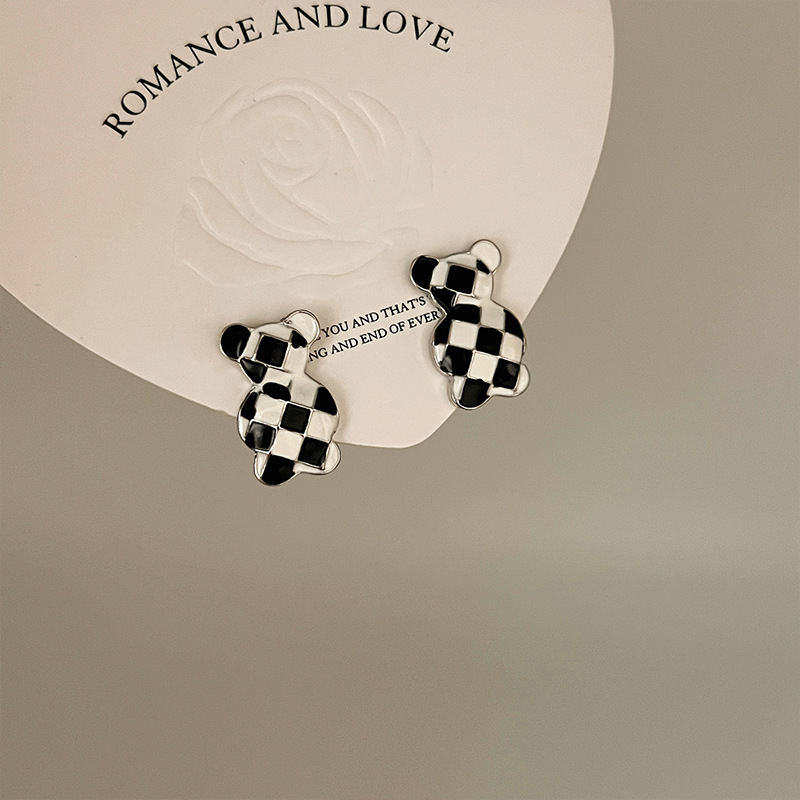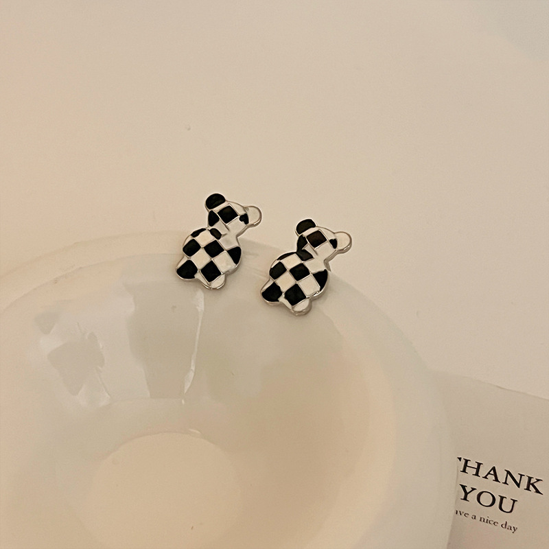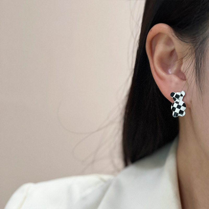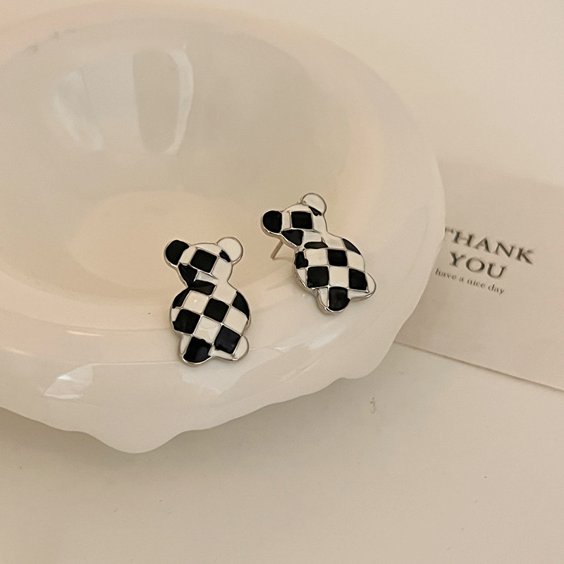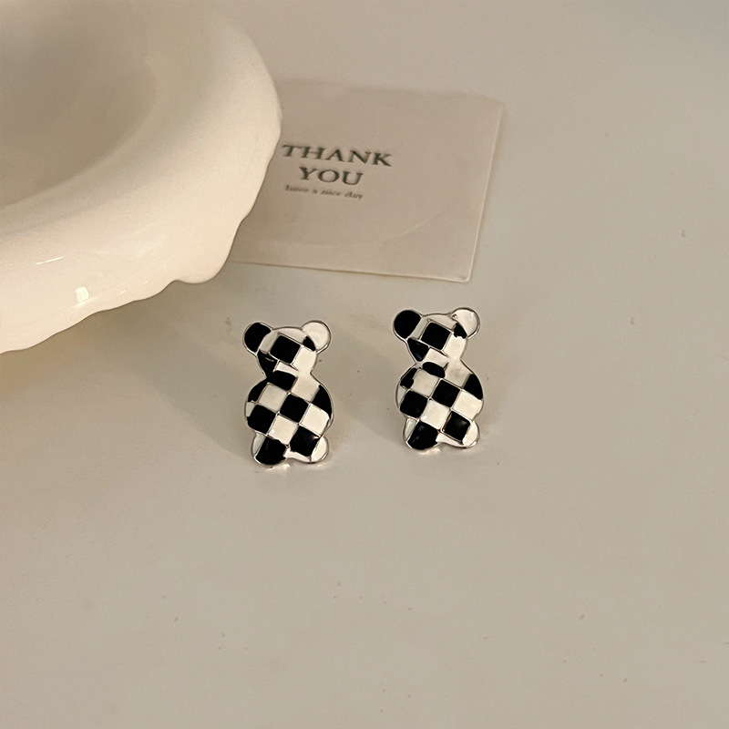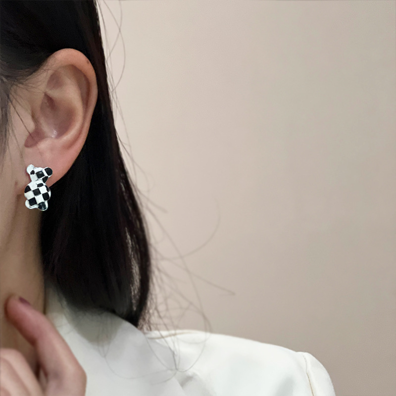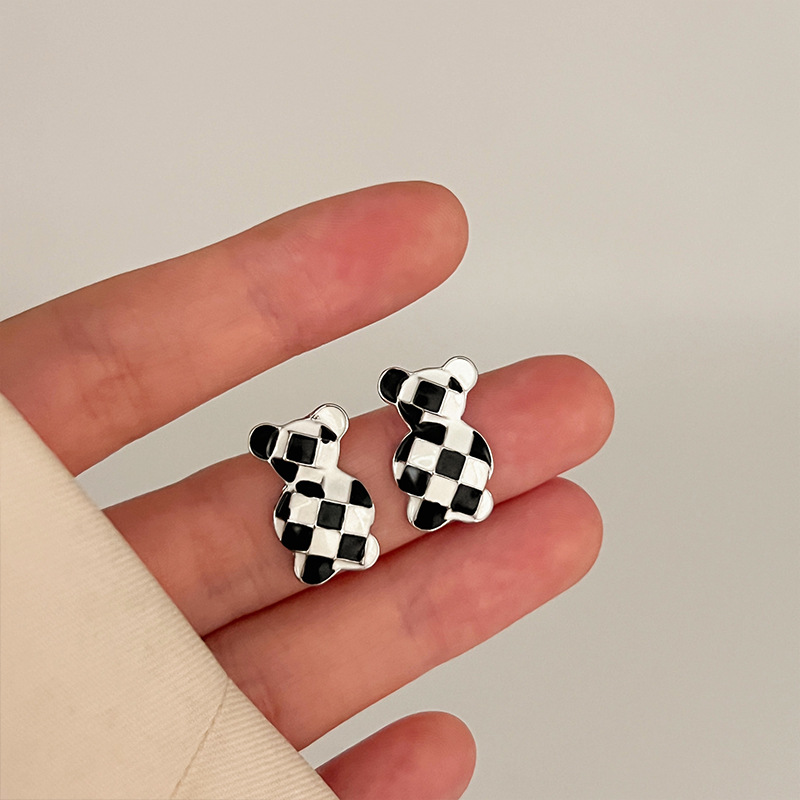925银针黑白棋盘格可爱小熊耳环女秋冬ins风气质耳钉2023年新款潮