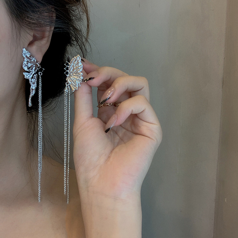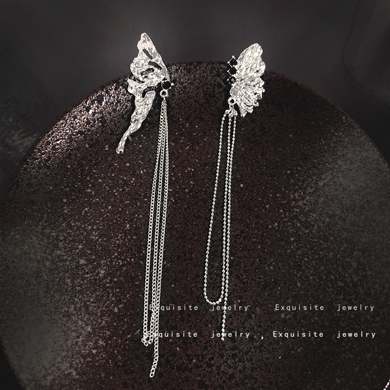 ins冷淡风金属褶皱高级感精灵流苏链条蝴蝶翅膀耳环925银针