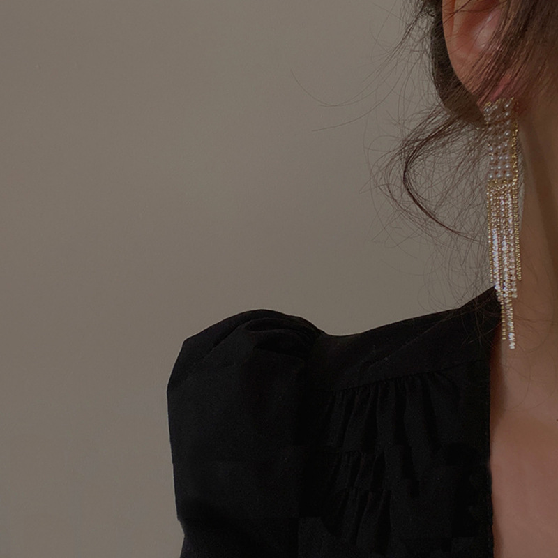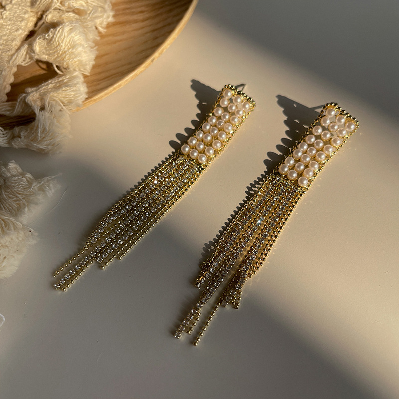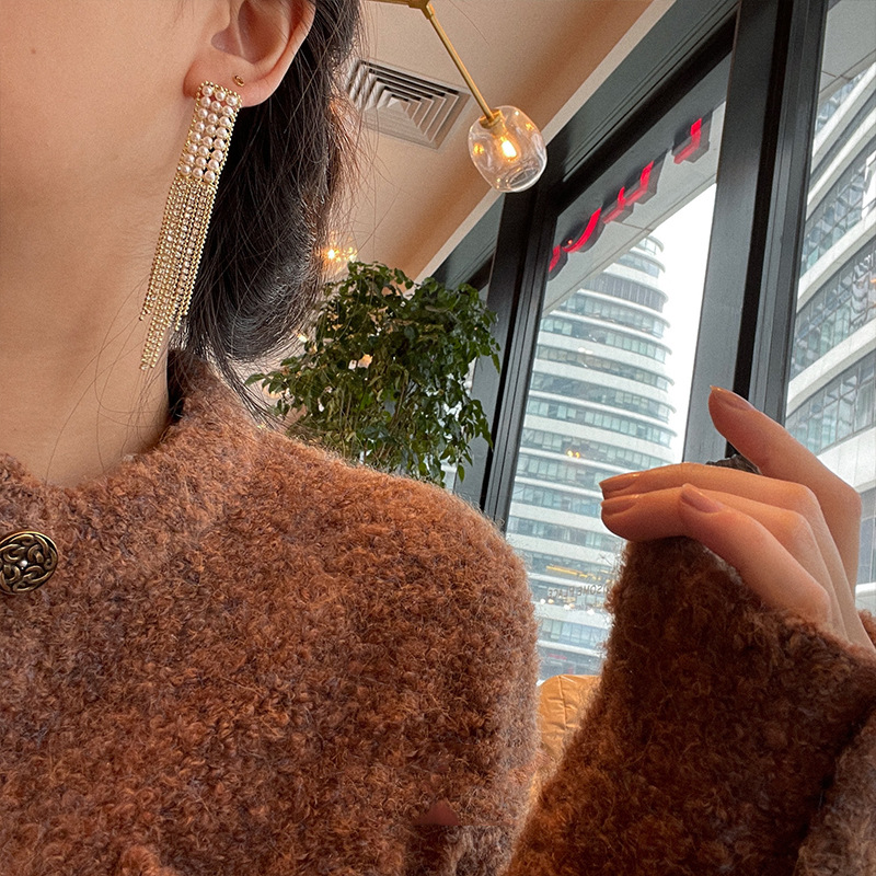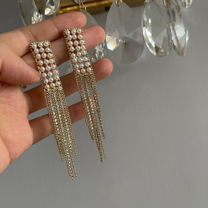 新款串珠长款银针耳坠网红时尚气质百搭金属冷淡in风珍珠流苏耳环
