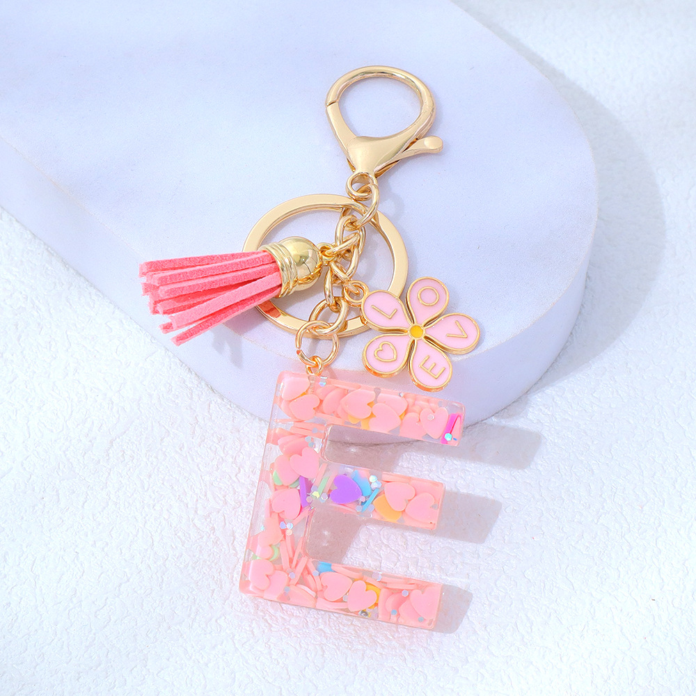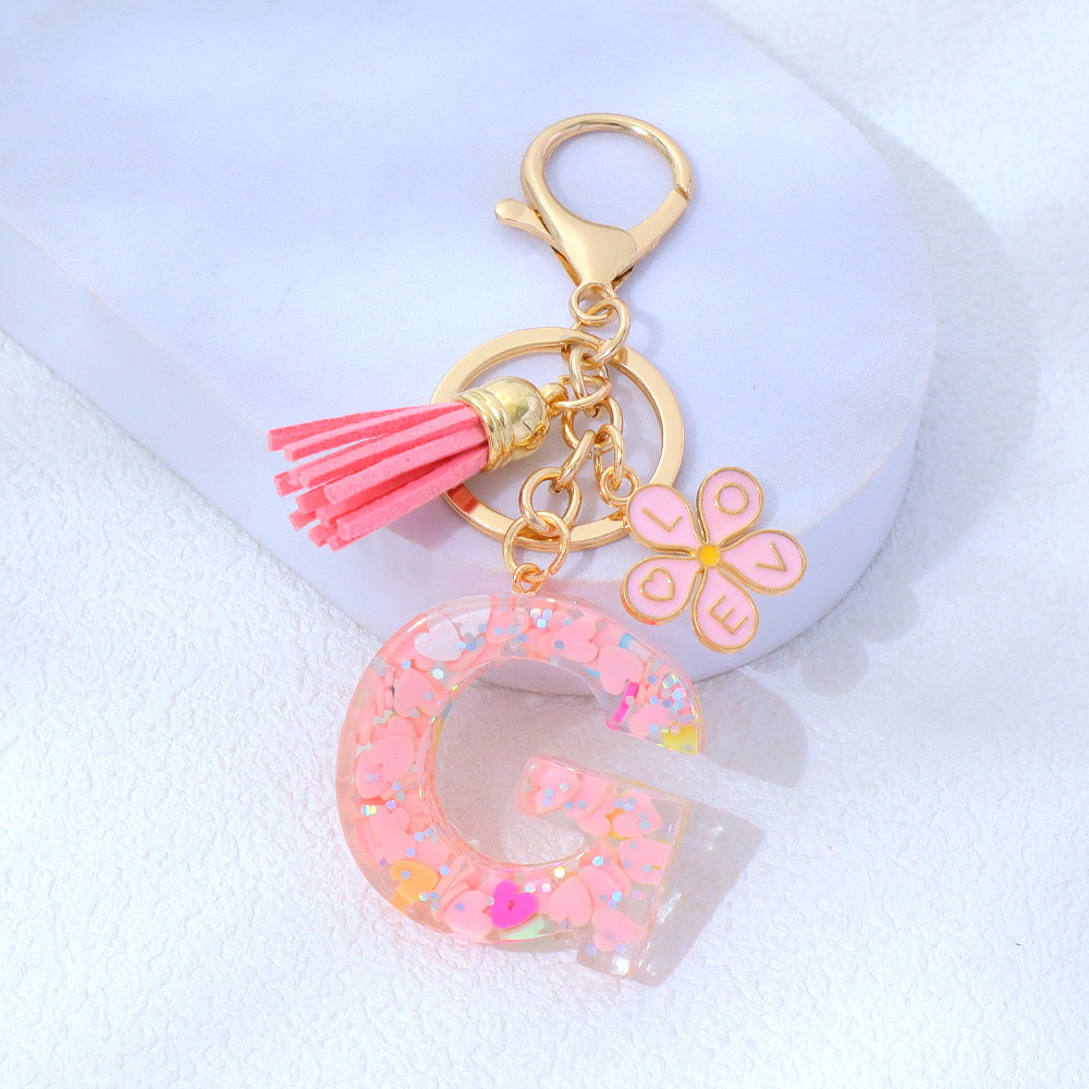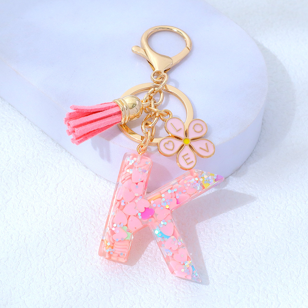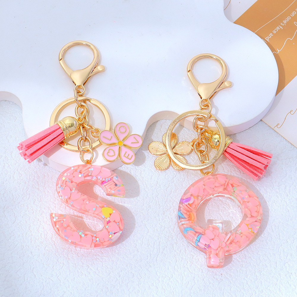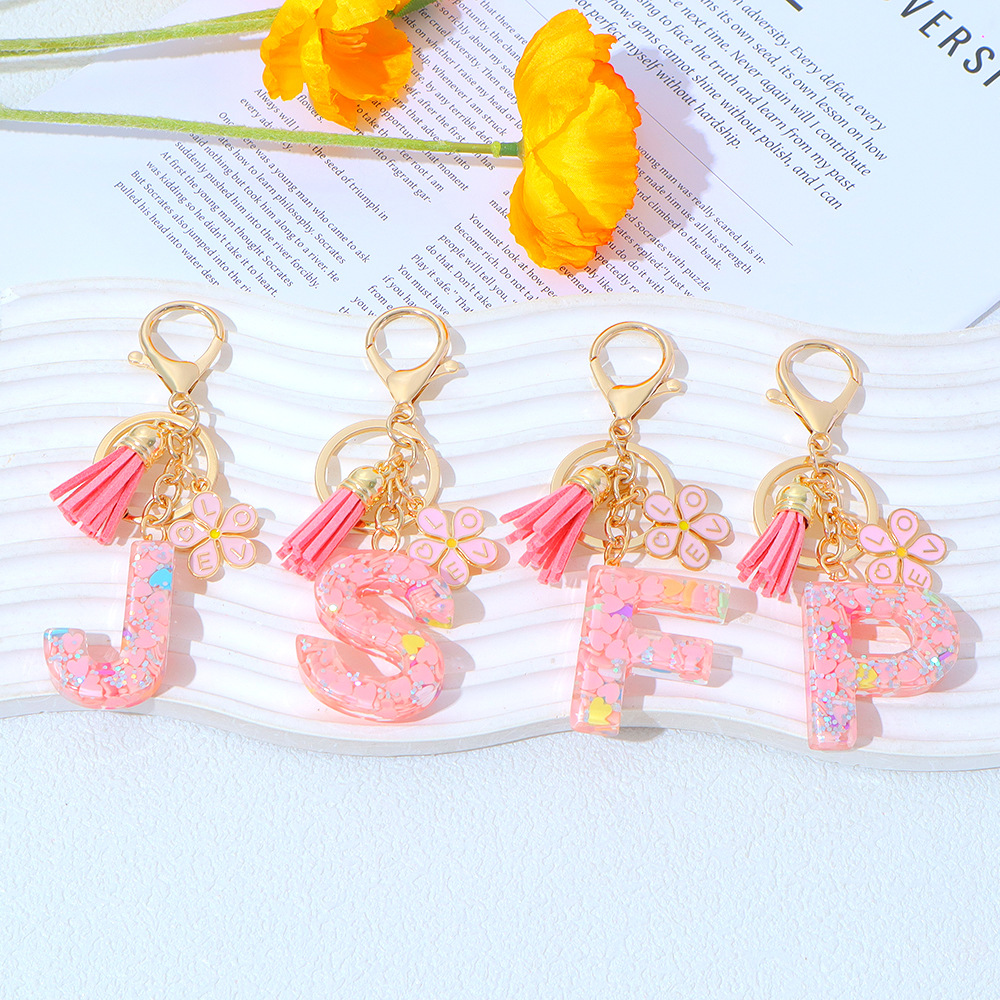 粉色爱心亮片滴胶字母钥匙扣金属小花流苏吊坠女士包包挂件小清新