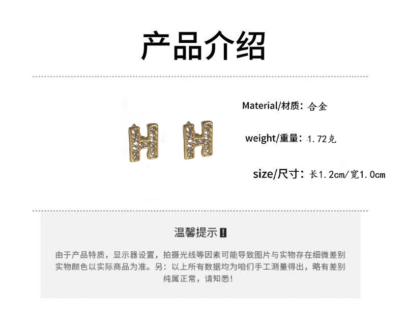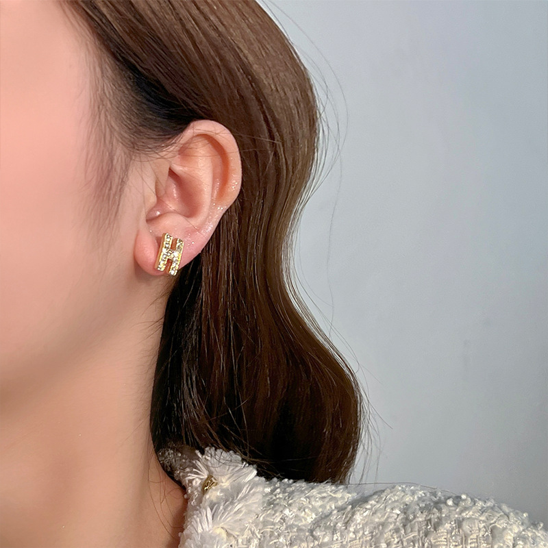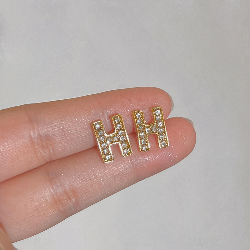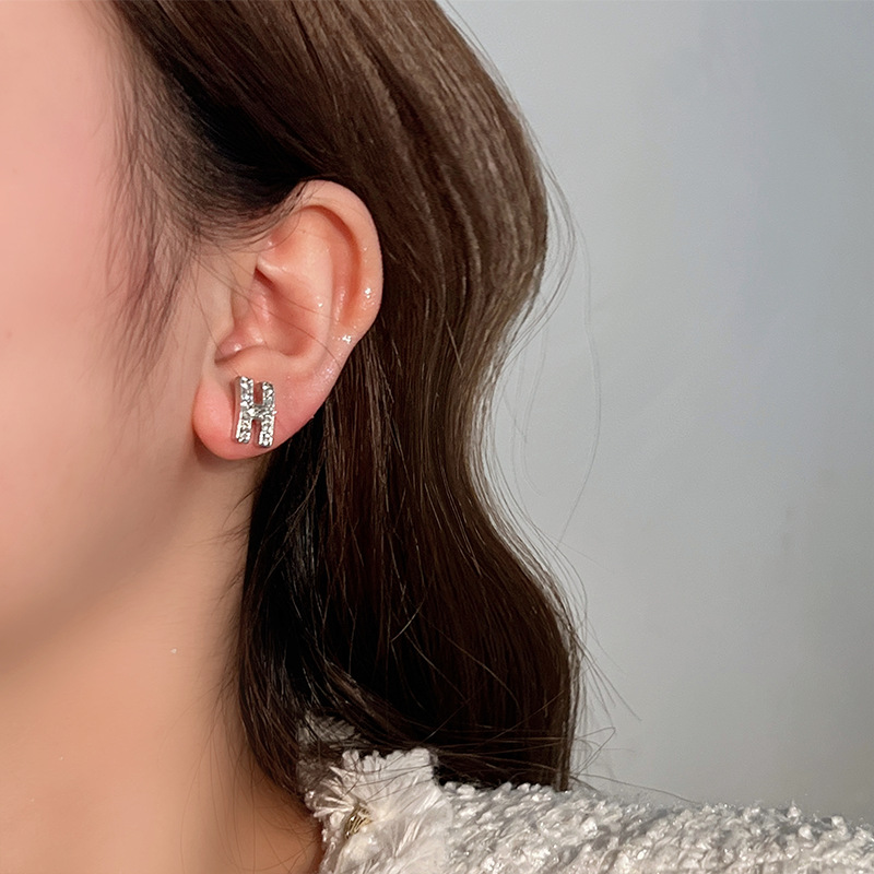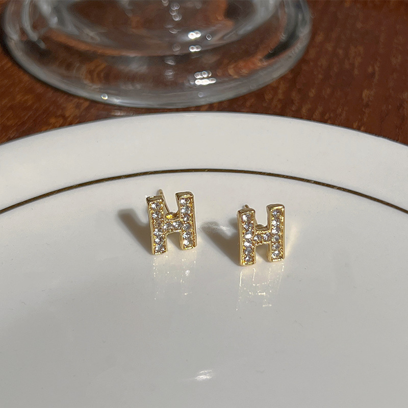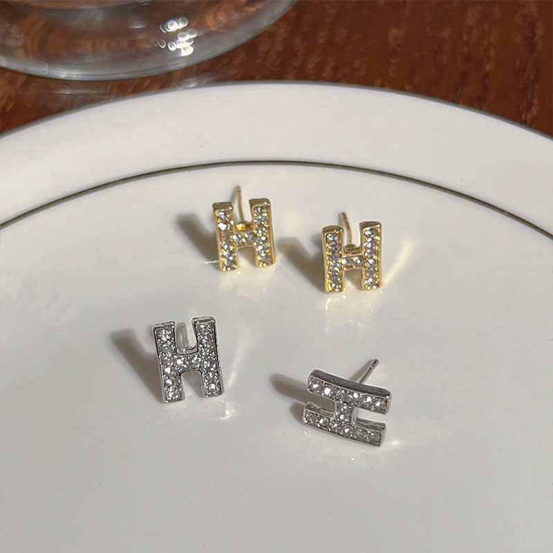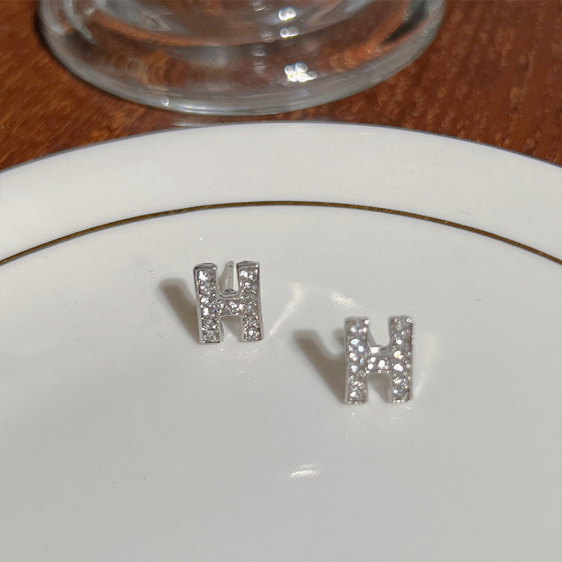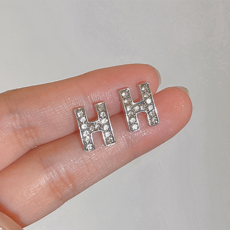 欧美复古闪钻H字母耳钉女时尚气质高级耳饰小众简约百搭镶钻耳环
