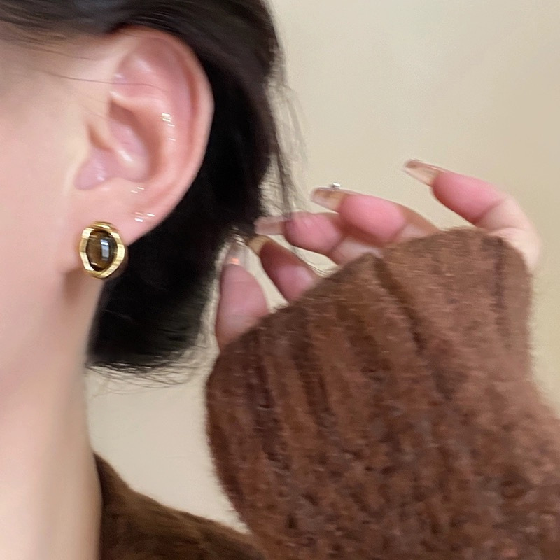 圆形虎眼石美拉德耳钉女秋冬款棕色复古气质耳饰品小众高级感耳环