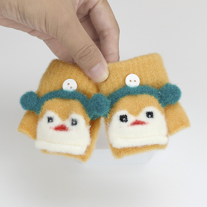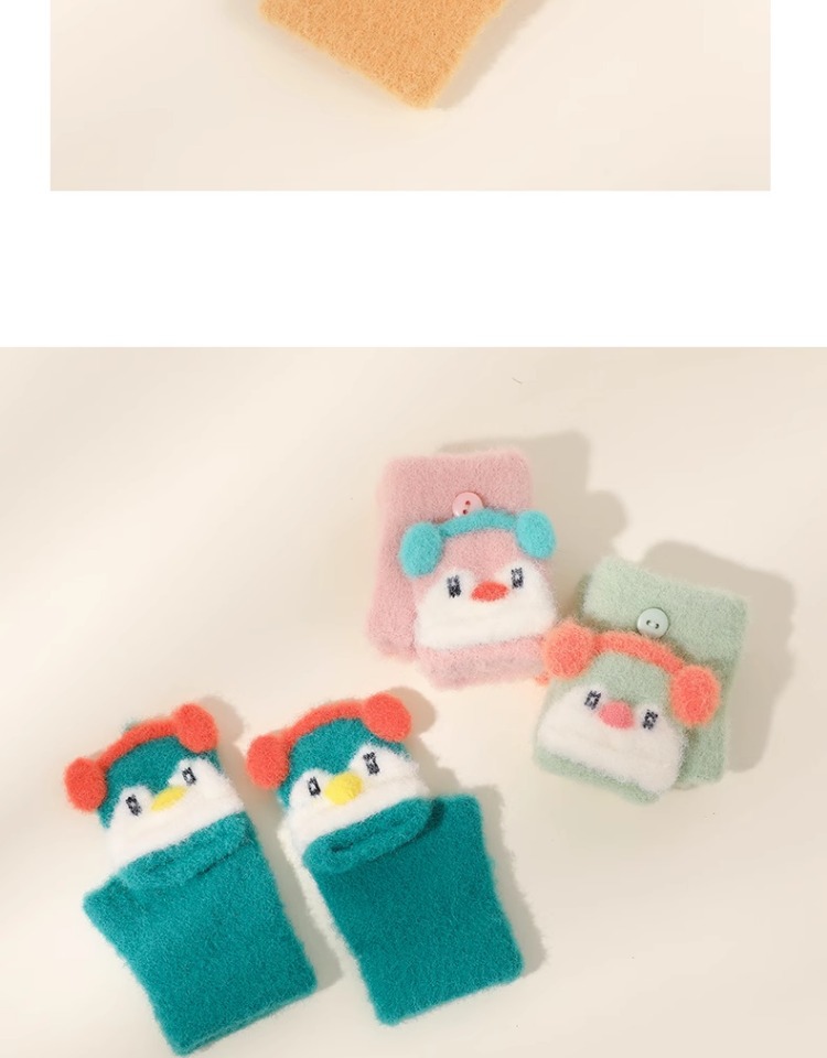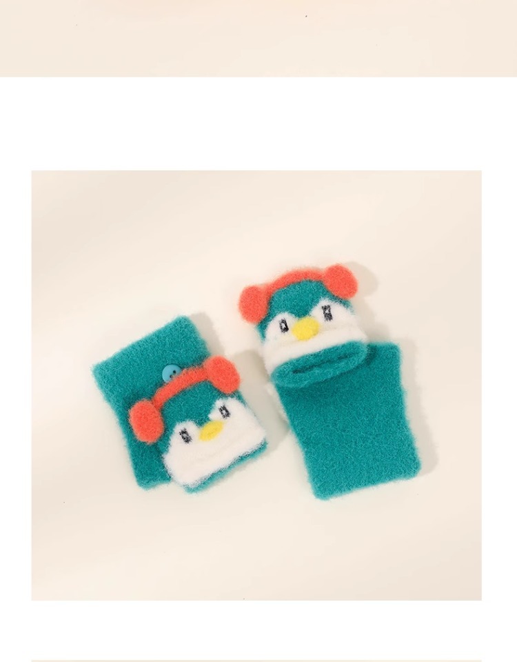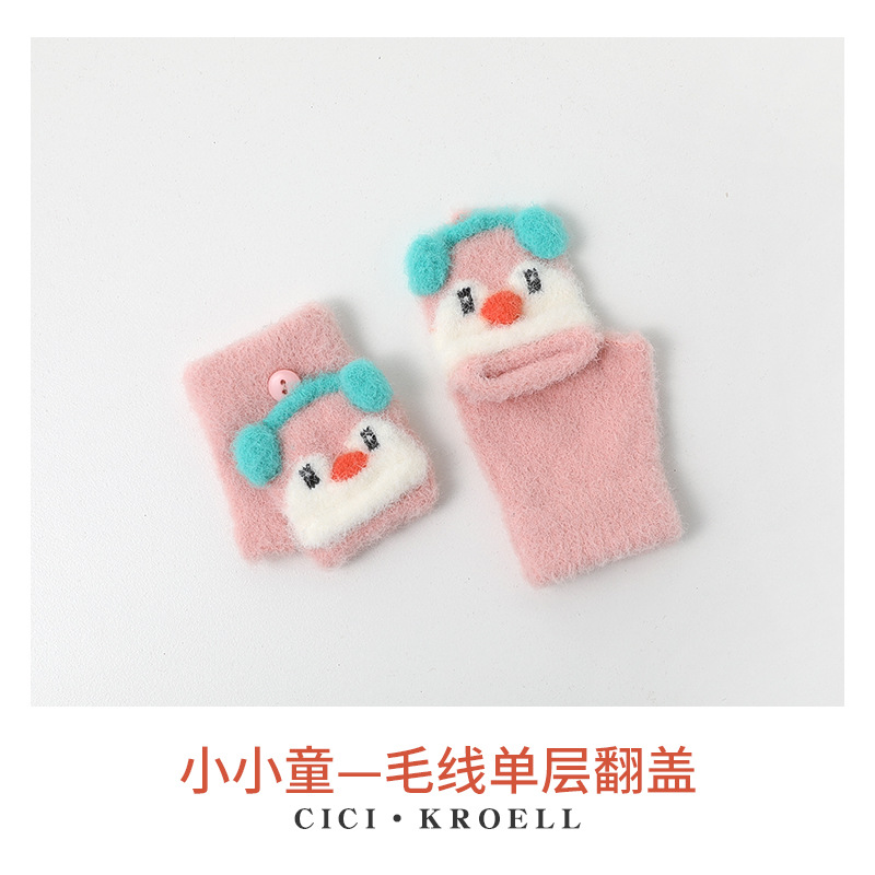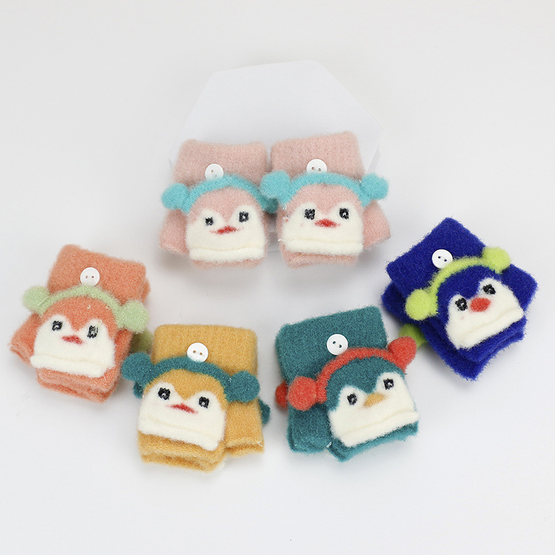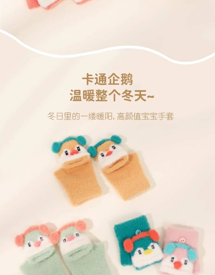 婴幼儿卡通保暖手套秋冬防寒可爱男女宝宝半截露指头音乐企鹅翻盖