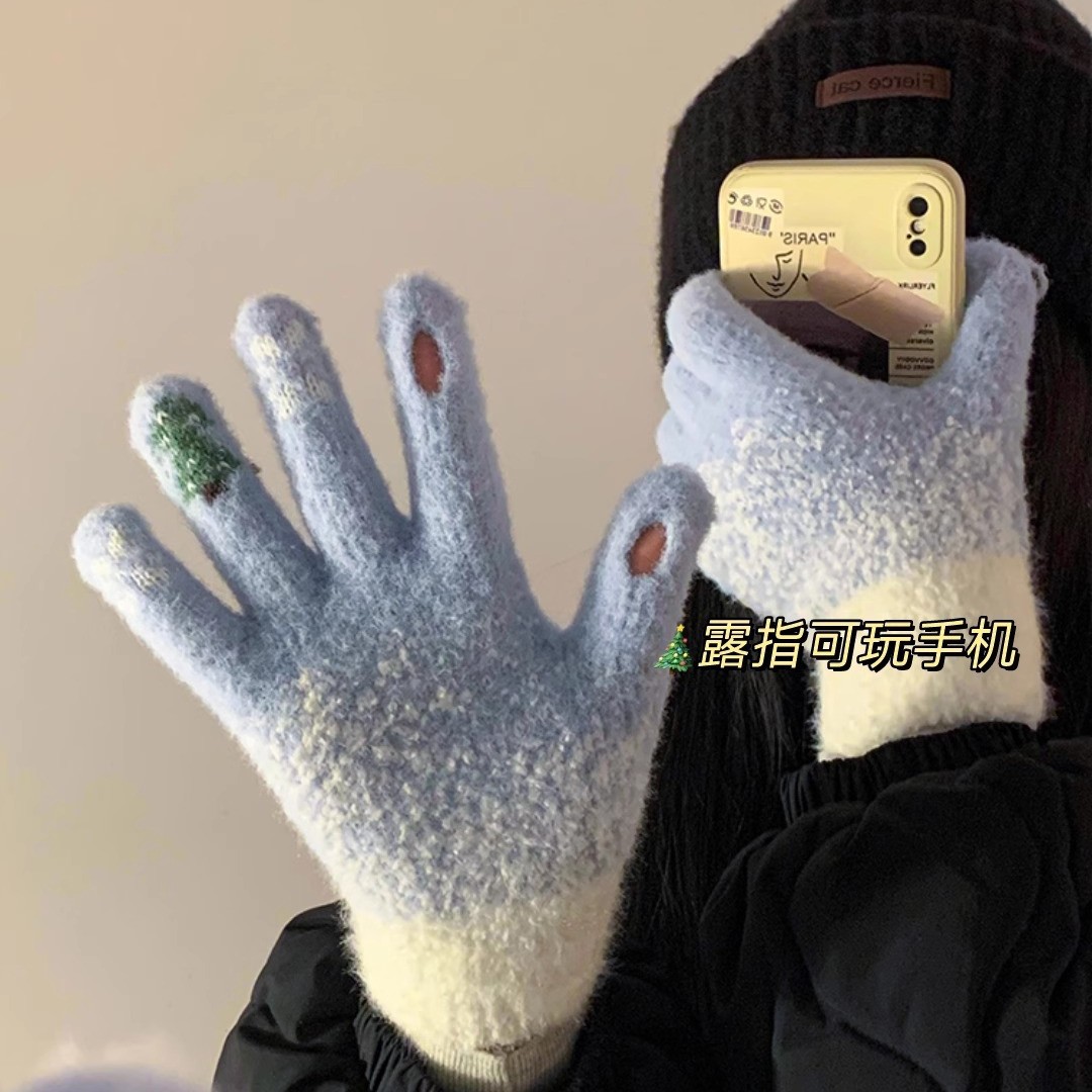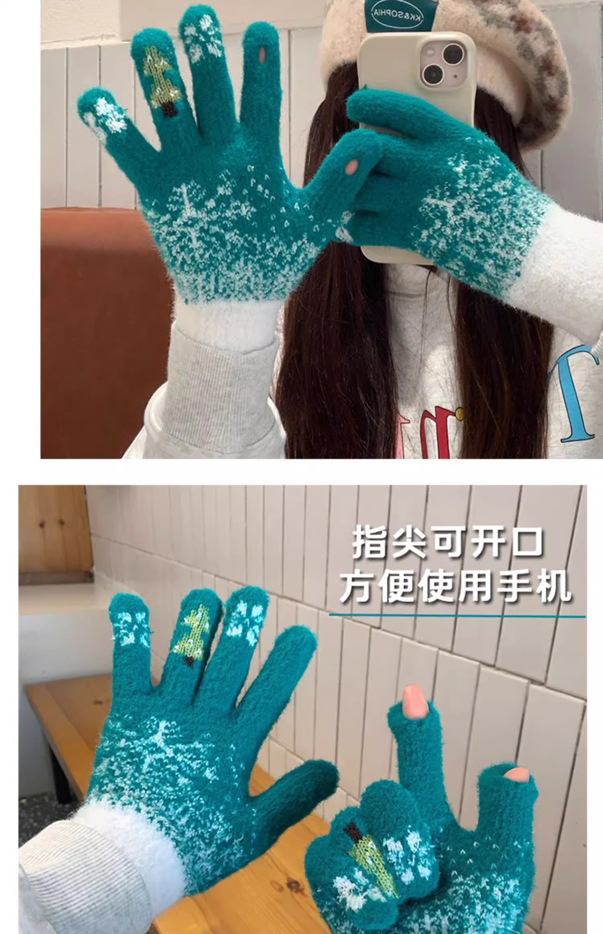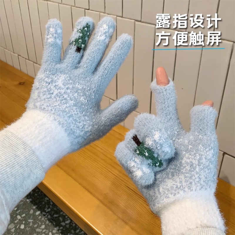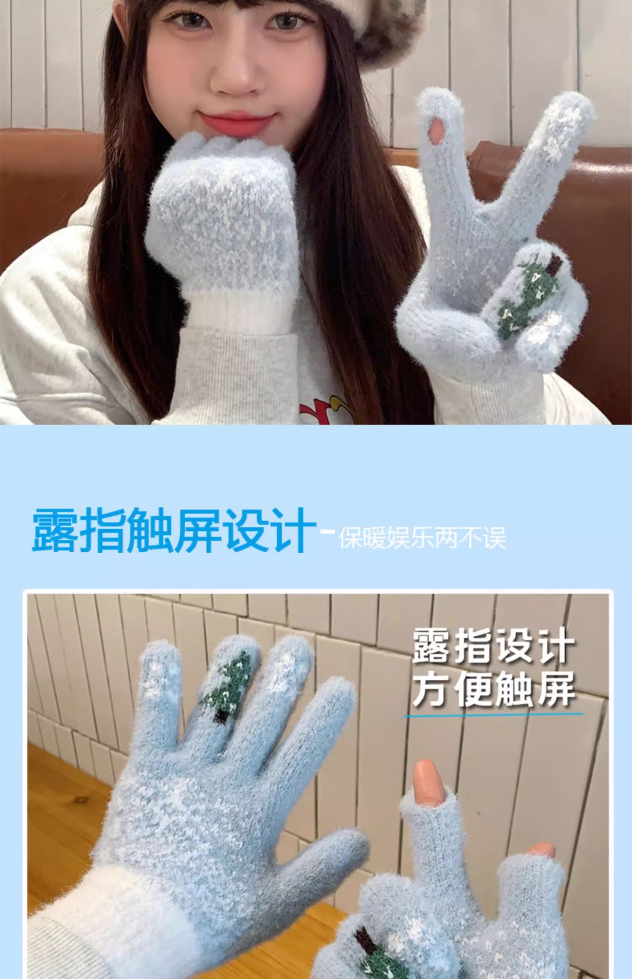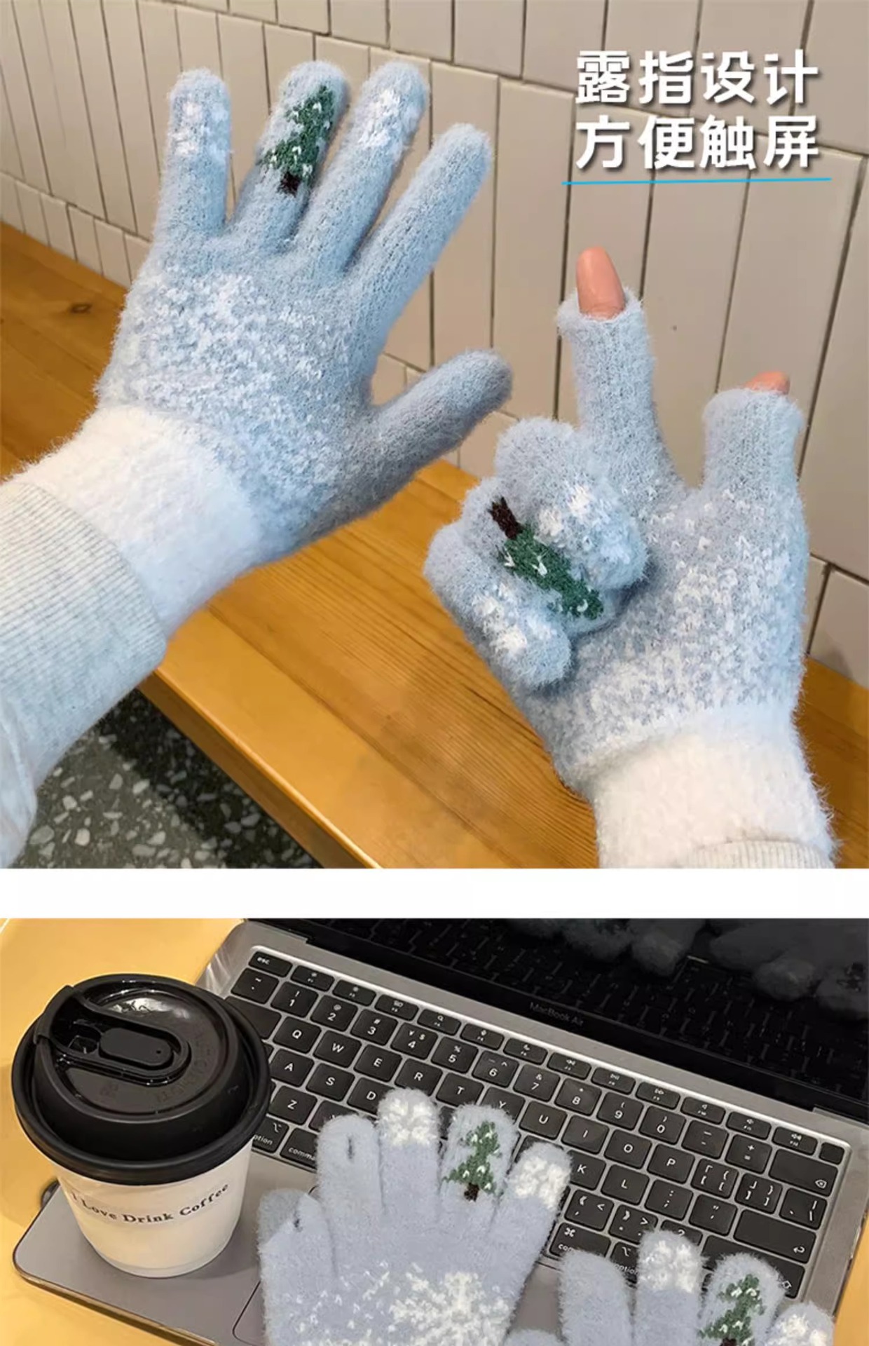 女士手套冬季新款露指加厚保暖可爱学生防寒毛线可触屏圣诞树手套