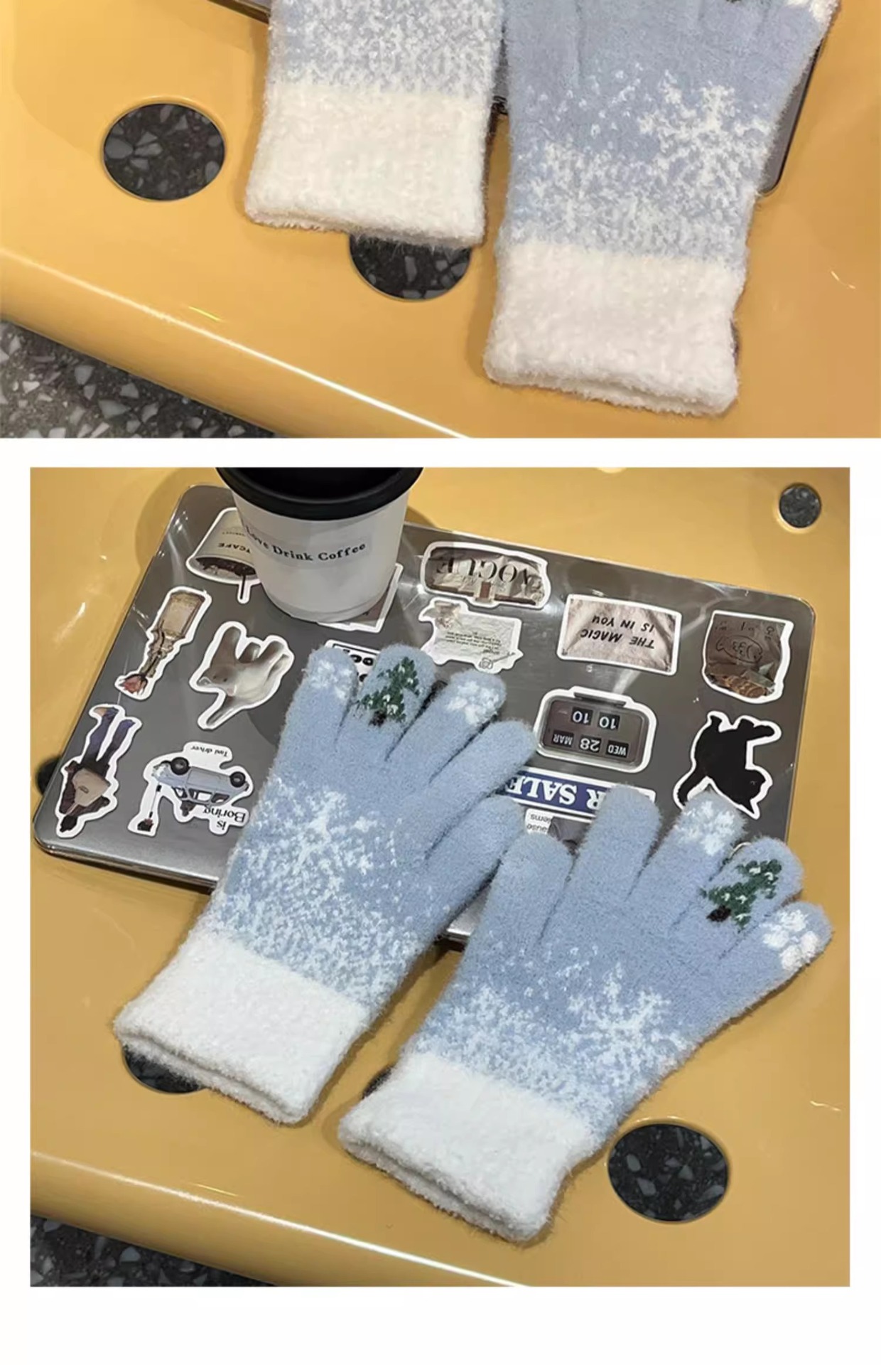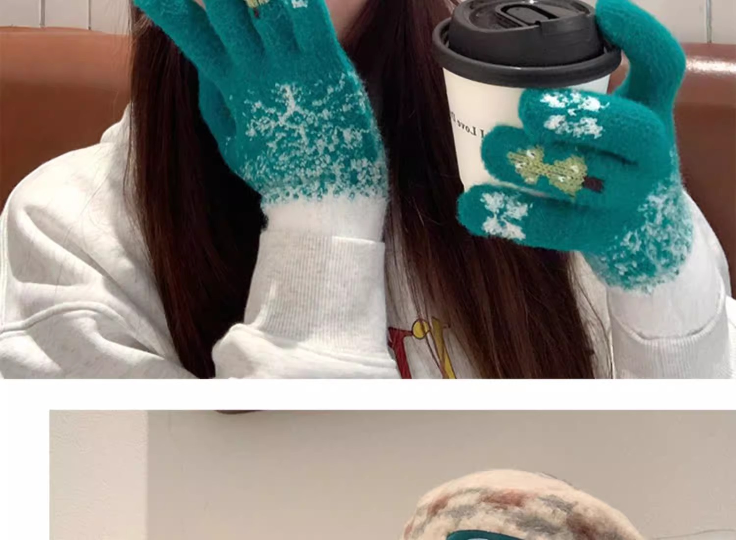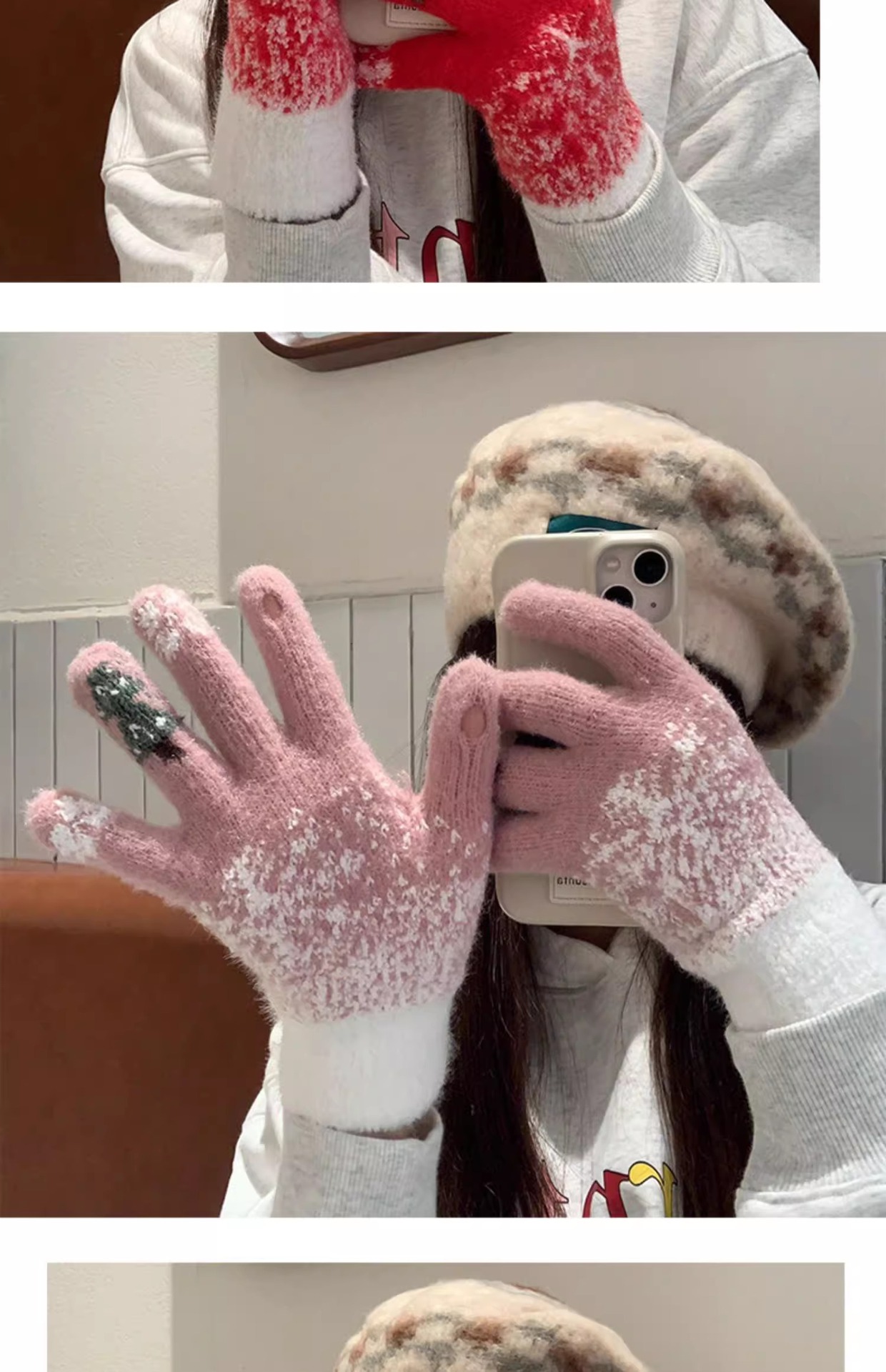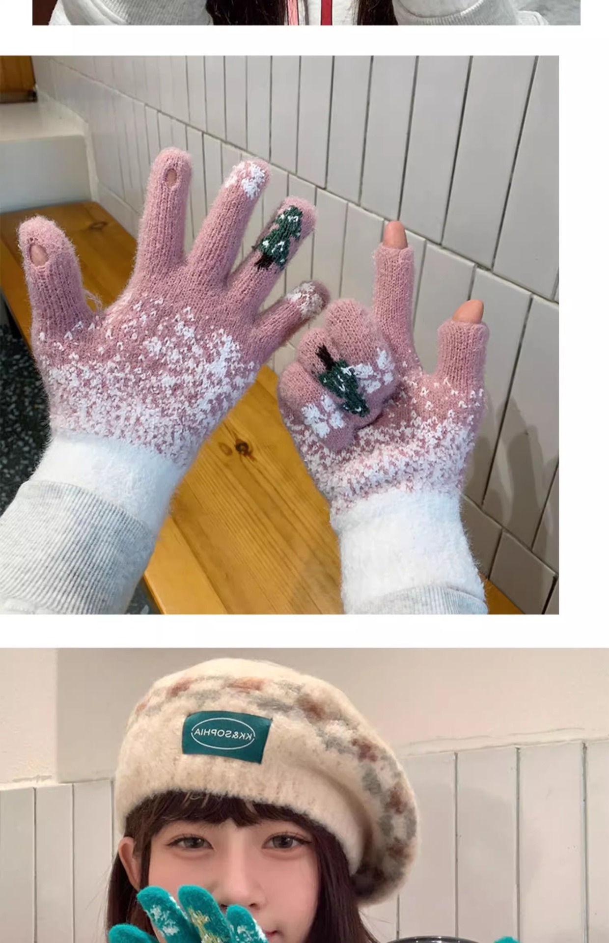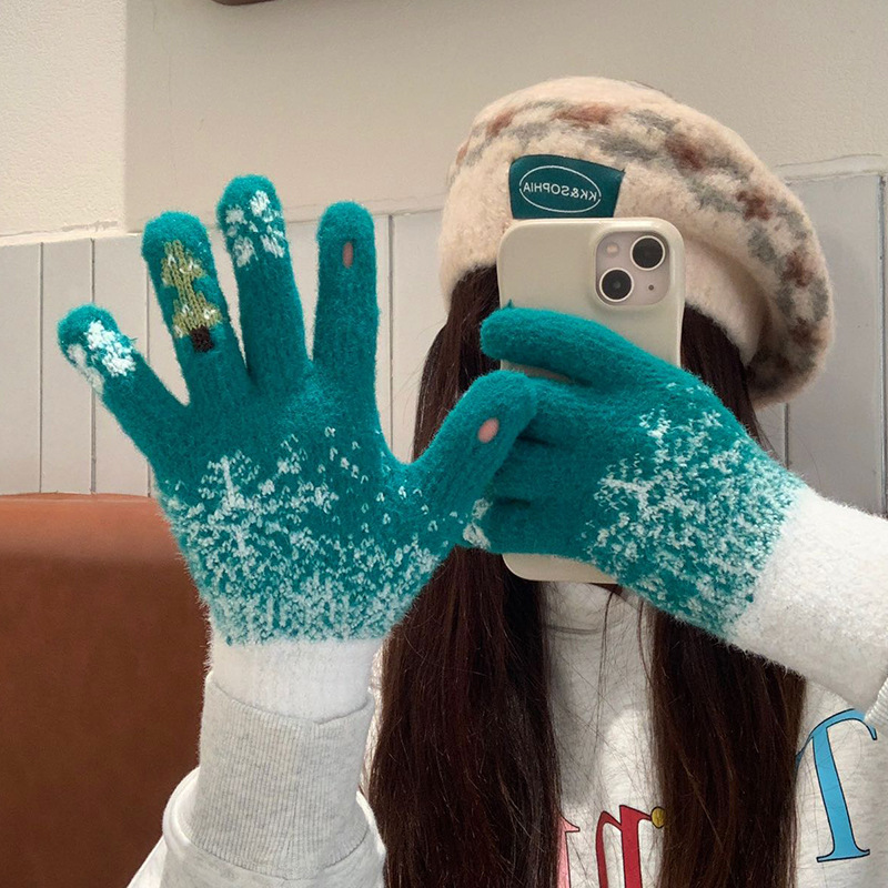 女士手套冬季新款露指加厚保暖可爱学生防寒毛线可触屏圣诞树手套