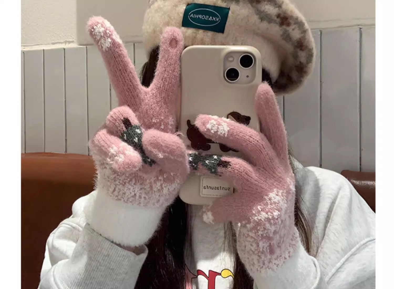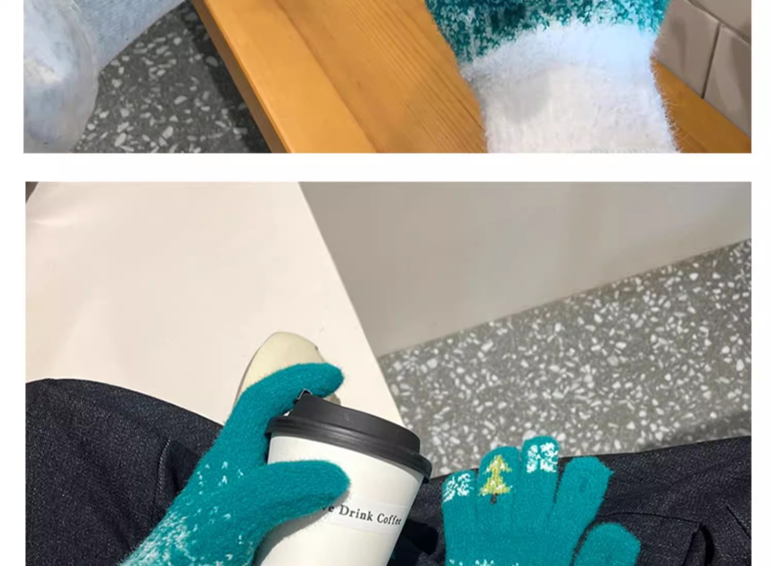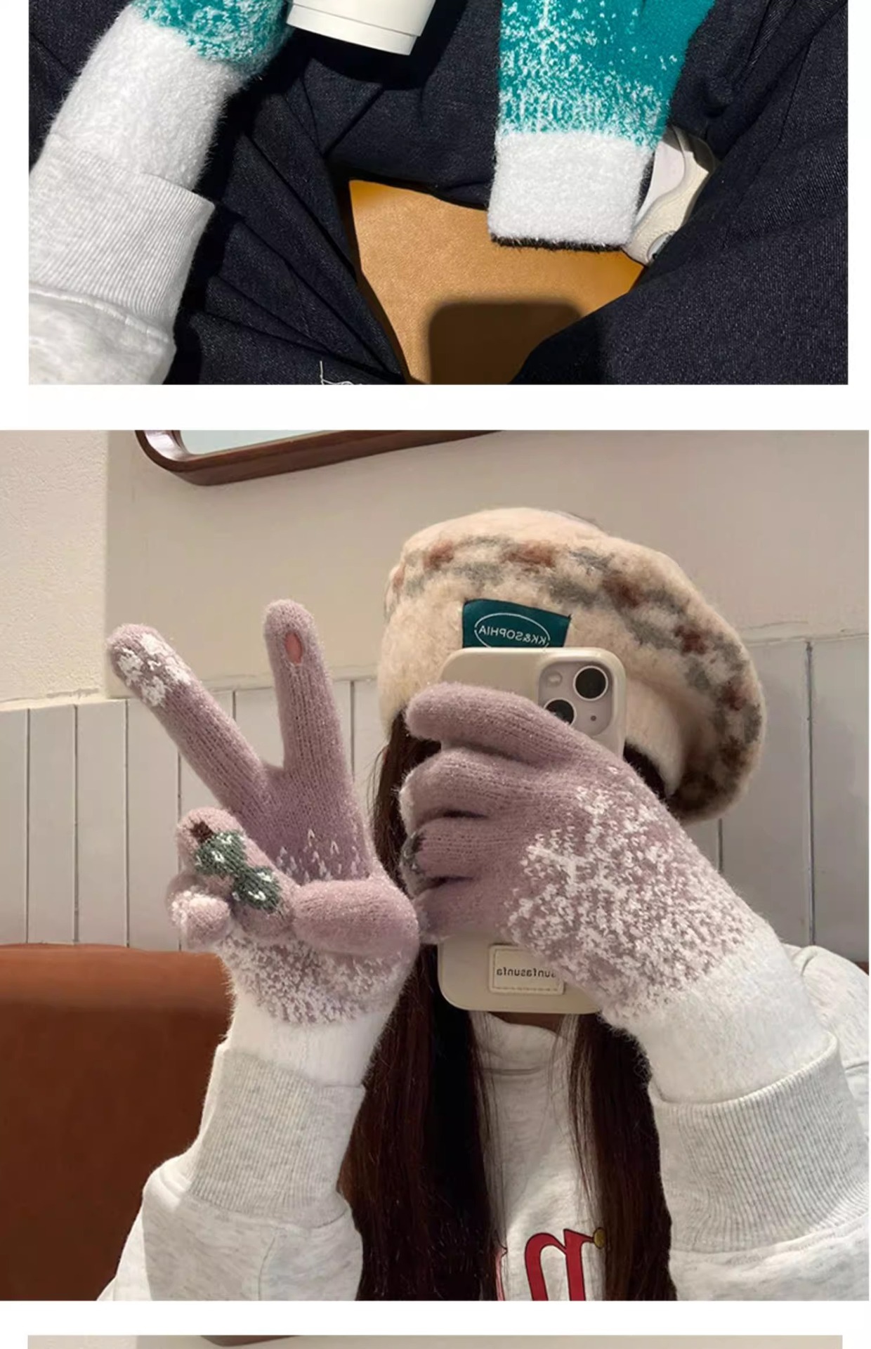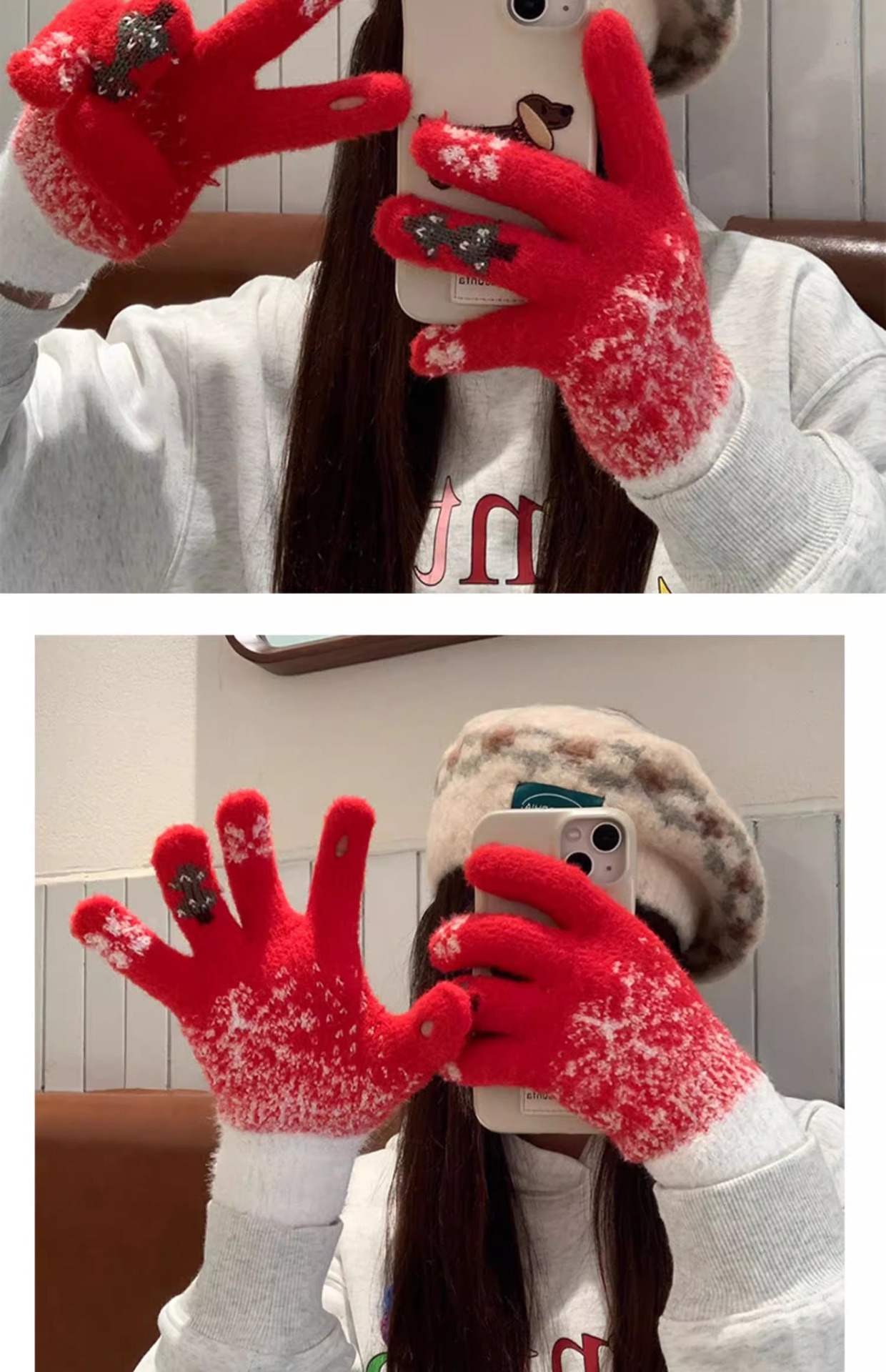 女士手套冬季新款露指加厚保暖可爱学生防寒毛线可触屏圣诞树手套