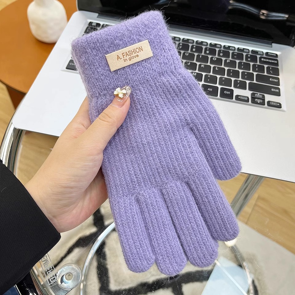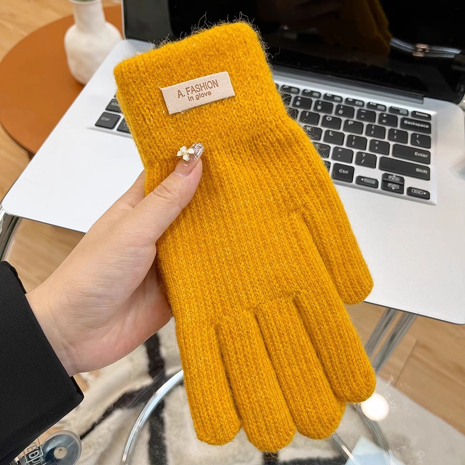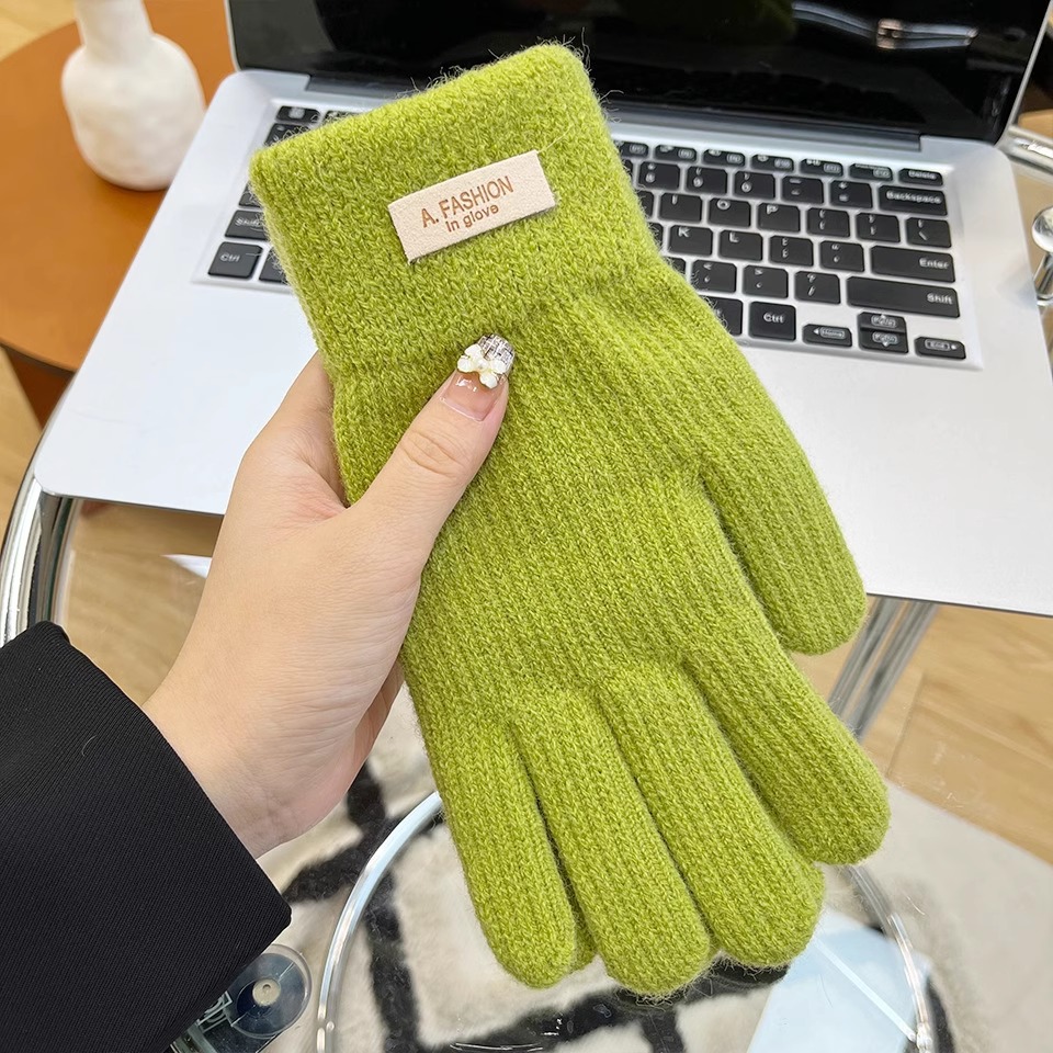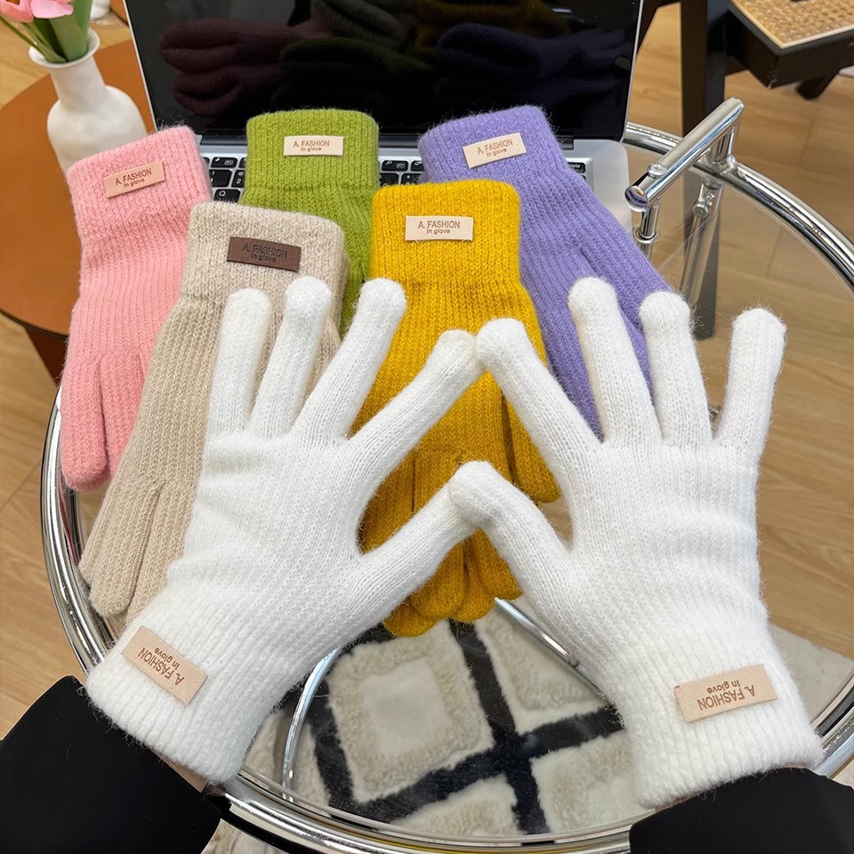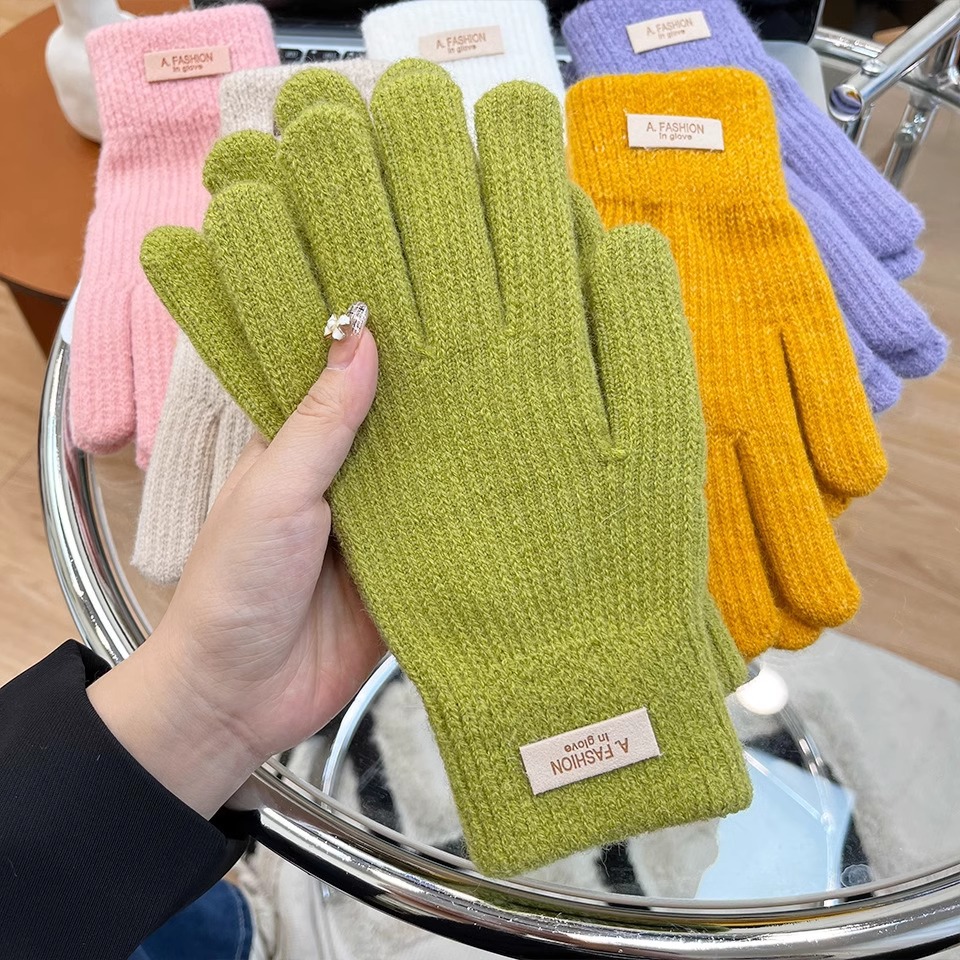 韩国针织毛线手套女士冬季防寒加厚加绒糖果色骑车触屏露指头五指