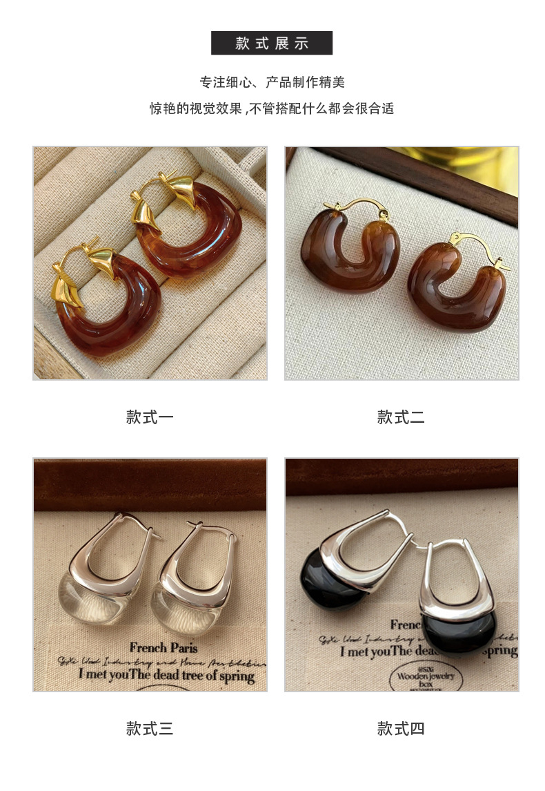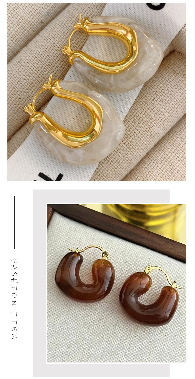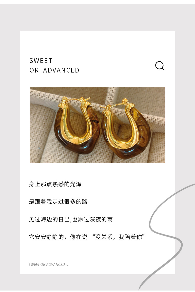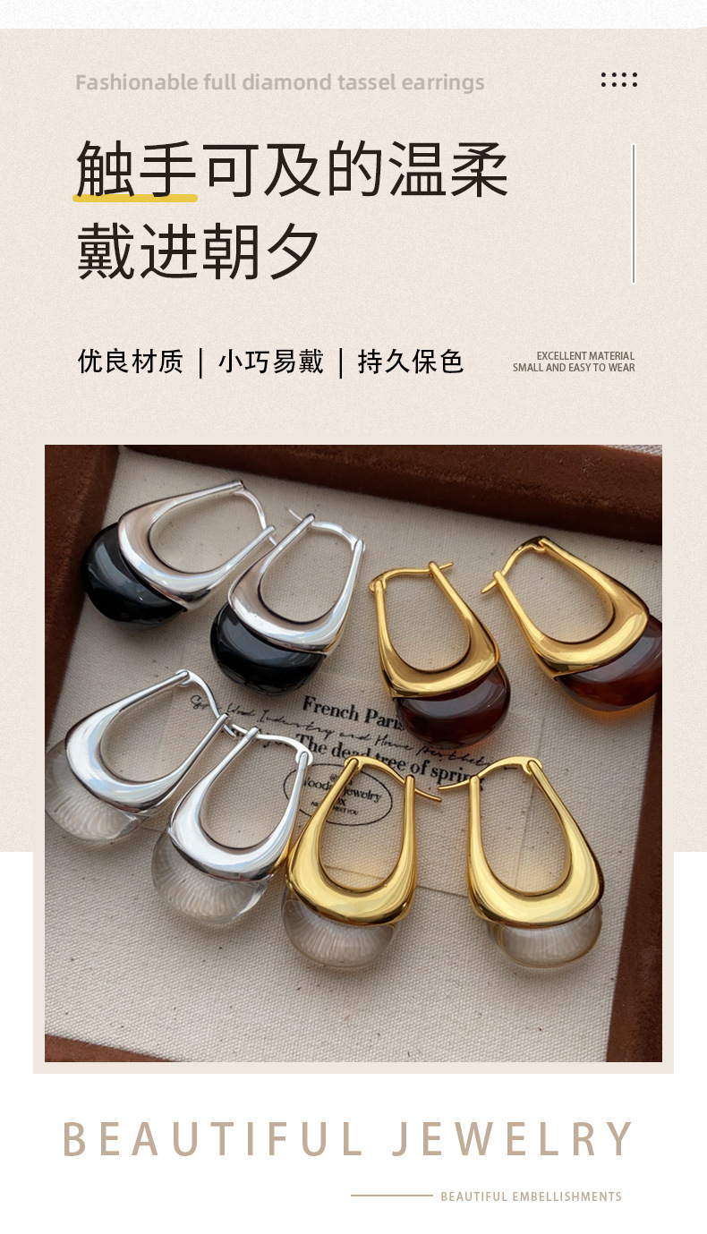 欧美个性时髦复古金属质感琥珀色亚克力耳圈不规则百搭耳环耳饰女