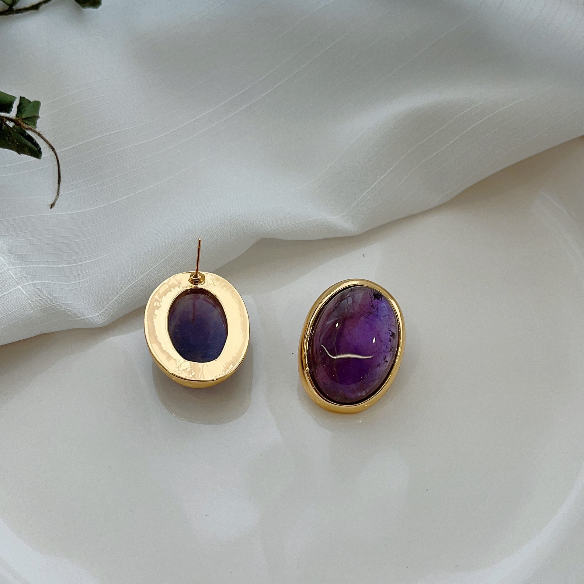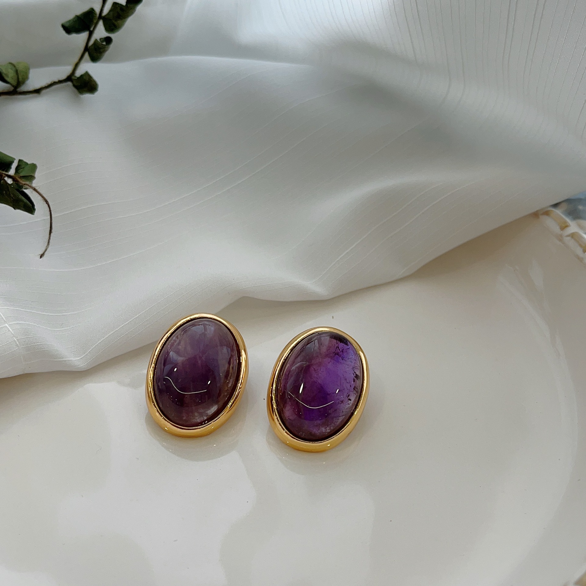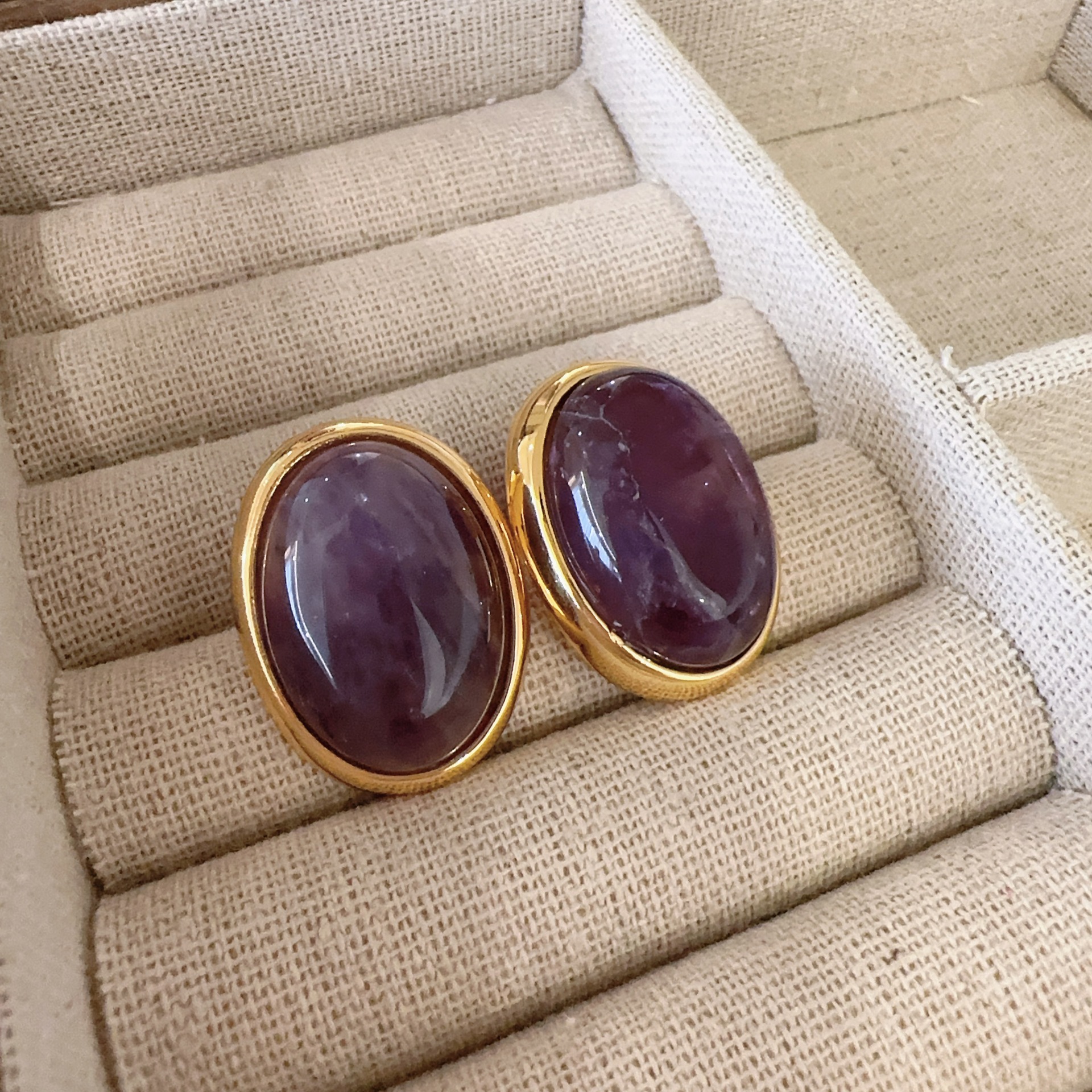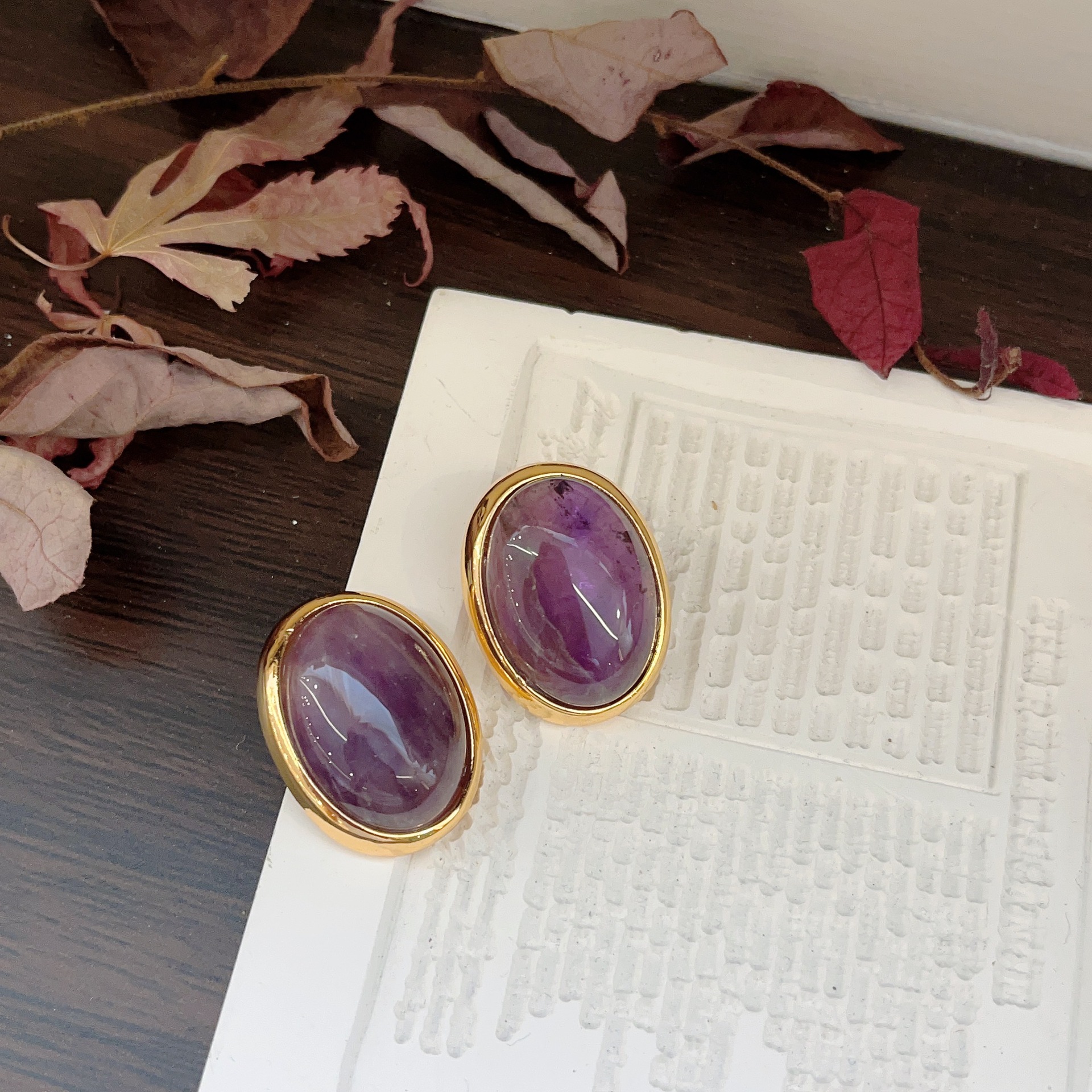 vintage复古宫廷椭圆形紫晶石通勤耳钉高级感法式复古轻奢耳钉