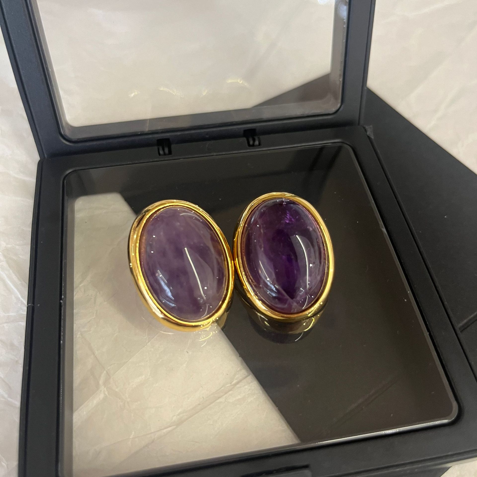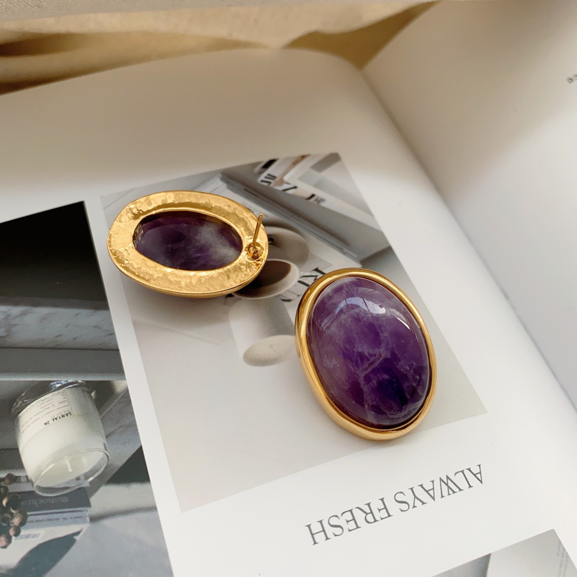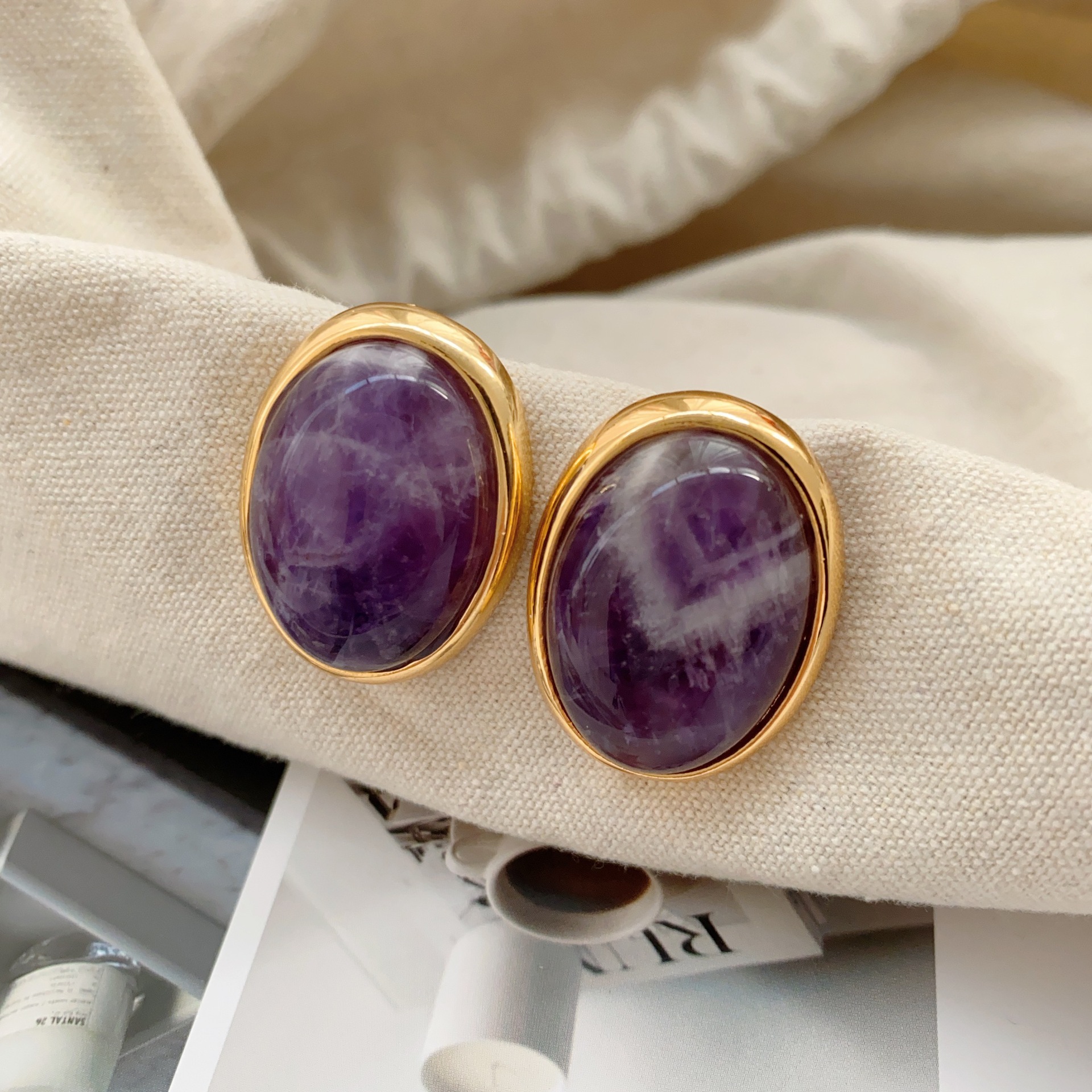 vintage复古宫廷椭圆形紫晶石通勤耳钉高级感法式复古轻奢耳钉