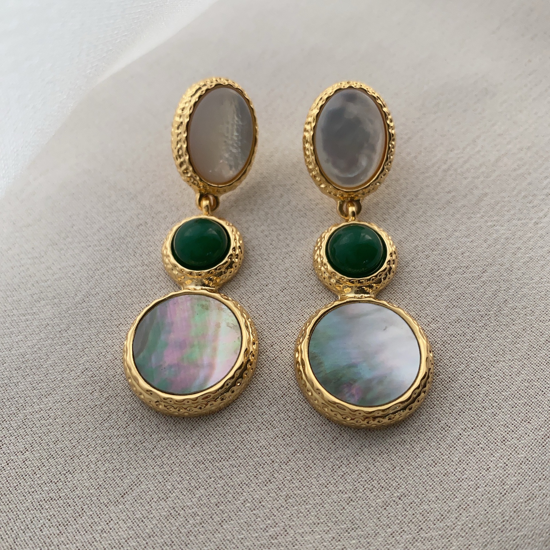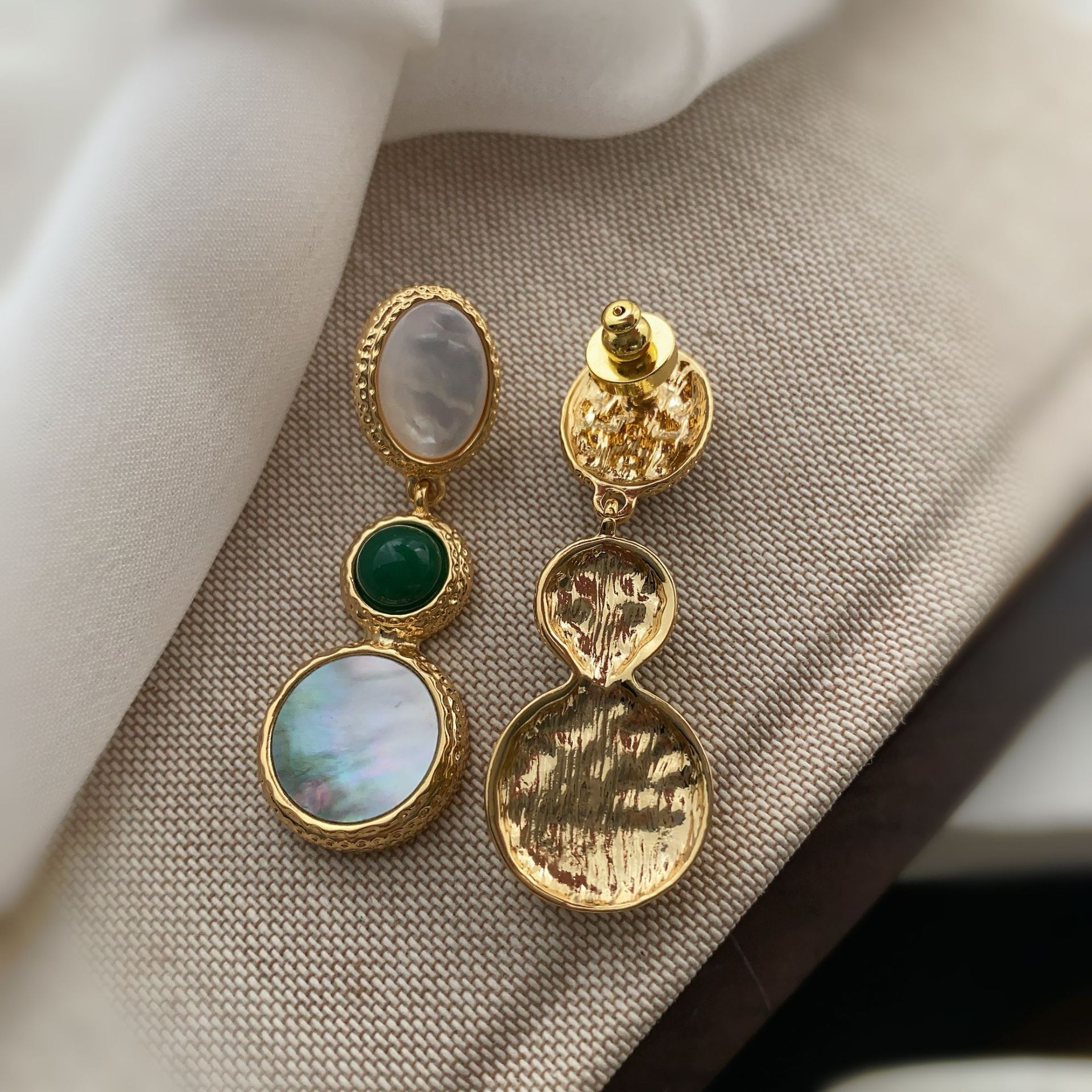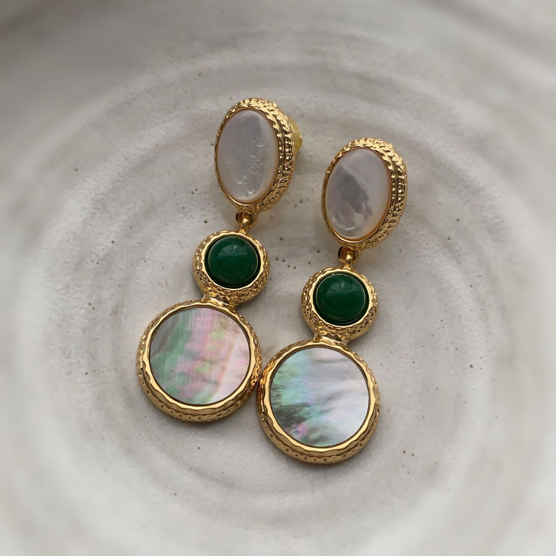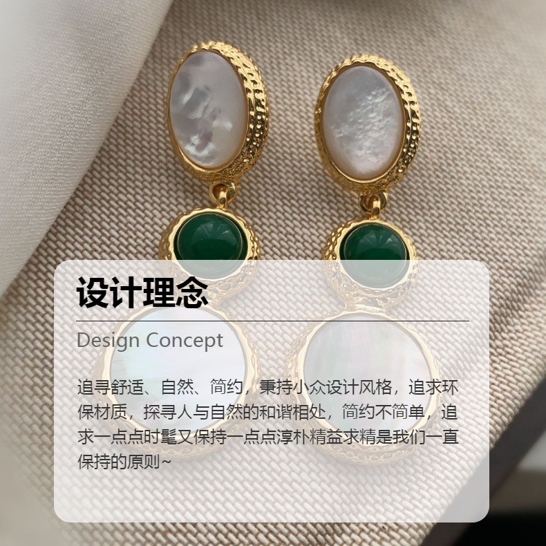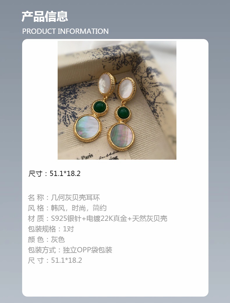 新款电镀22K真金耳环天然灰贝壳欧美时尚轻奢风复古高级百搭耳饰