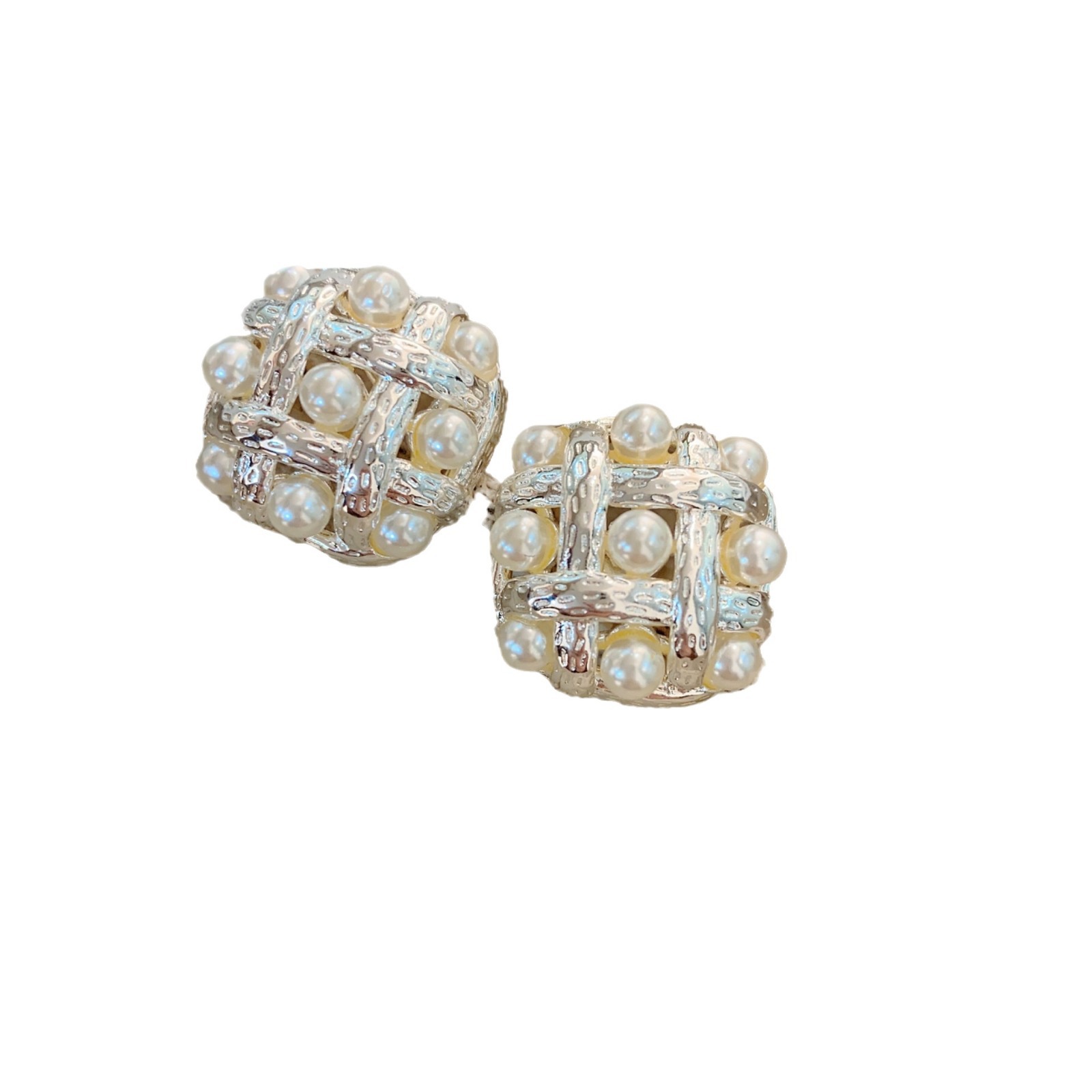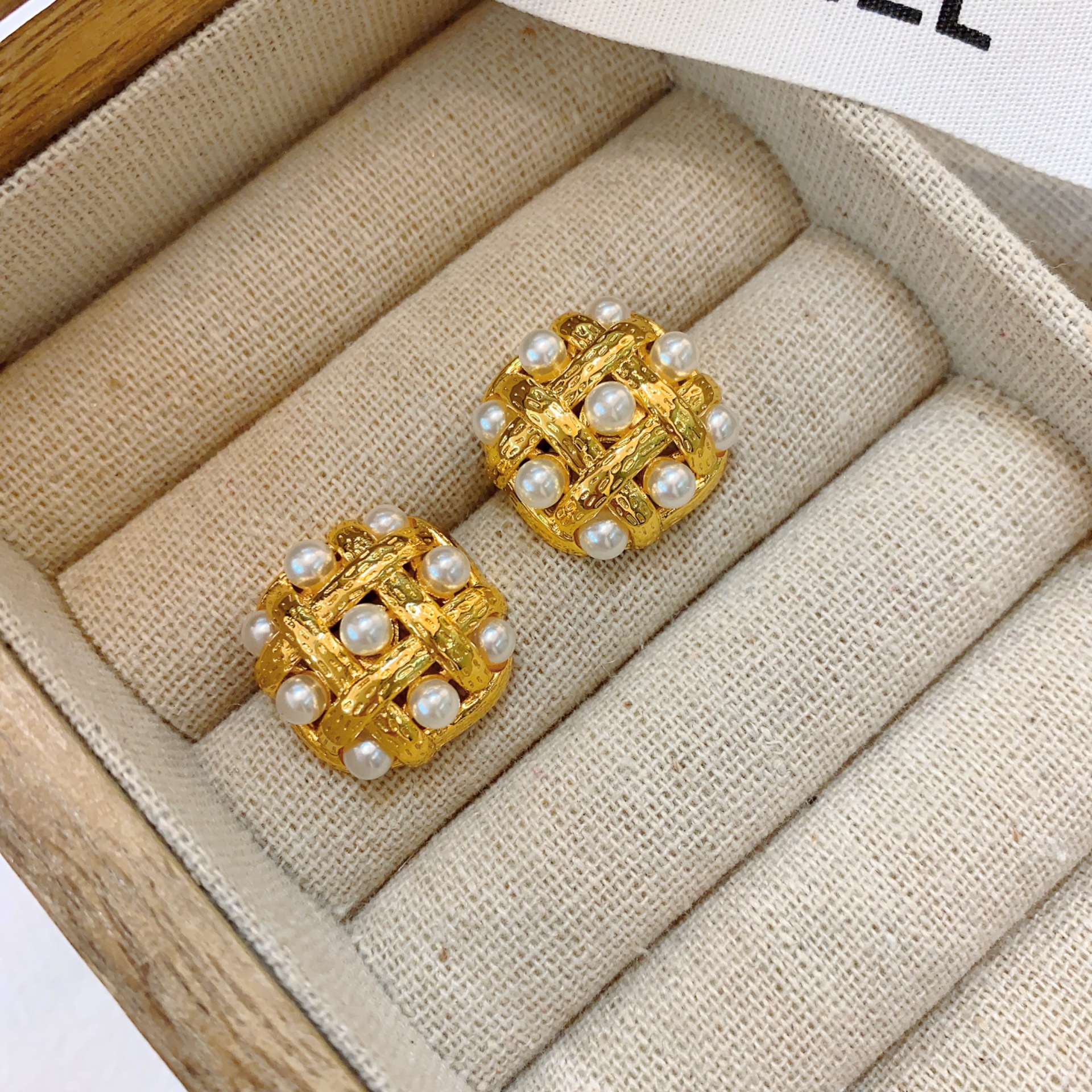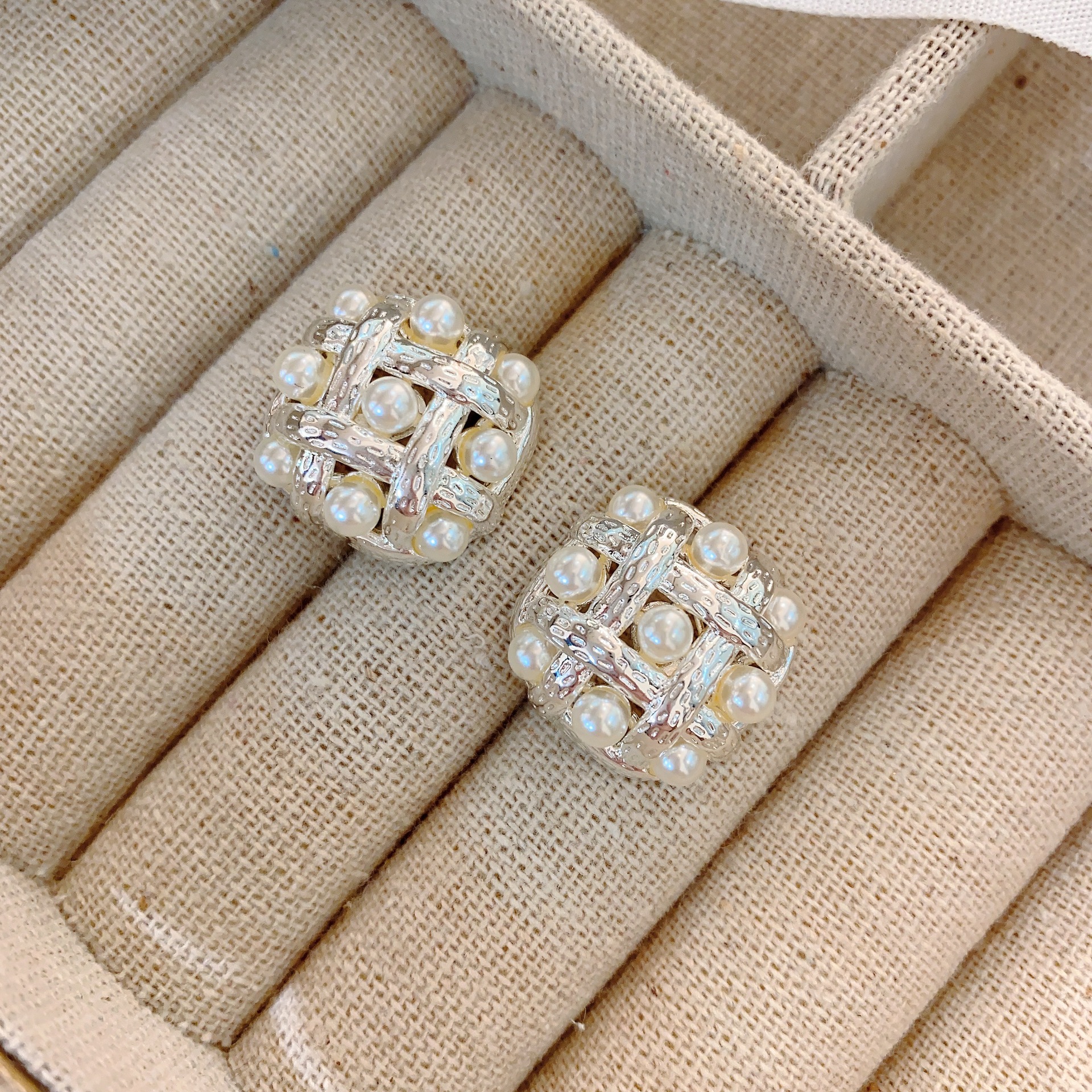 法式复古中古风时尚气质金属菱形珍珠耳钉小众独特精致高级感耳环