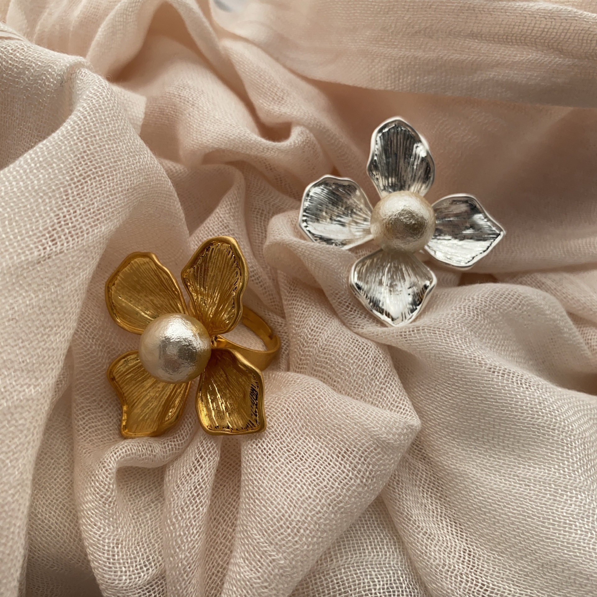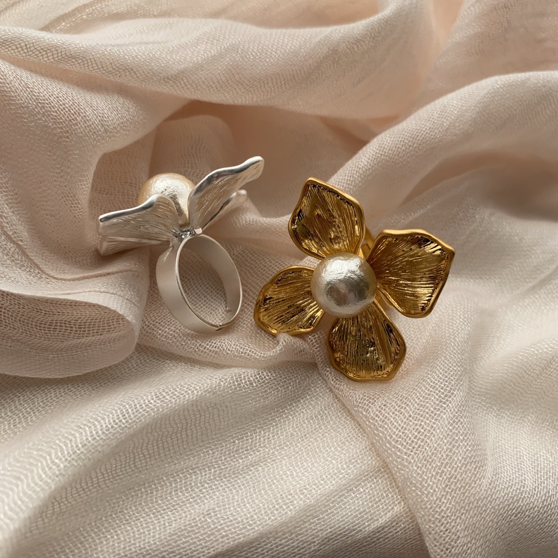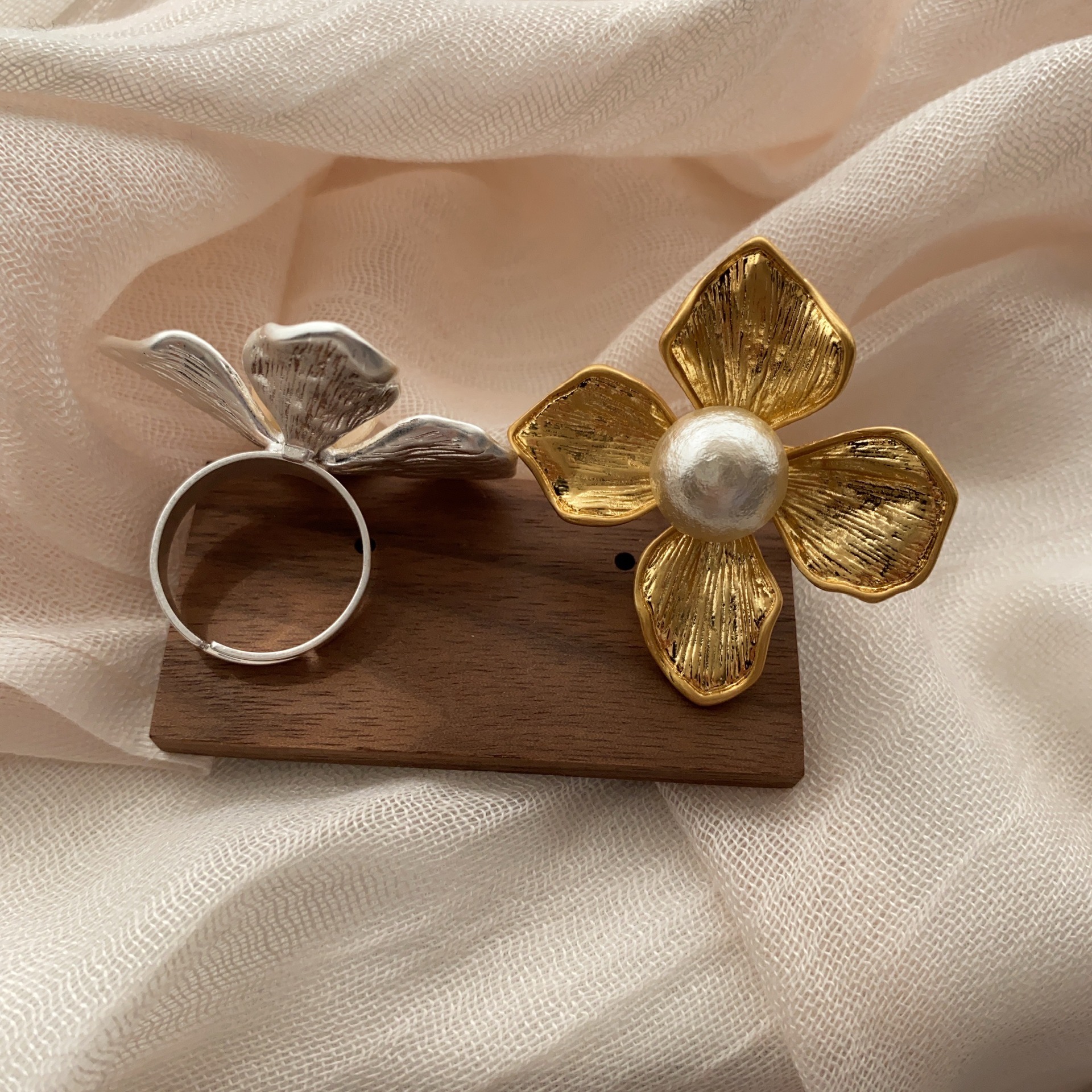 欧美跨境复古珍珠花瓣夸张戒指金银两色花形设计感指环通勤百搭戒