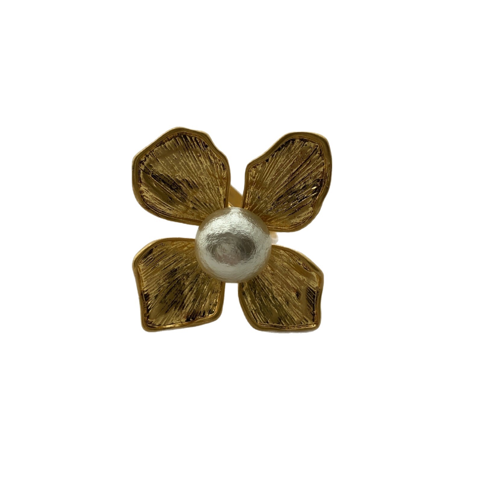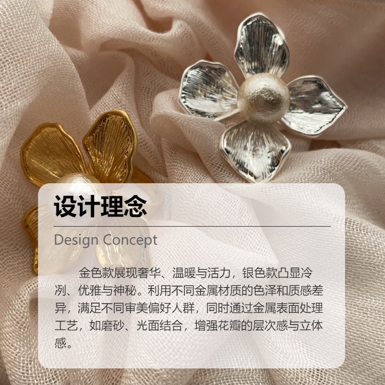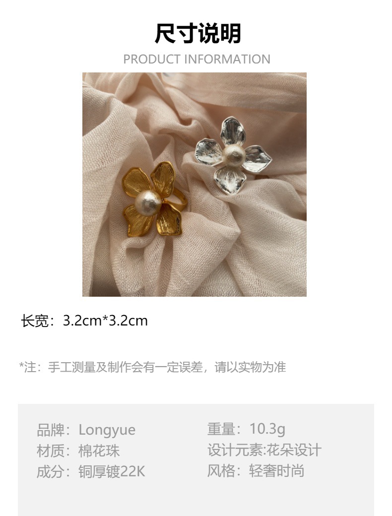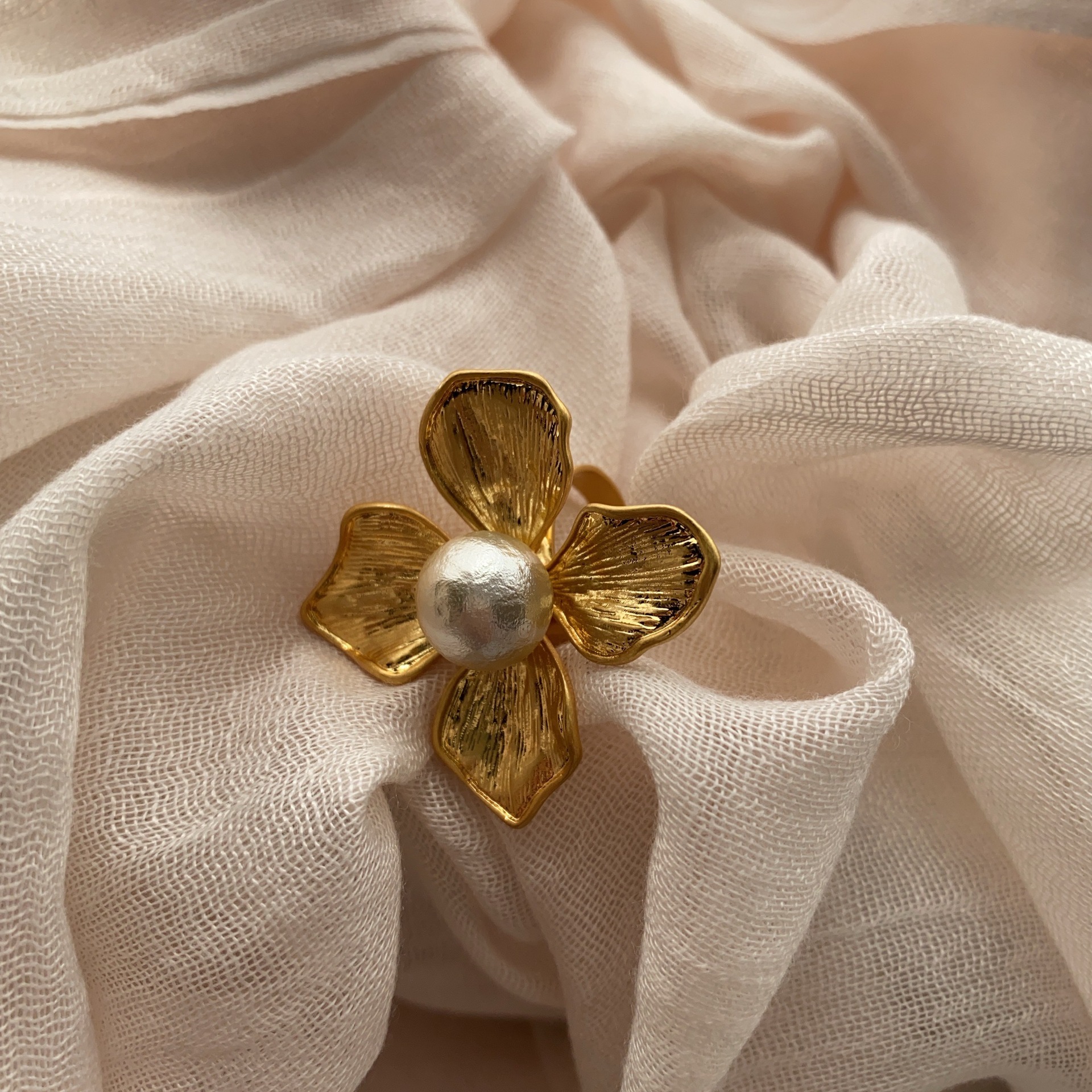 欧美跨境复古珍珠花瓣夸张戒指金银两色花形设计感指环通勤百搭戒