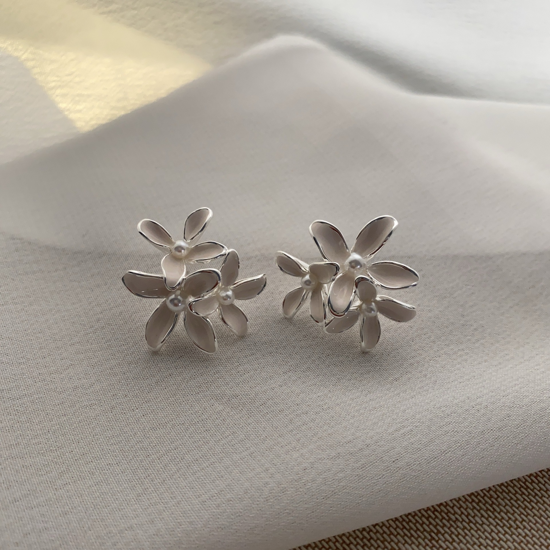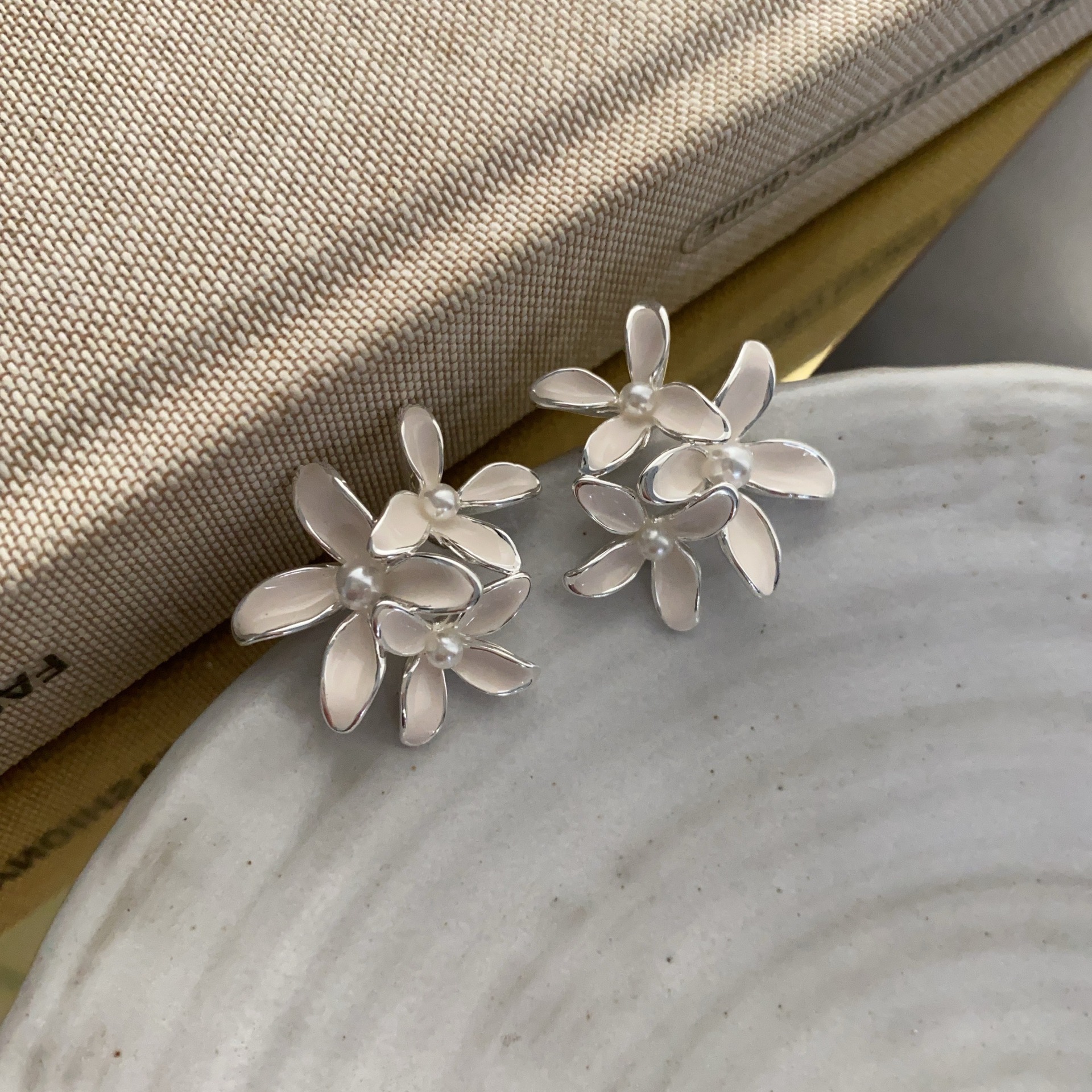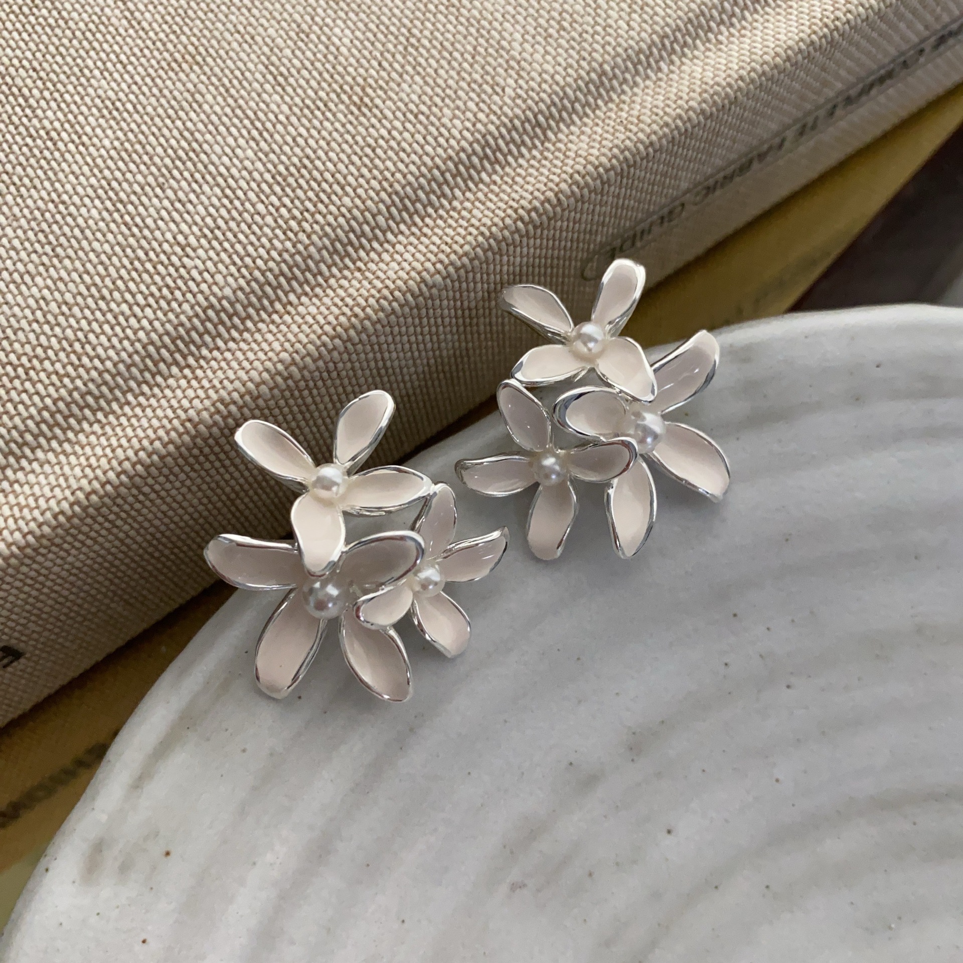小众百搭时尚轻奢个性滴油五瓣花立体花朵夸张金属感三朵珍珠耳环