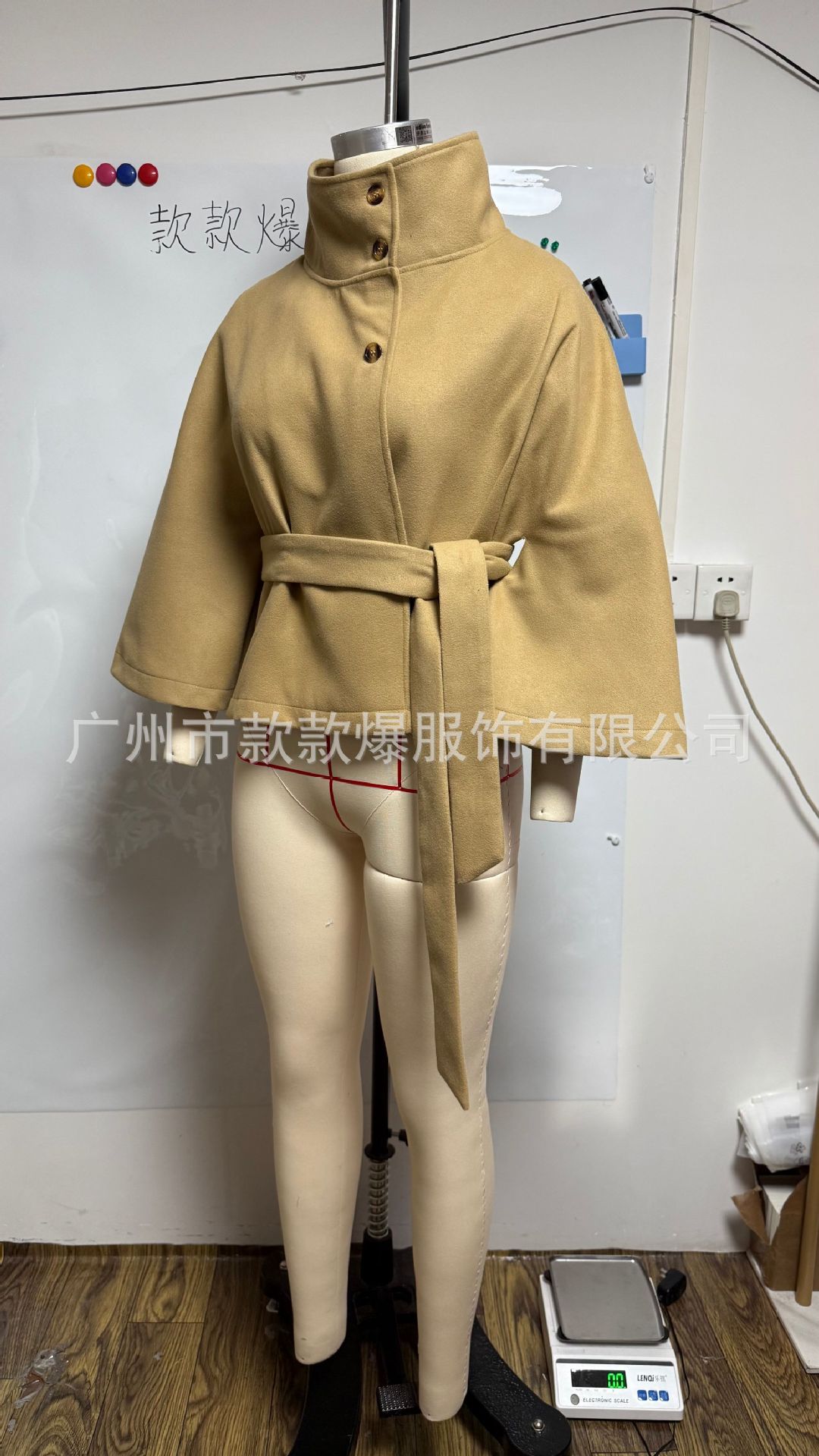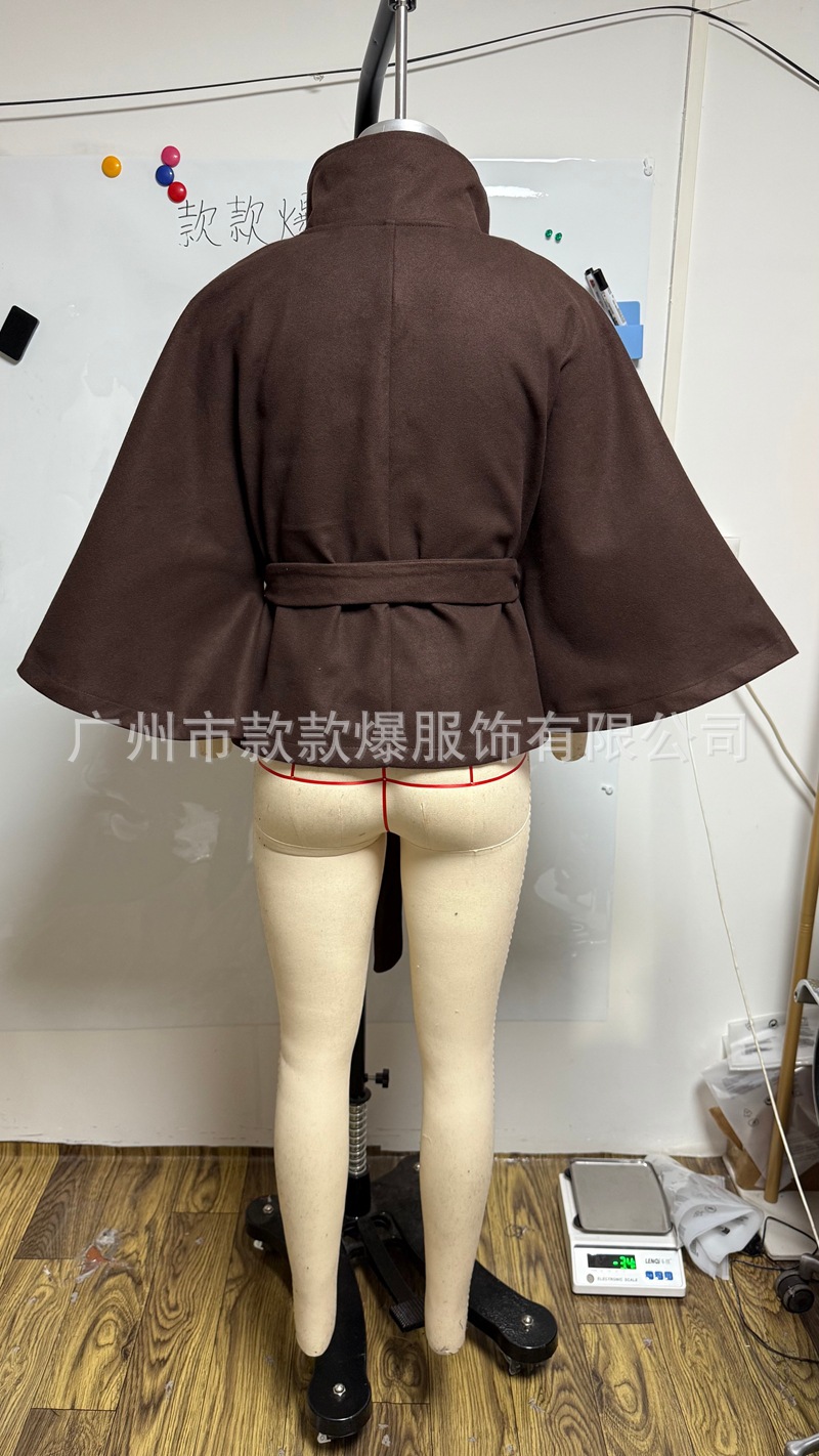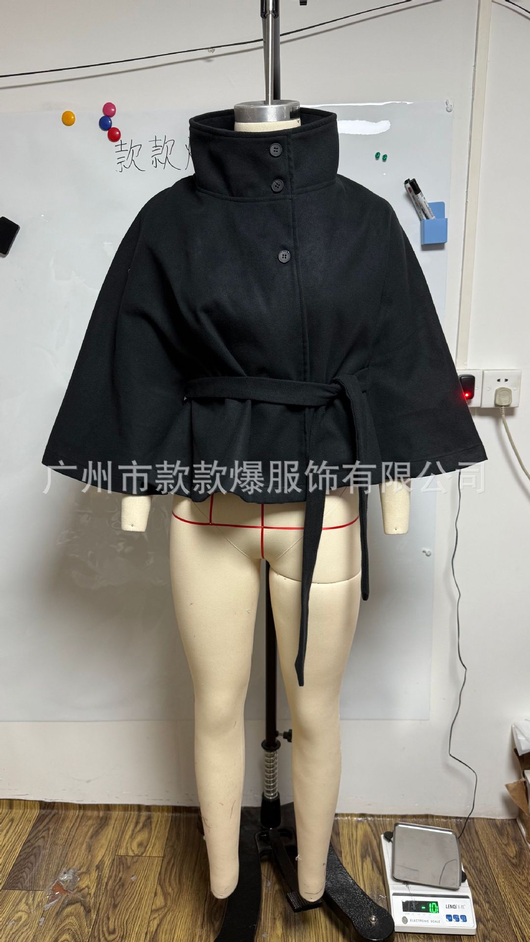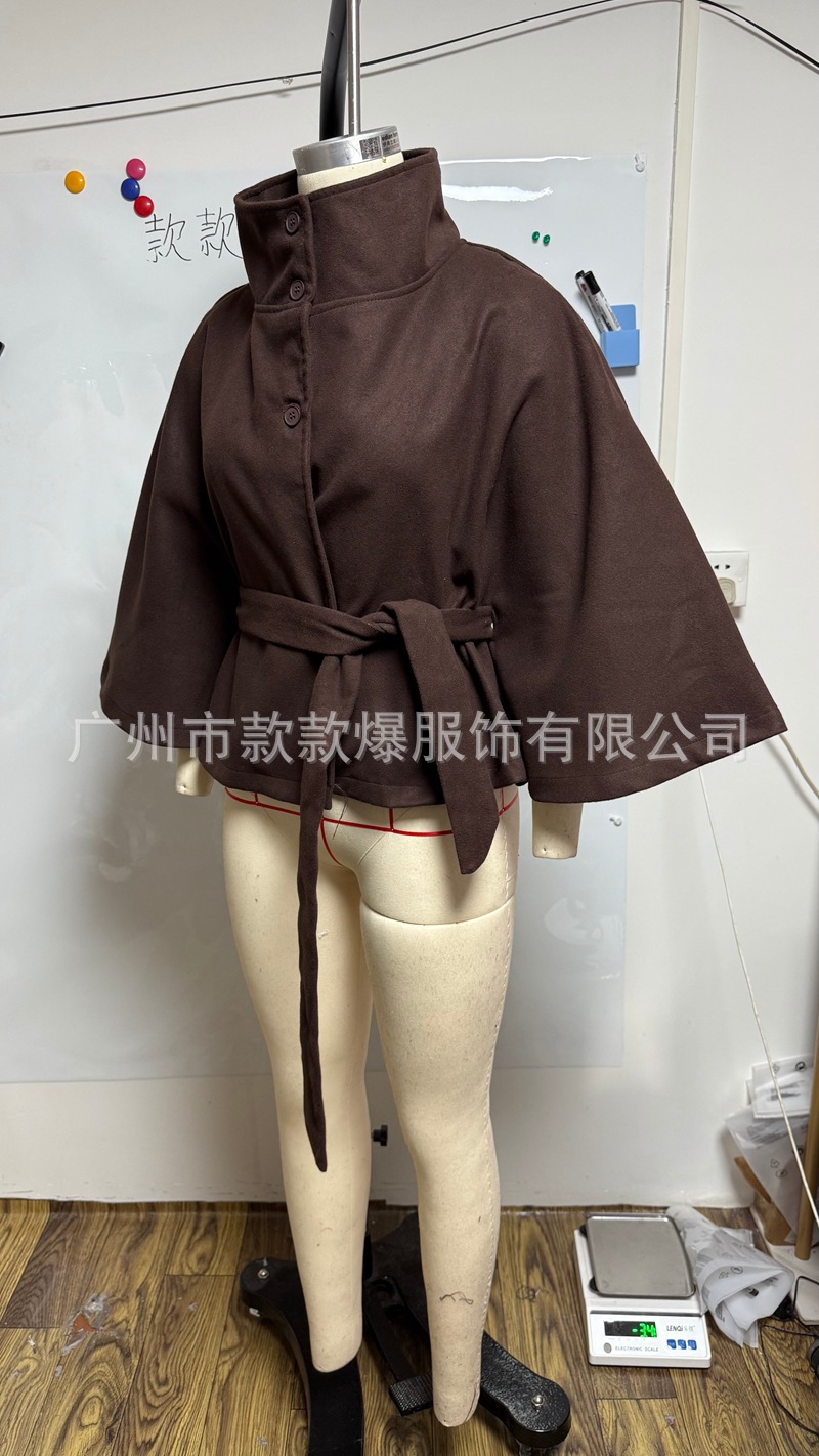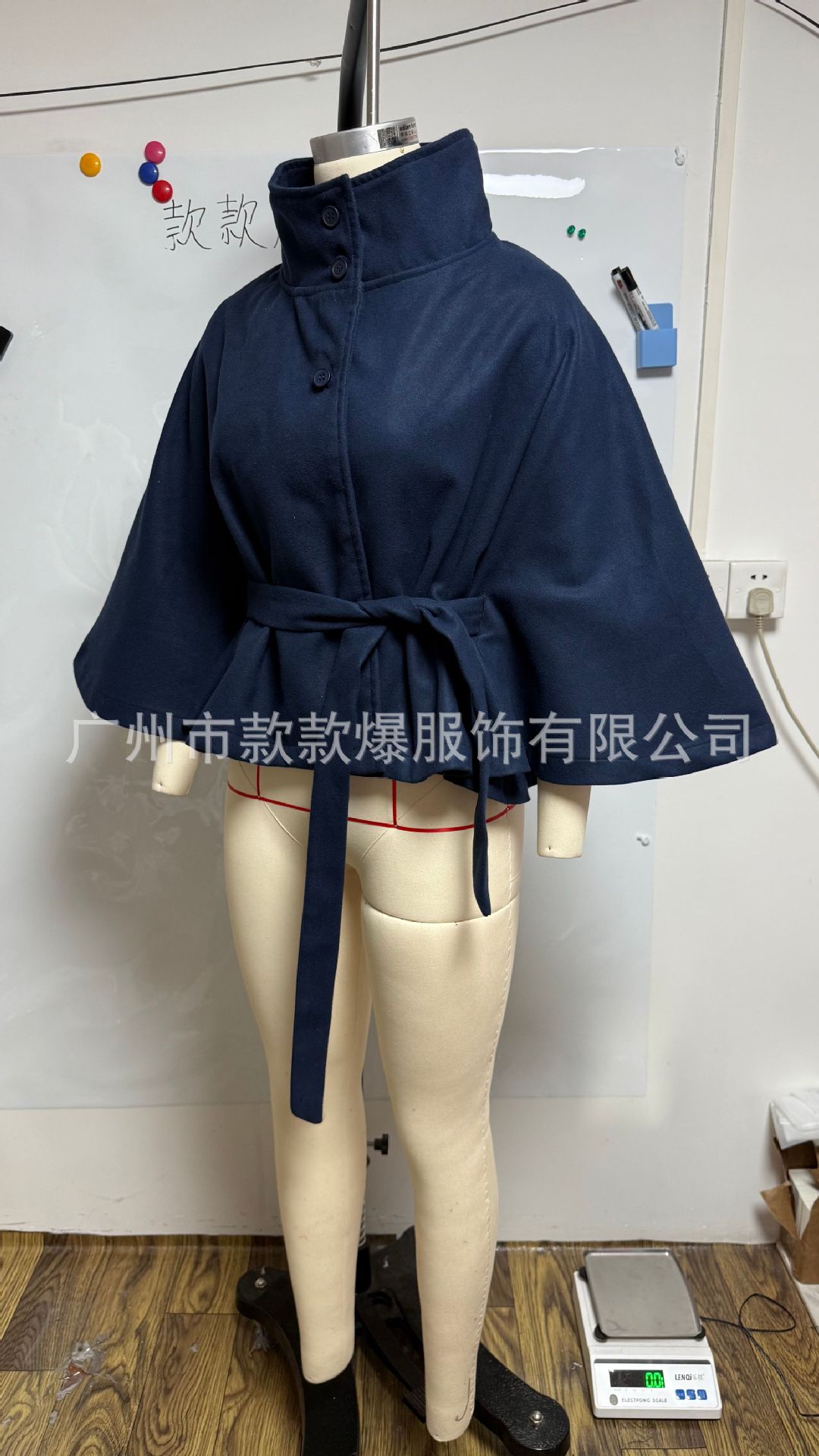 欧美女装秋冬季新款亚马逊跨境时尚纯色斗篷立领纽扣腰带风衣外套