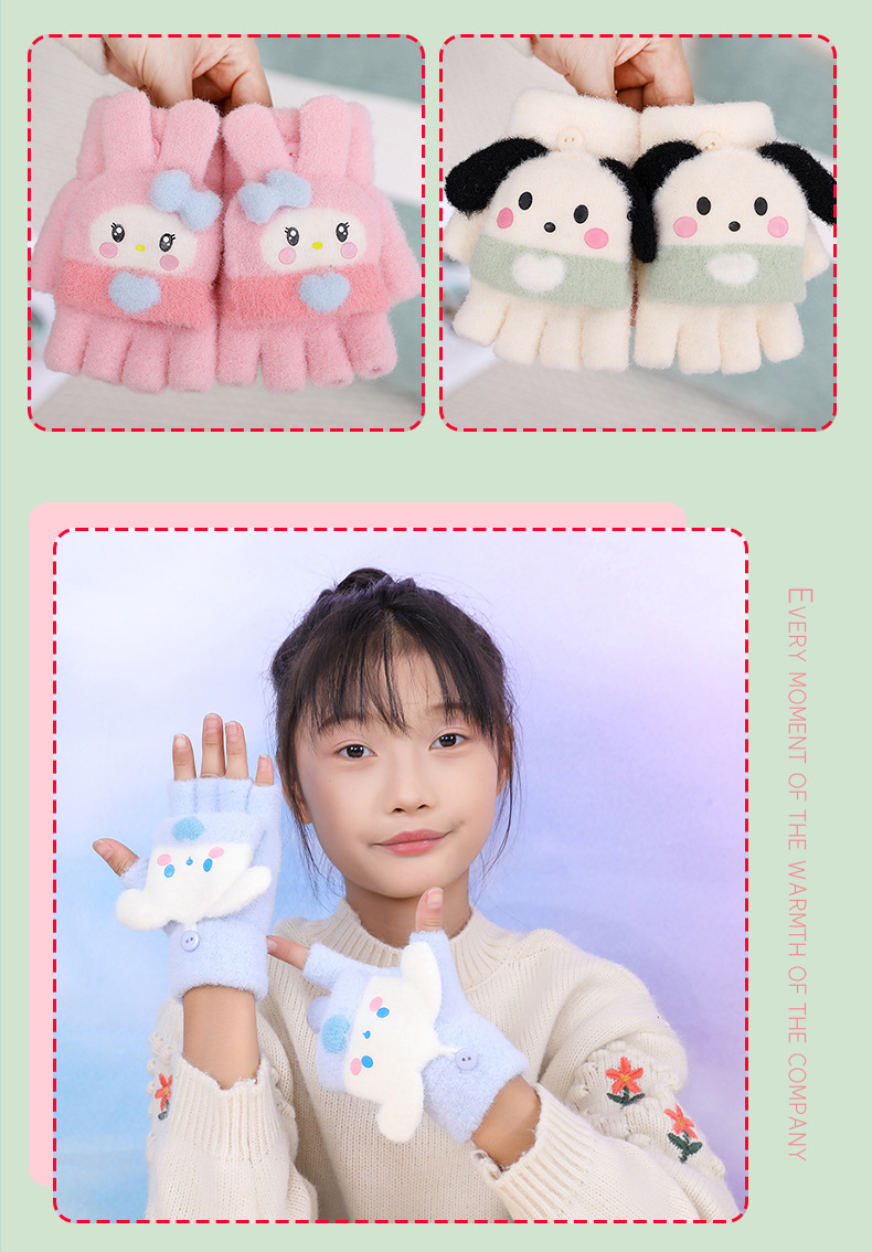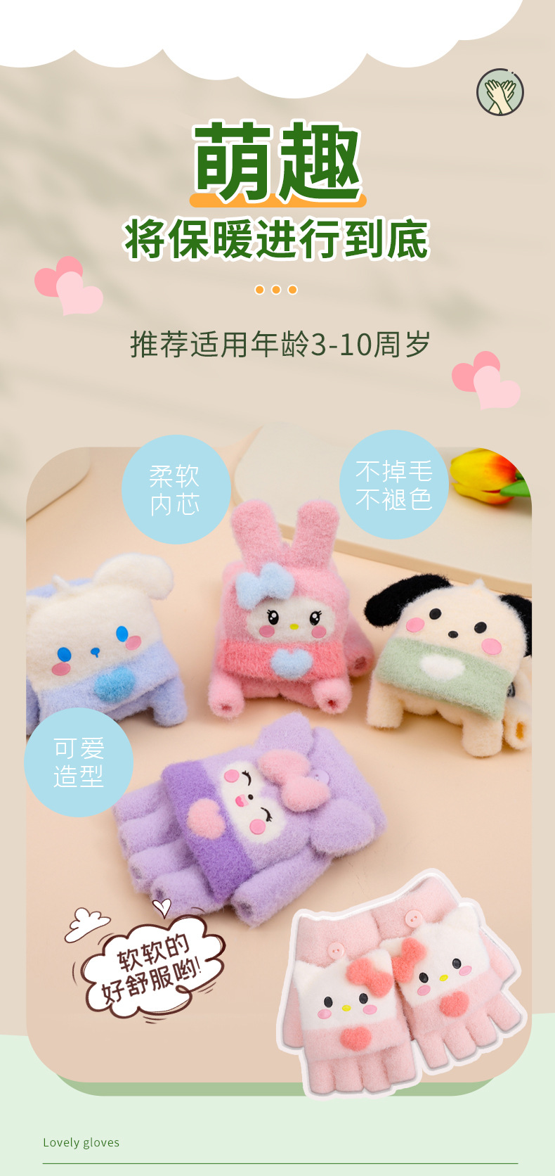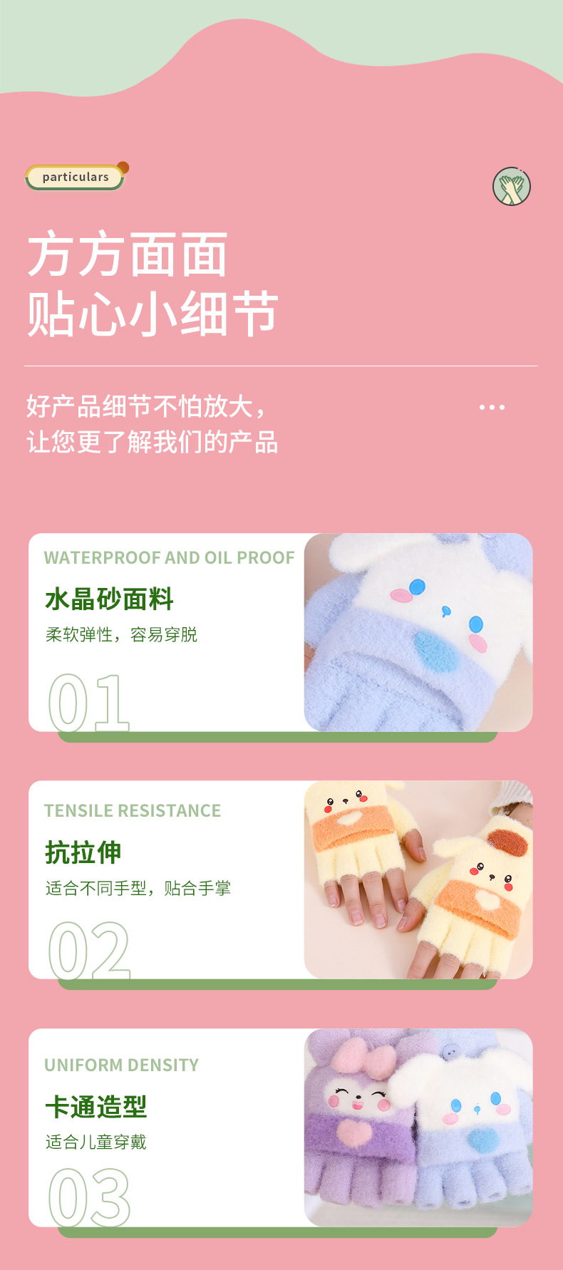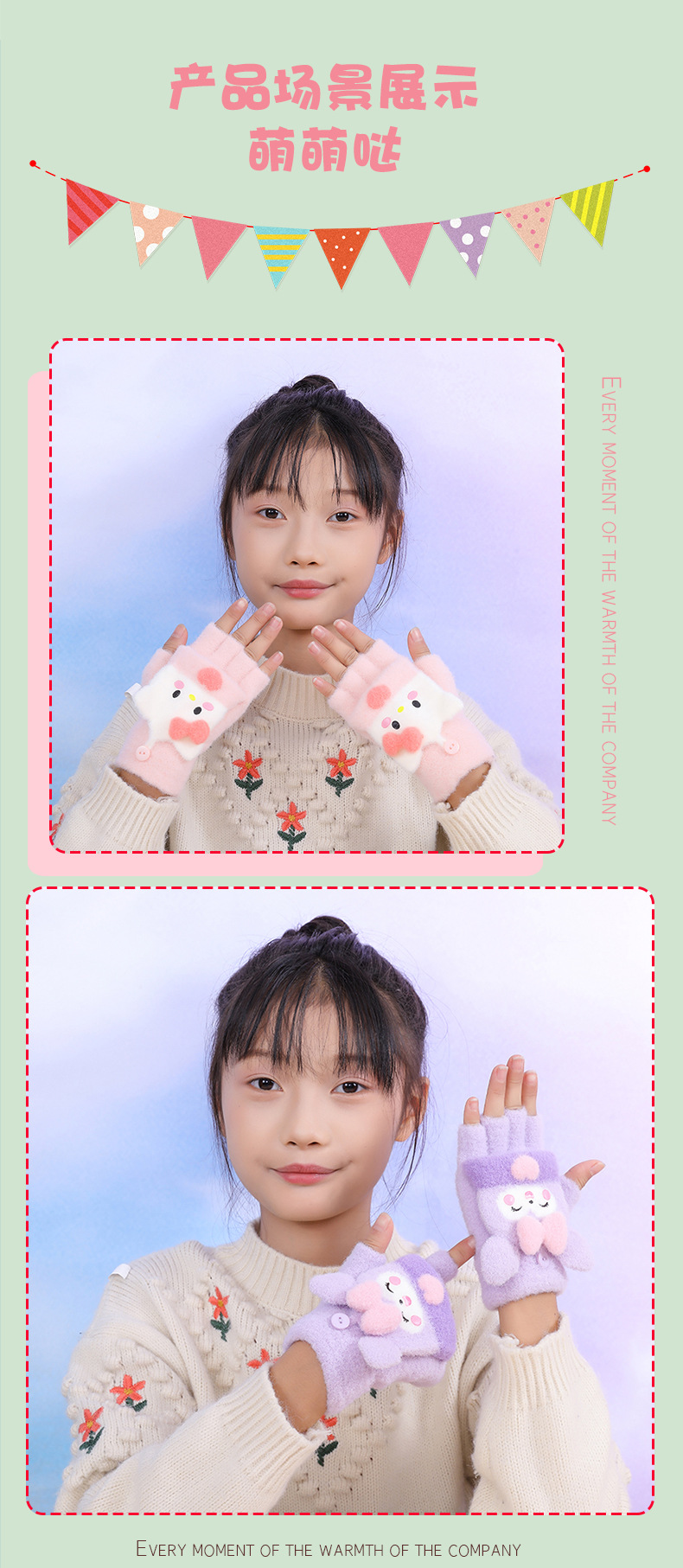 儿童手套冬季女童翻盖可爱俏皮露指卡通小孩加绒防寒保暖百搭半指