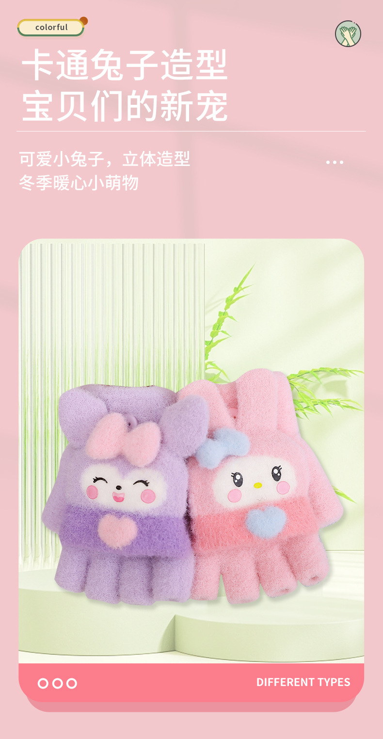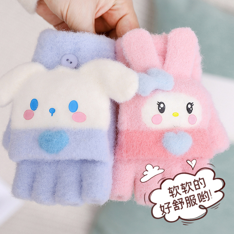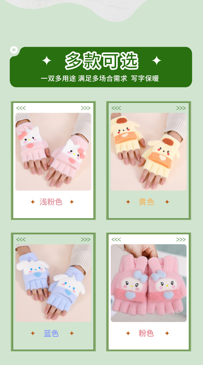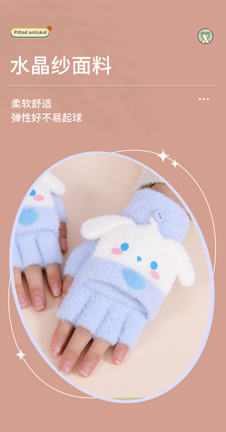 儿童手套冬季女童翻盖可爱俏皮露指卡通小孩加绒防寒保暖百搭半指