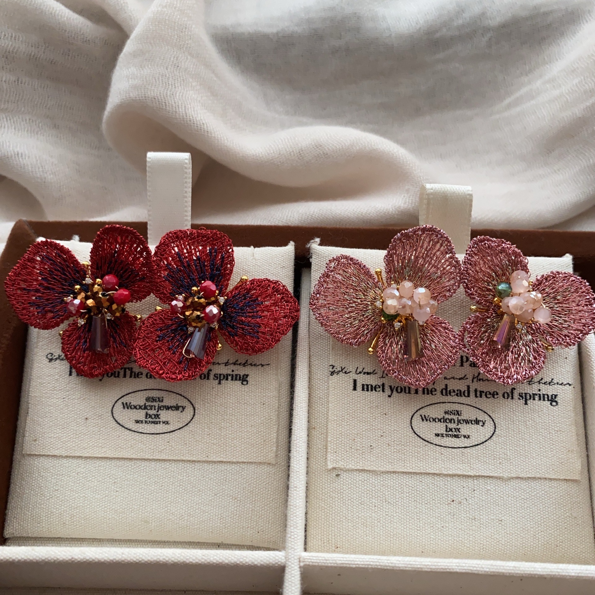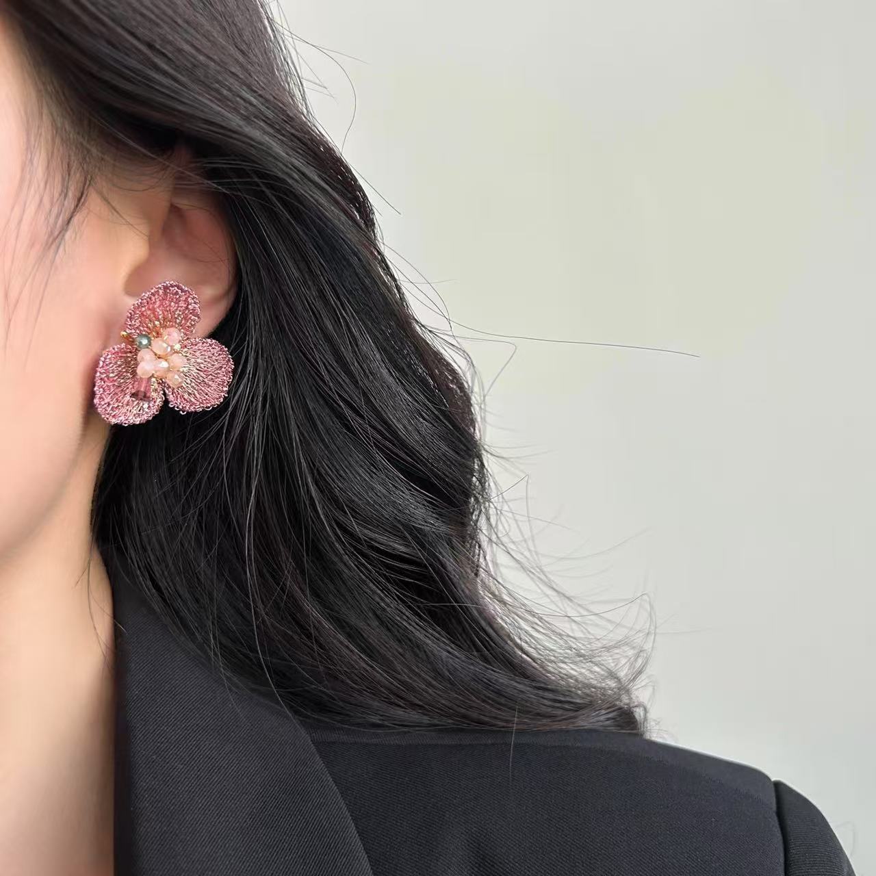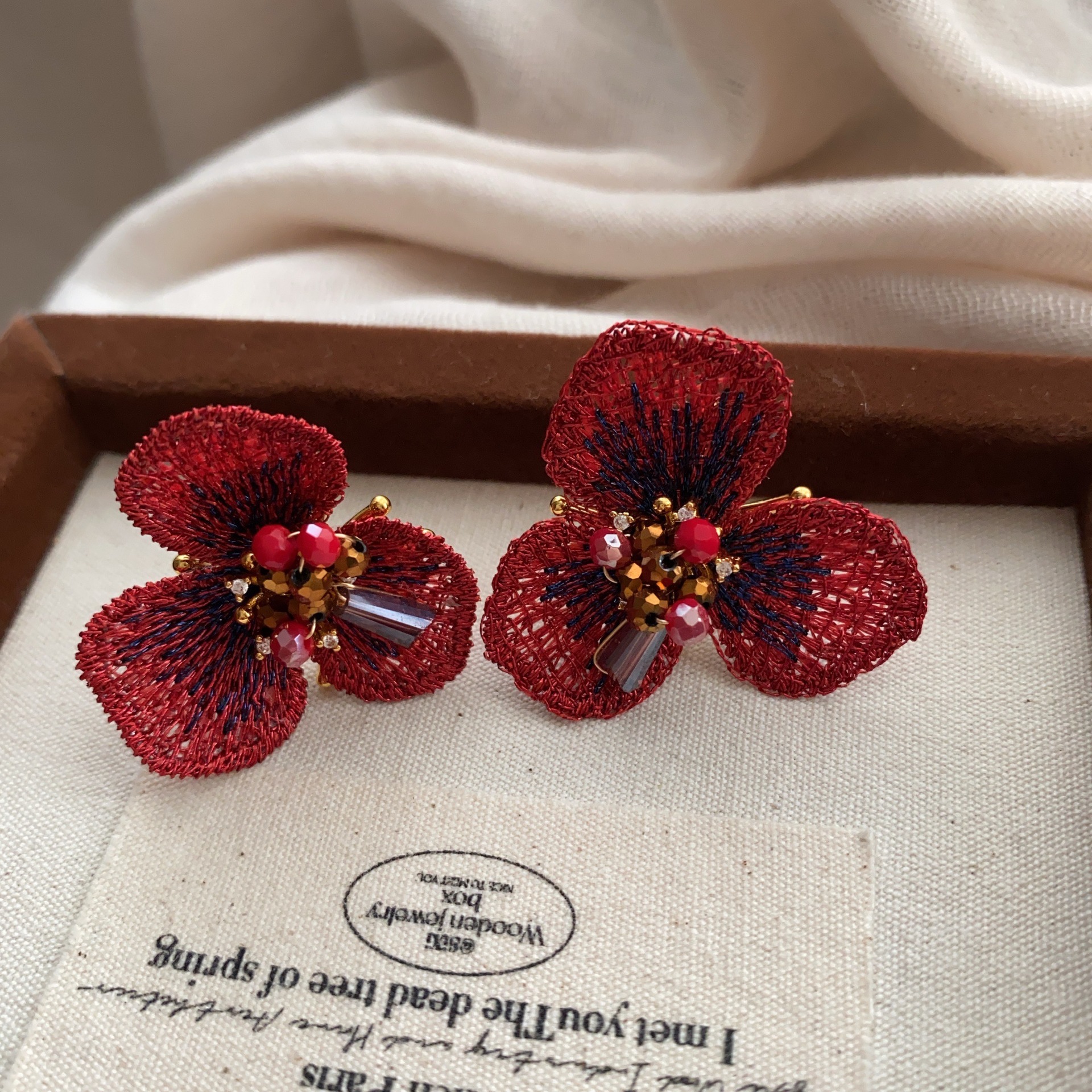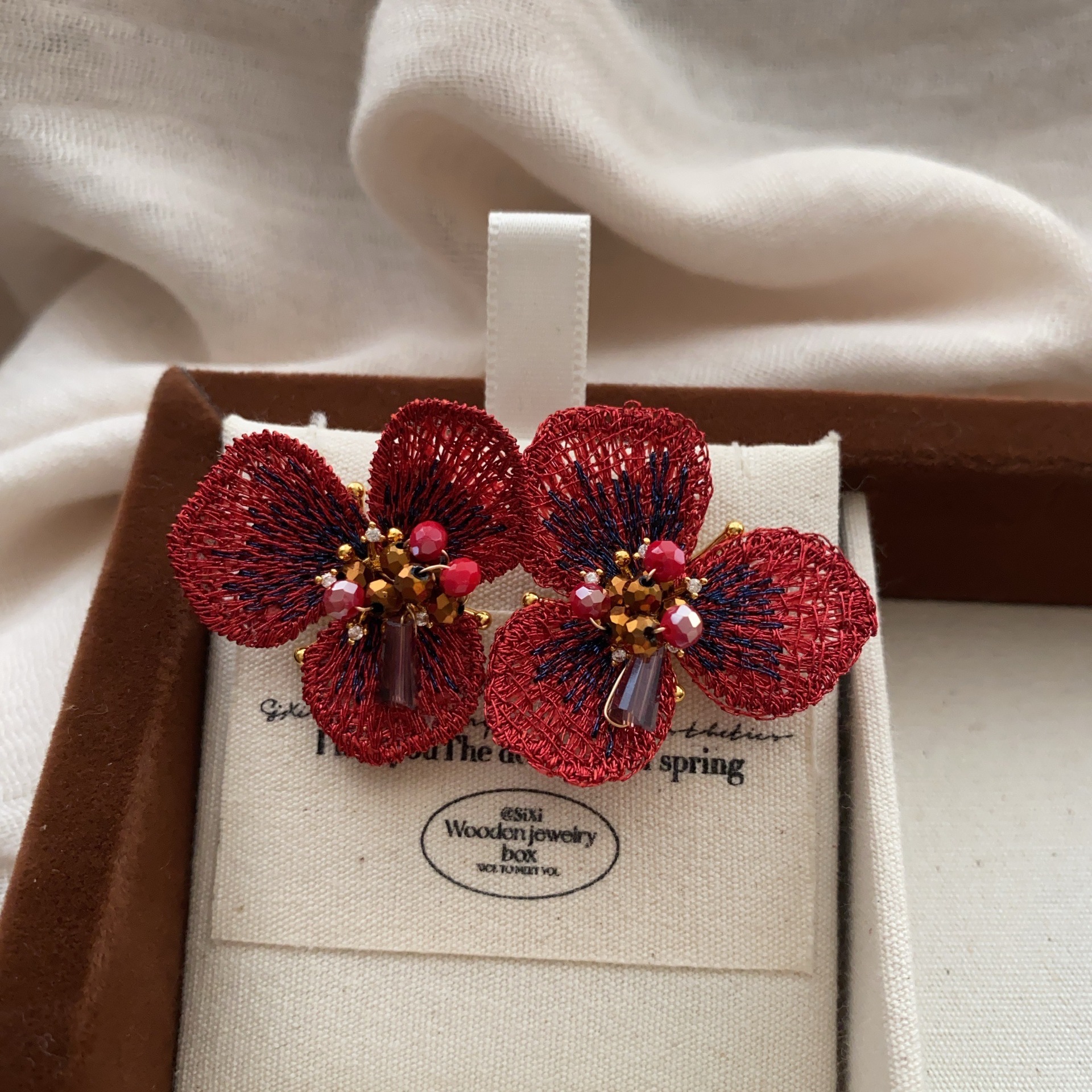 红色渐变花朵耳钉耳环手工钩花精致高级小众时髦新款清透气质耳饰
