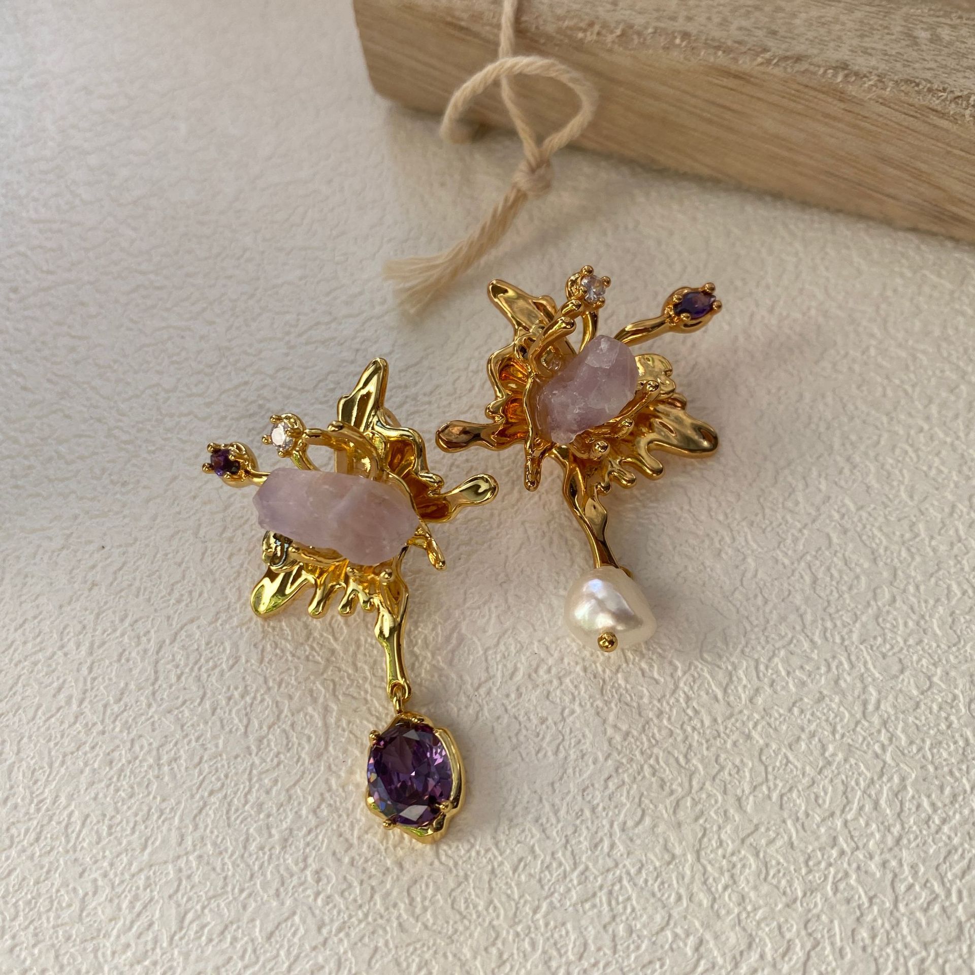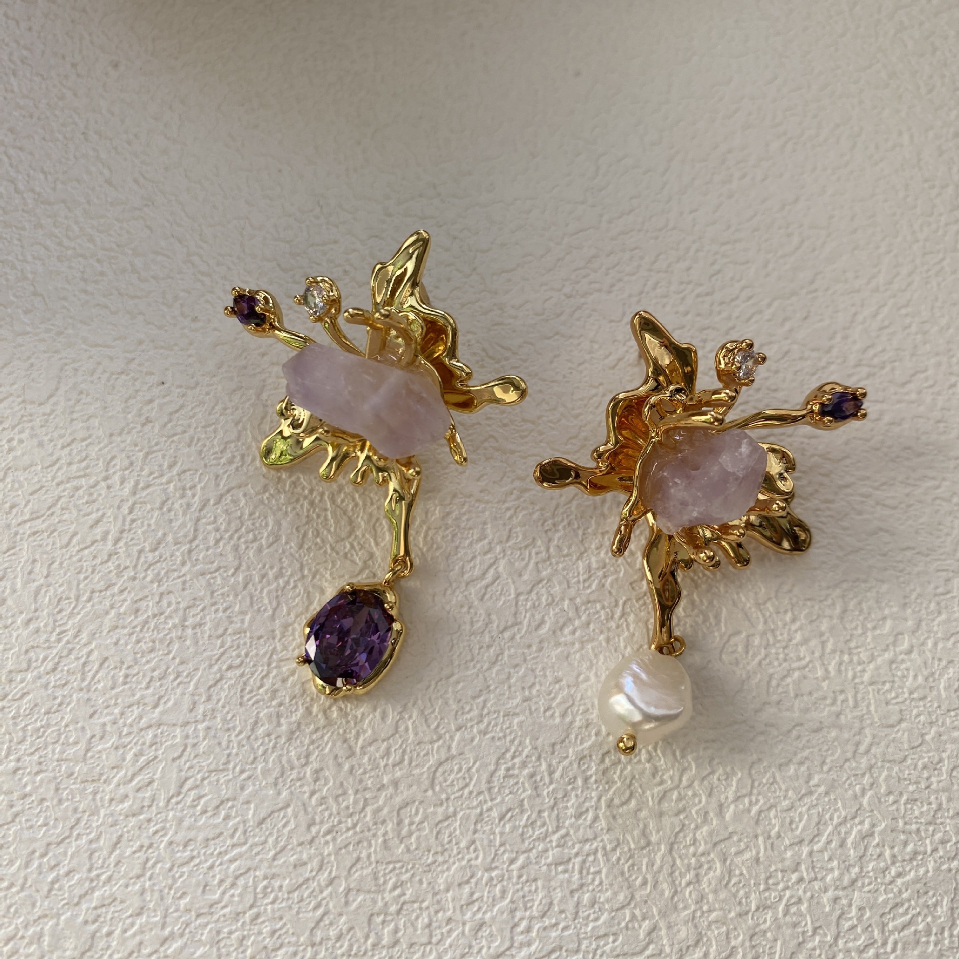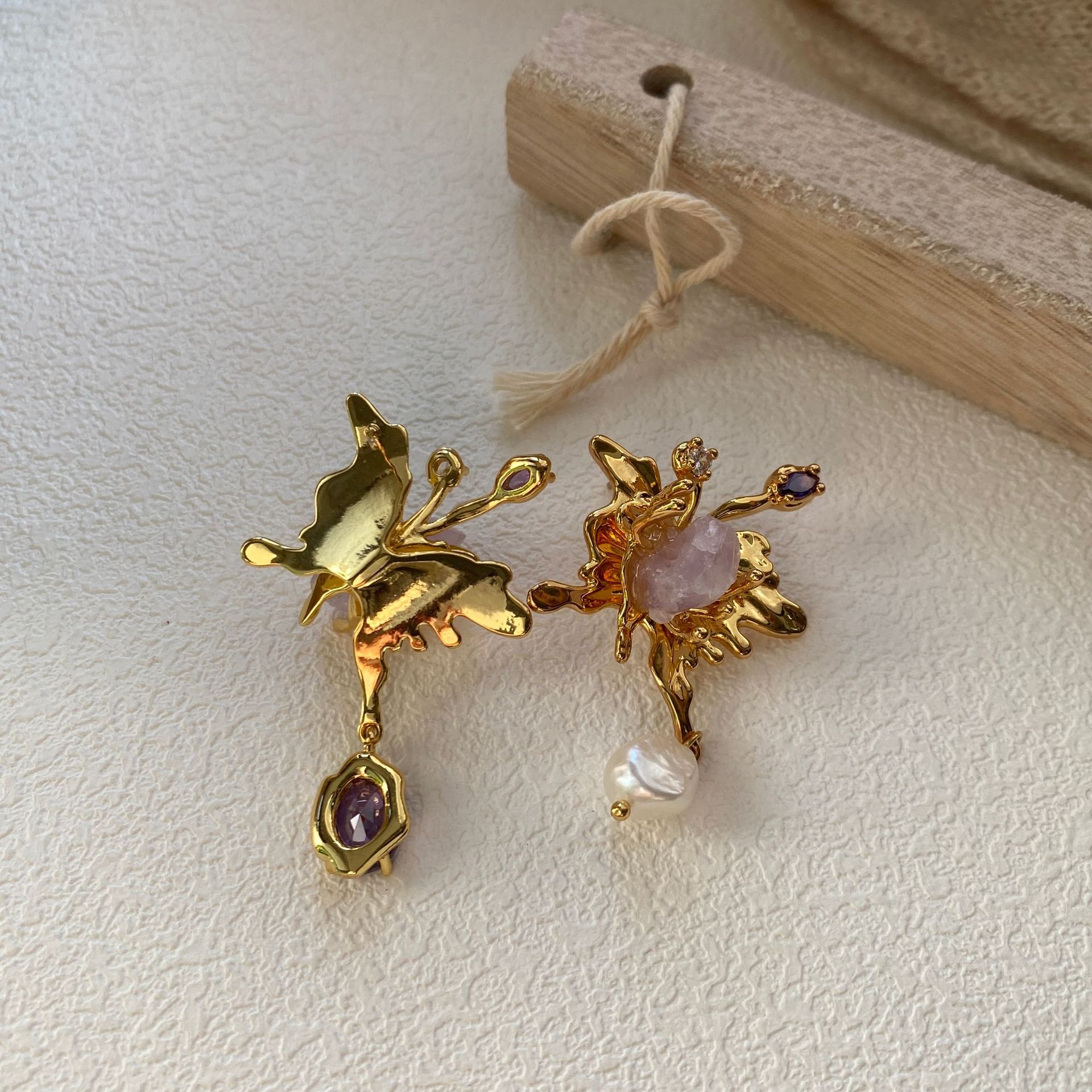 欧美设计伏光复古系列不对称紫晶石锆石珍珠蝴蝶耳环耳钉耳饰女