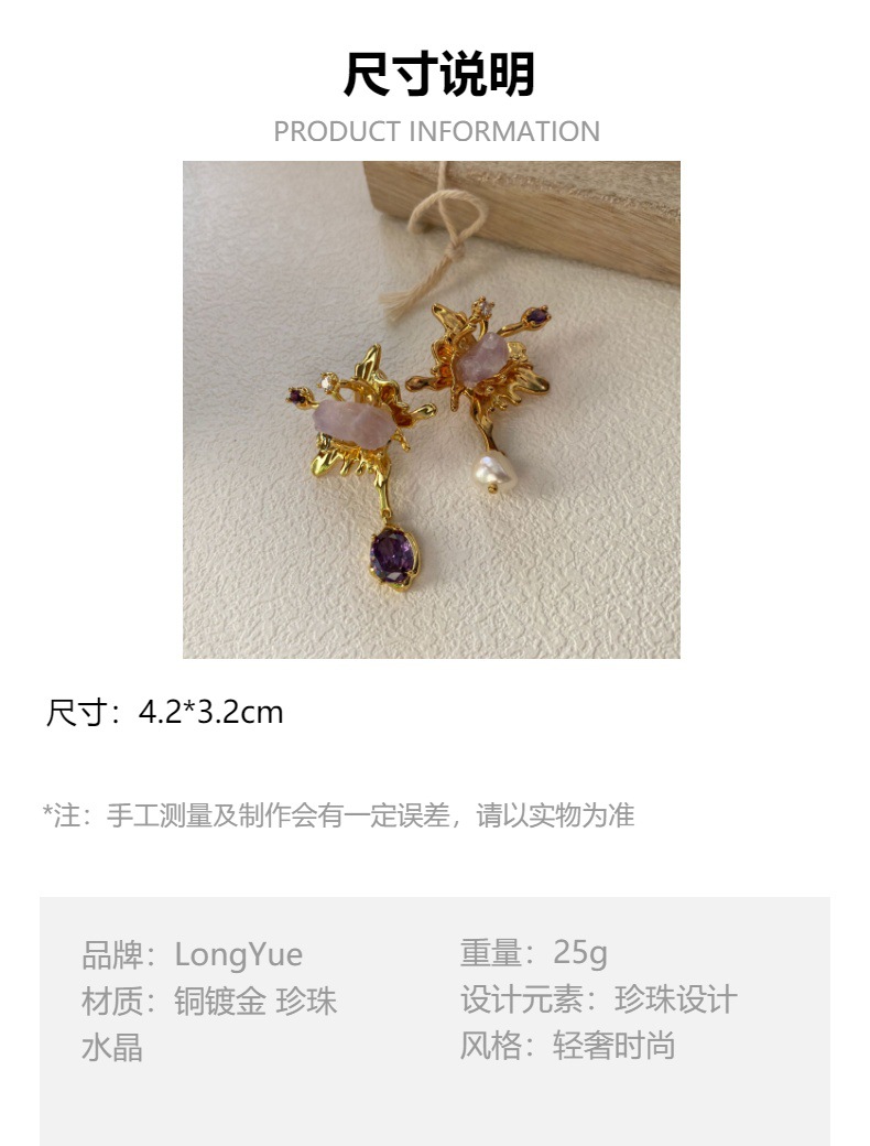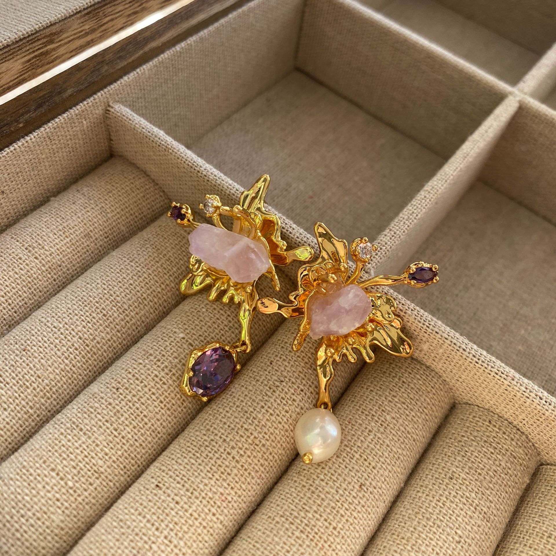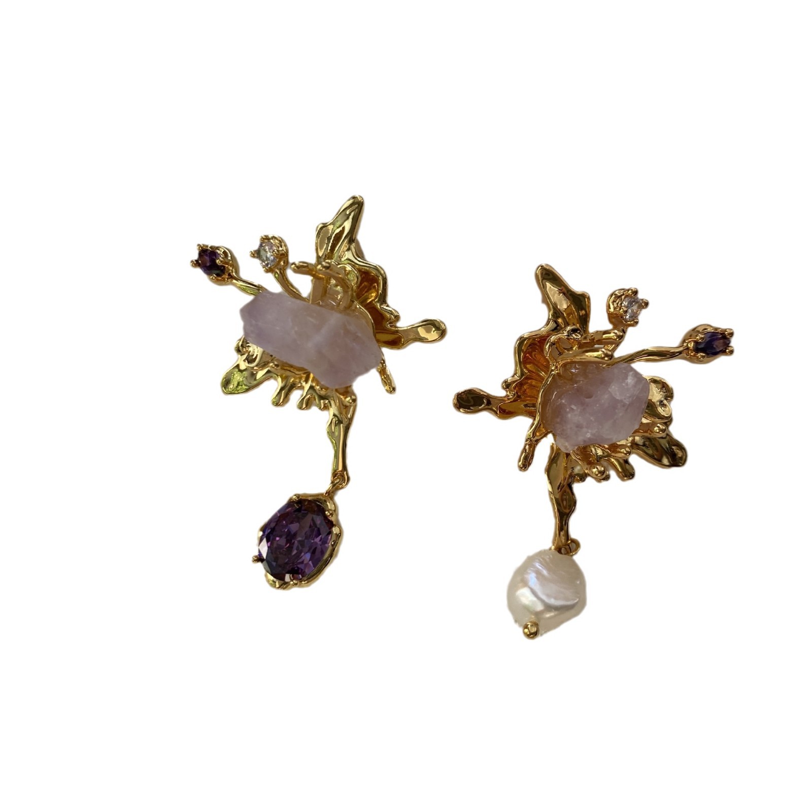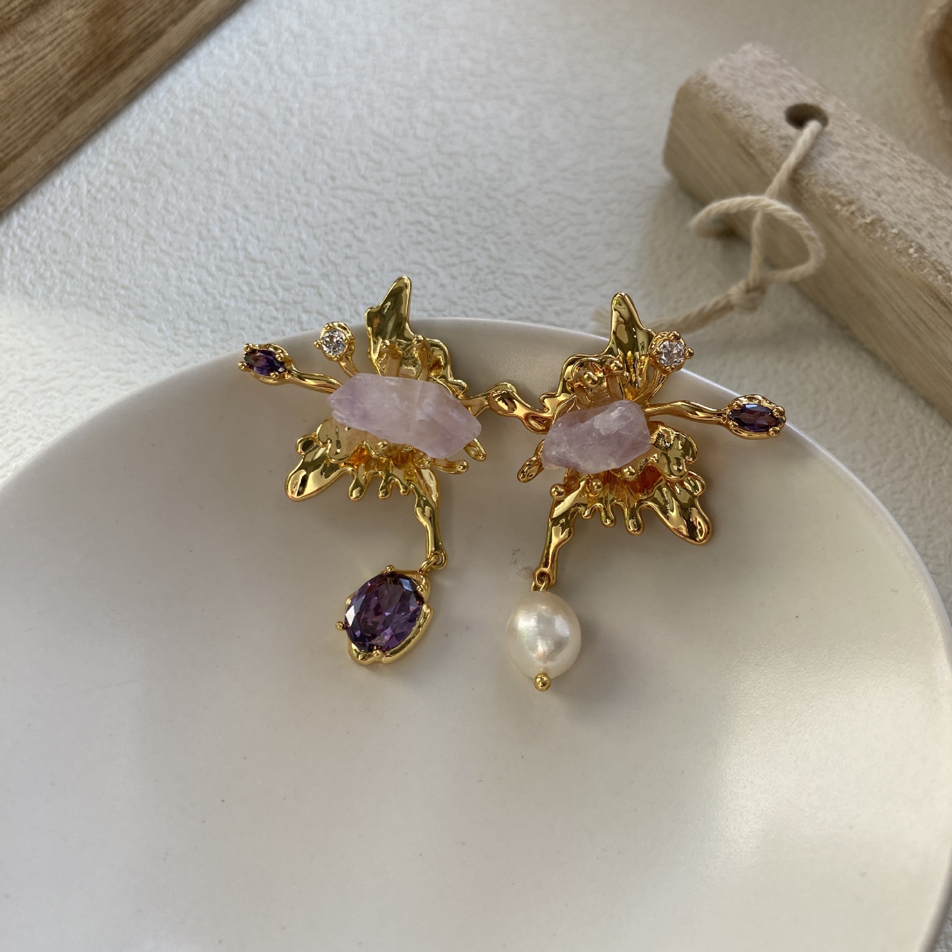 欧美设计伏光复古系列不对称紫晶石锆石珍珠蝴蝶耳环耳钉耳饰女
