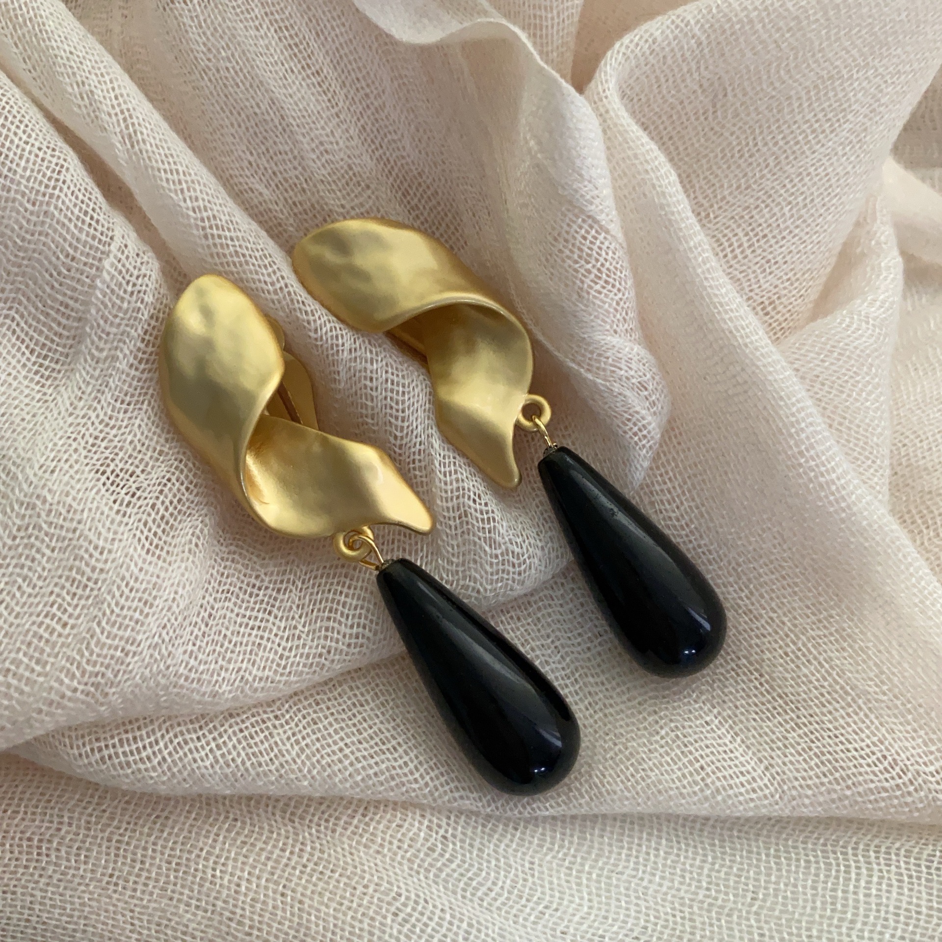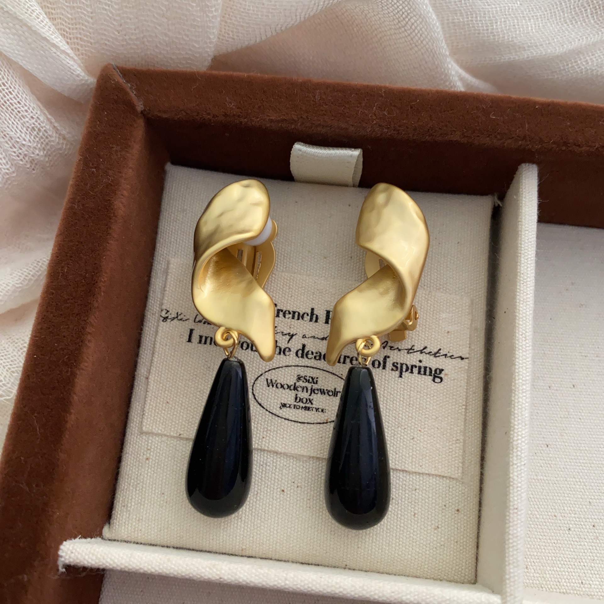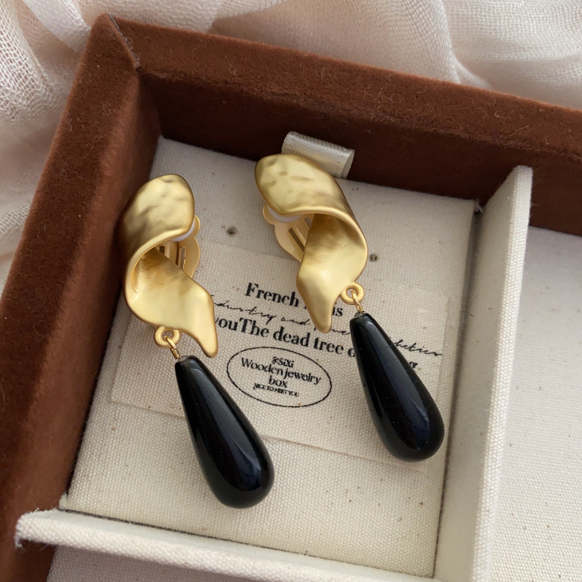 复古艺术螺旋长水滴耳夹黑玛瑙气质耳环夸张显脸小无耳洞法式耳饰