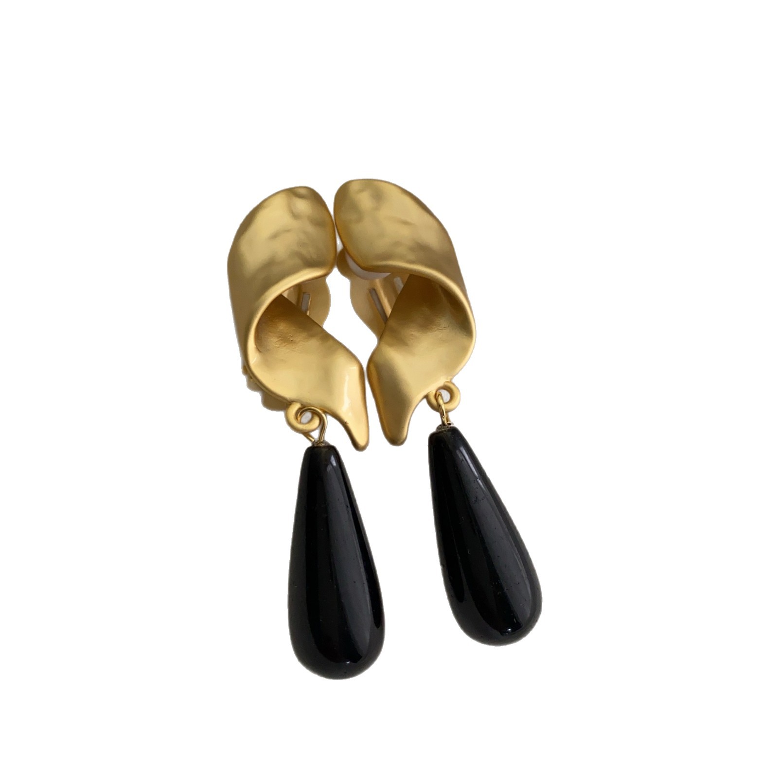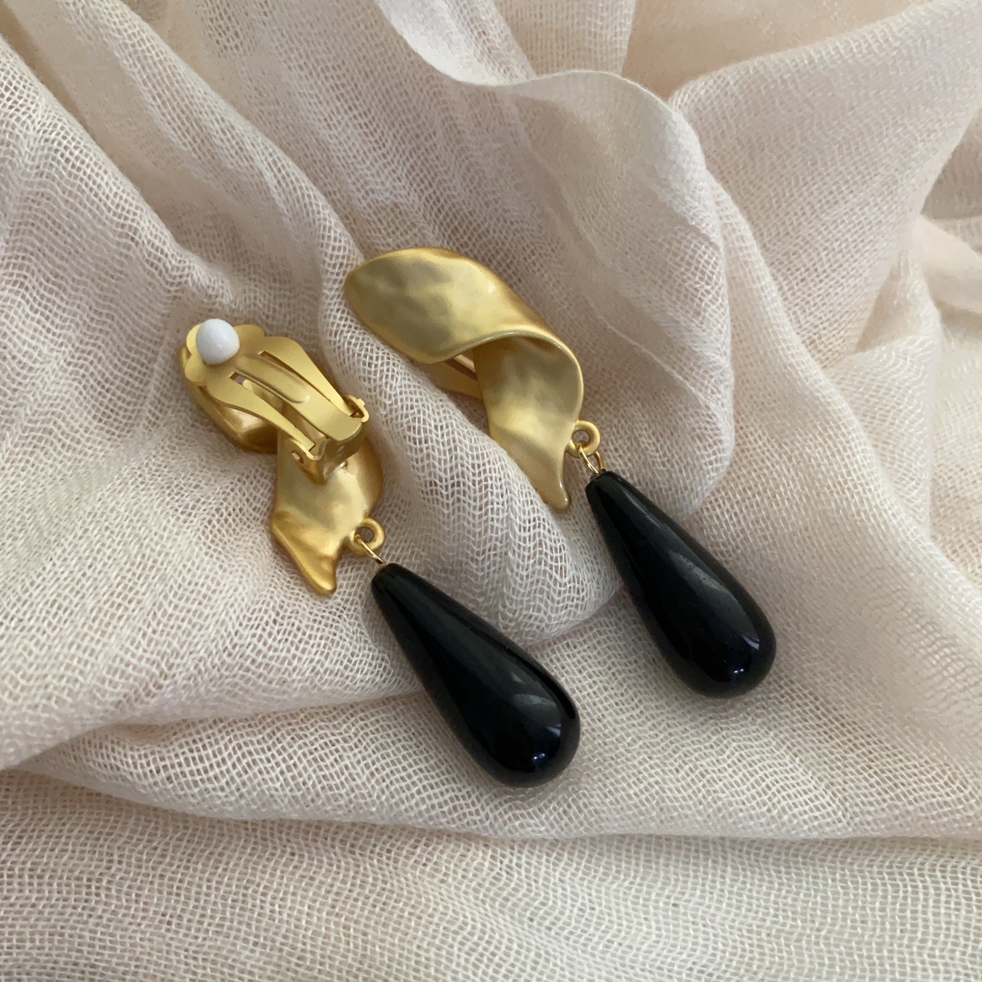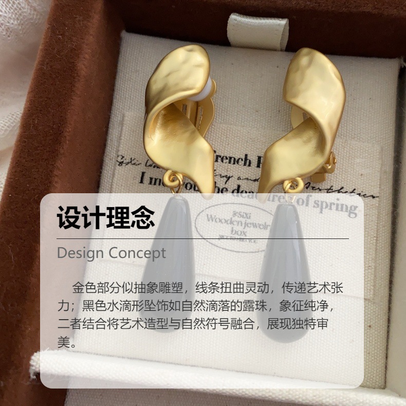 复古艺术螺旋长水滴耳夹黑玛瑙气质耳环夸张显脸小无耳洞法式耳饰