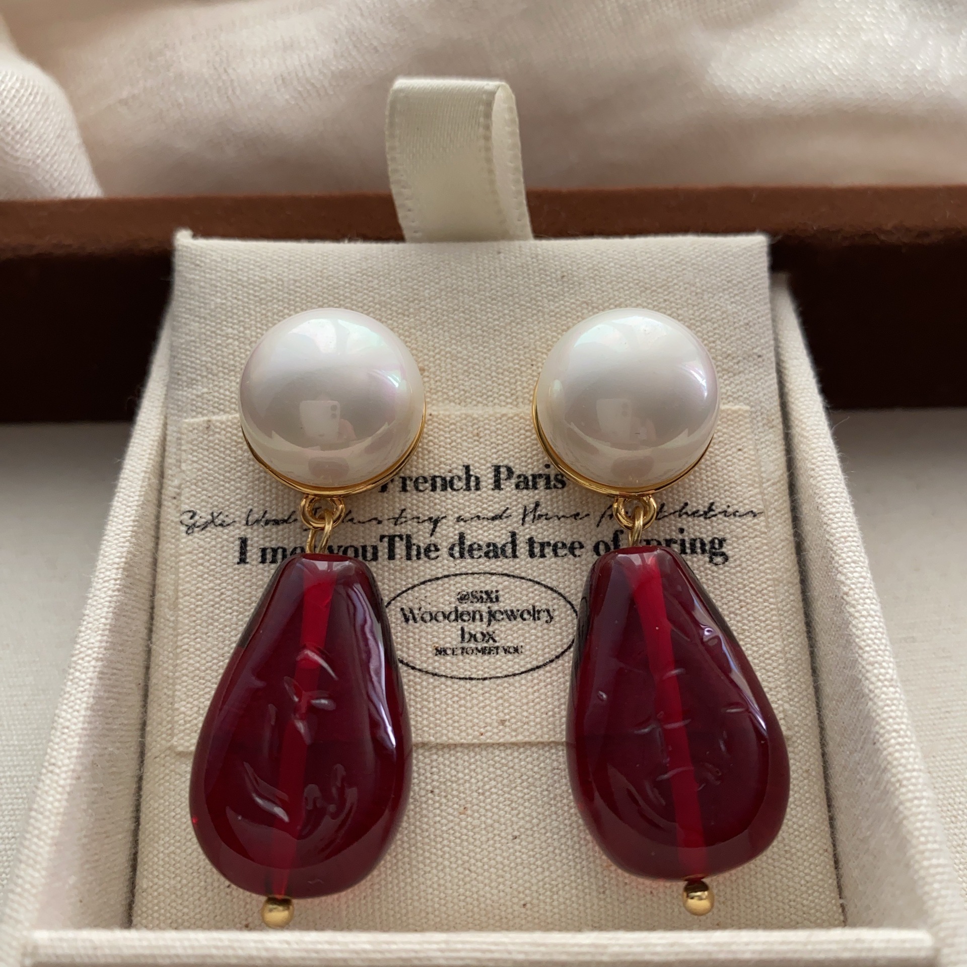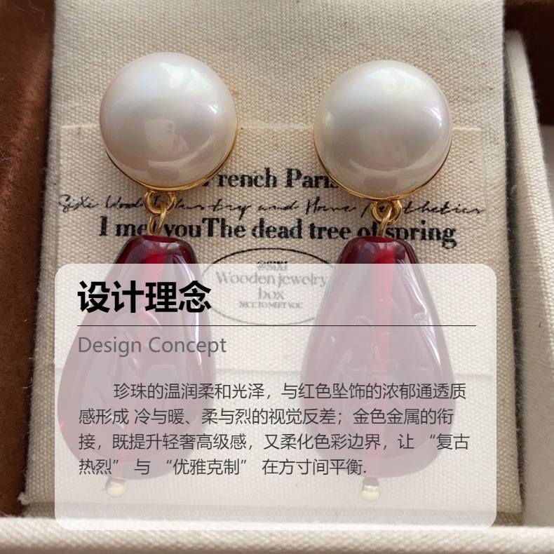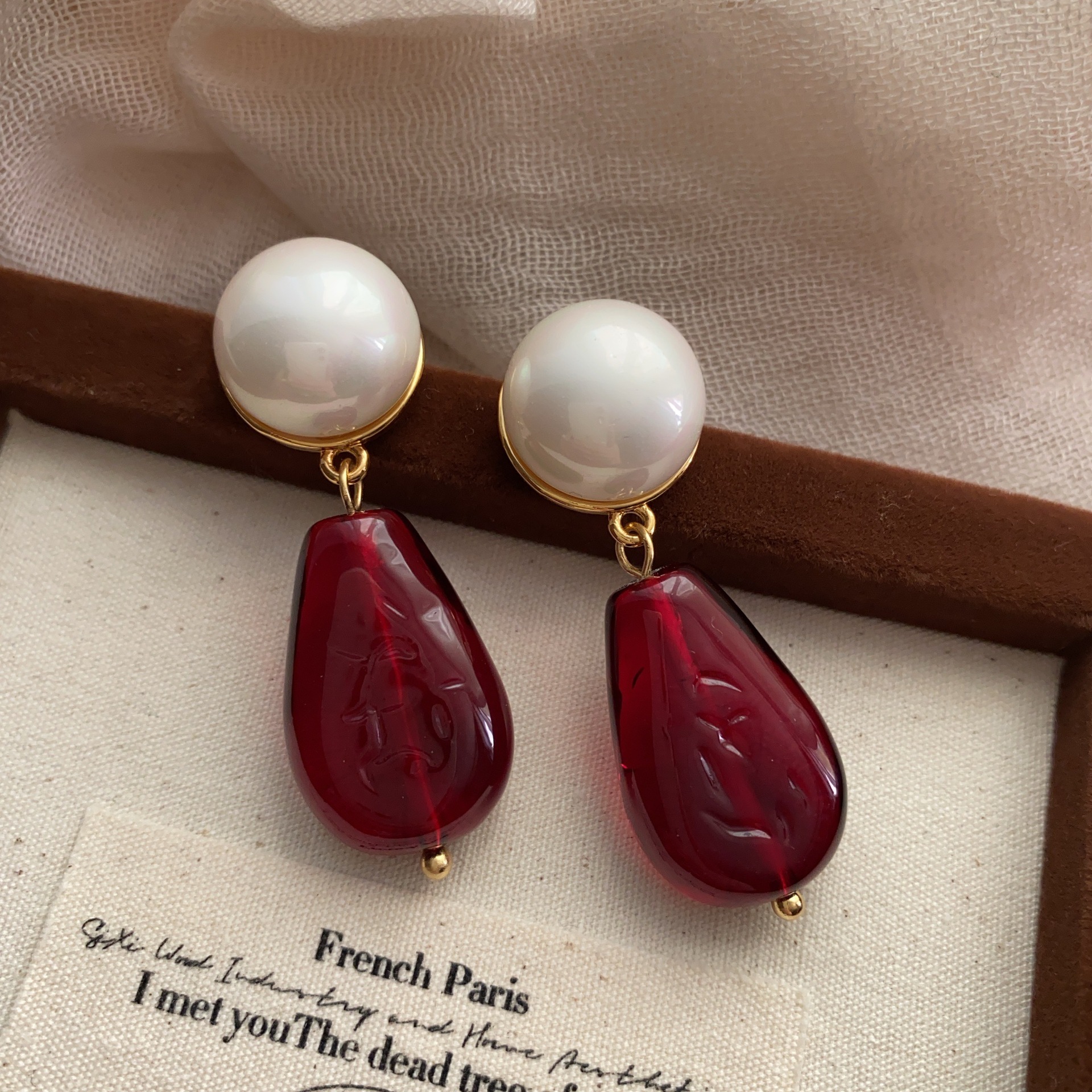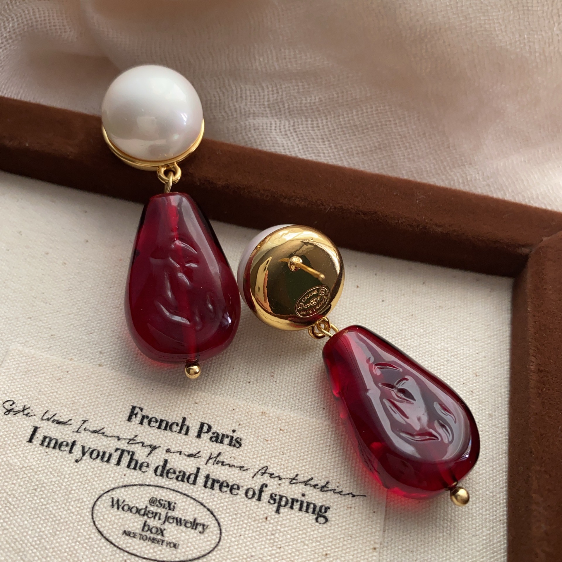 宫廷复古水滴珍珠耳钉耳环小众设计个性百搭气质树脂红色优雅耳坠