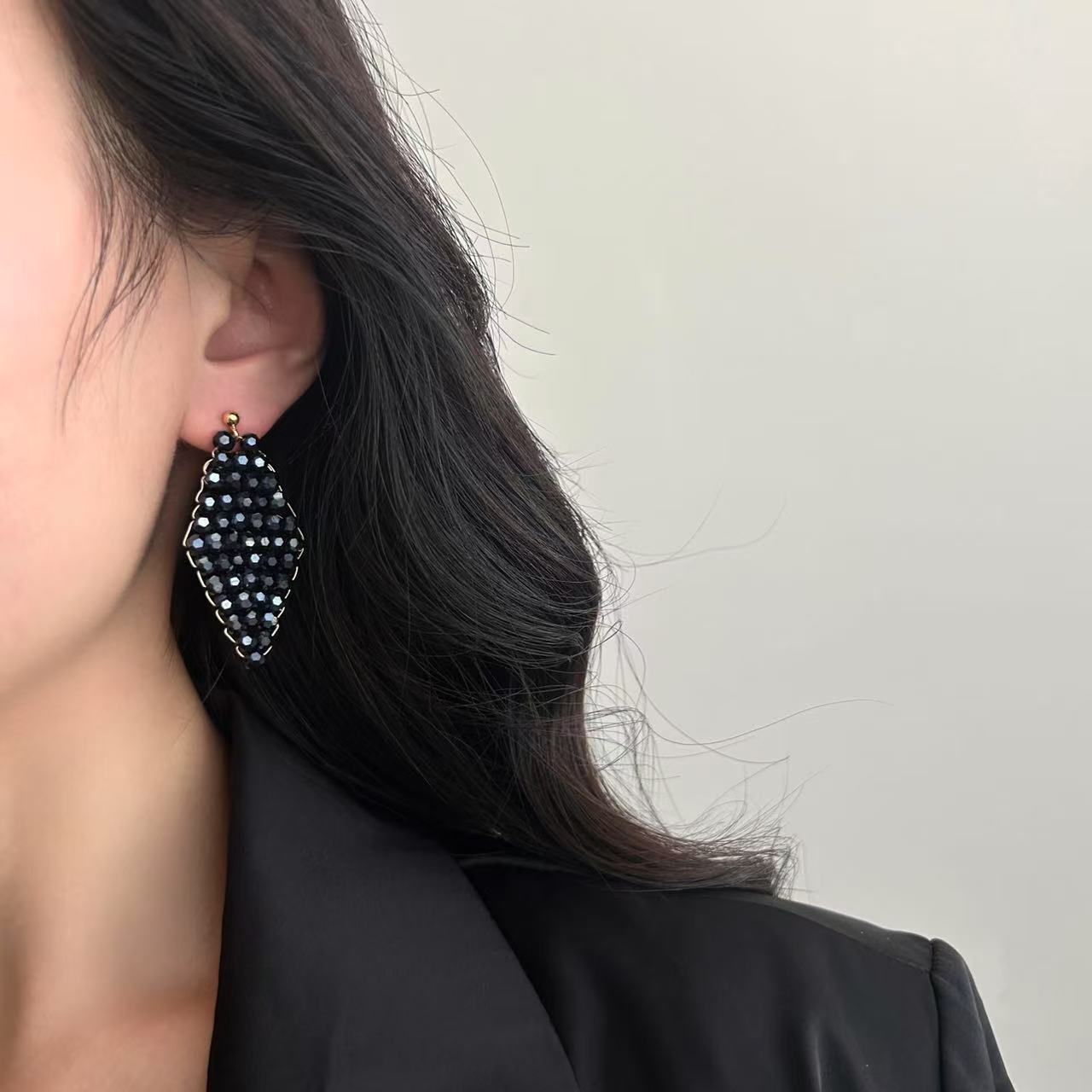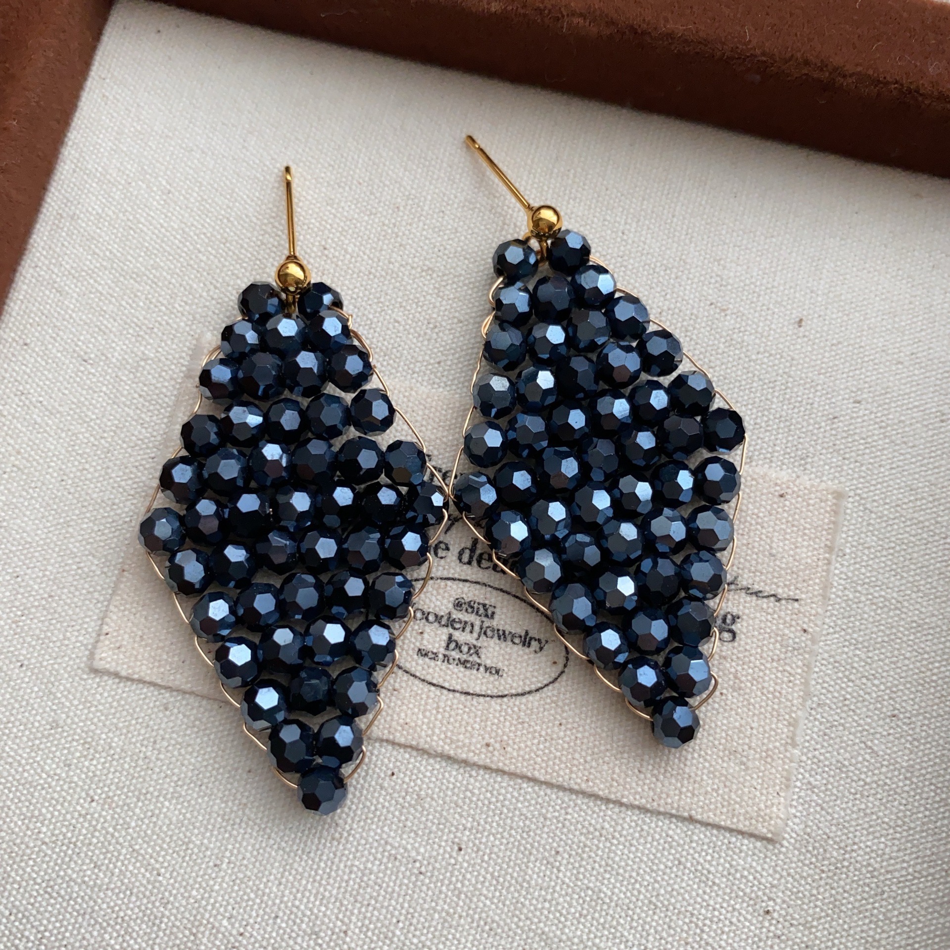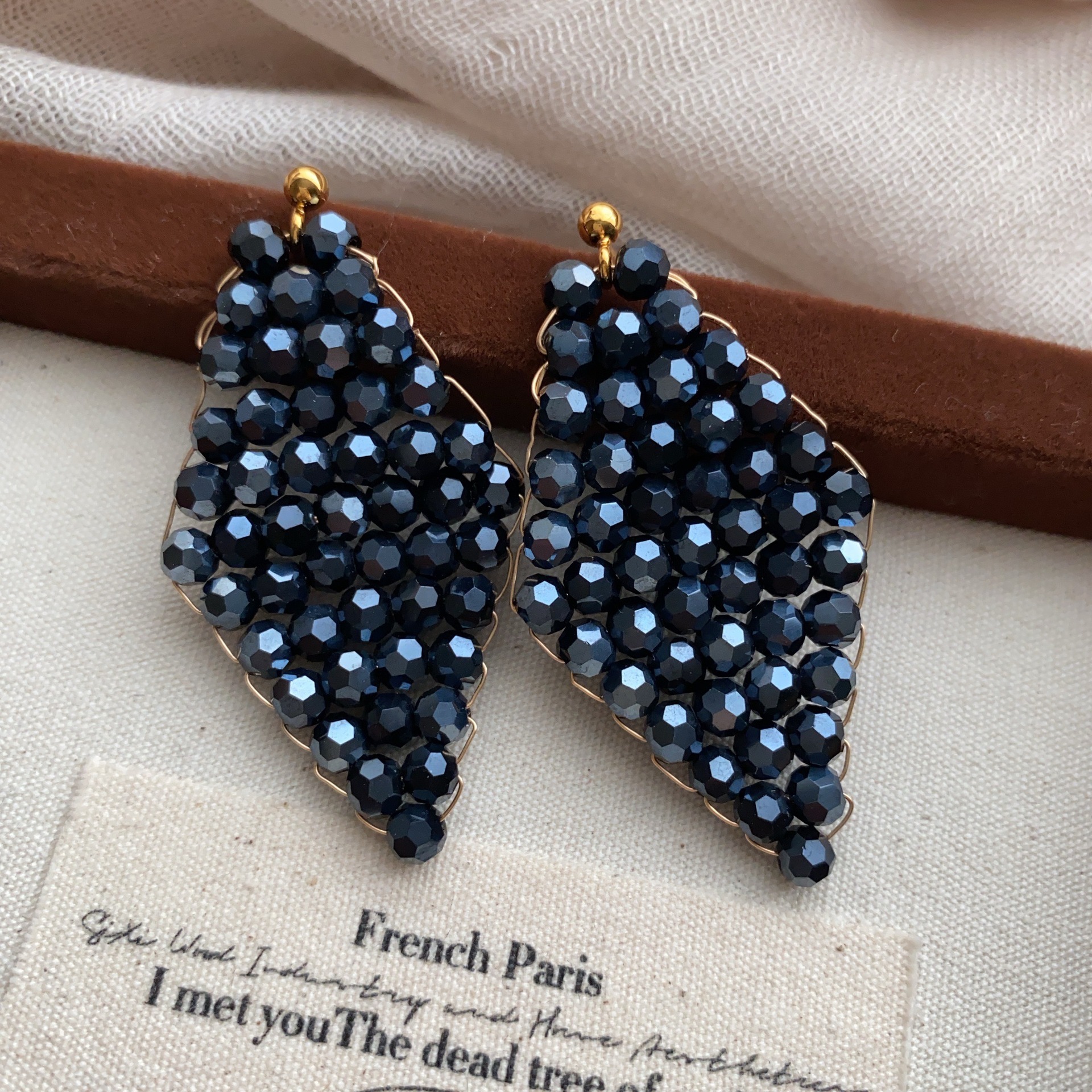 菱形手工串珠蓝色晶晶耳钉耳环轻奢精致小众时尚设计闪亮优雅耳饰