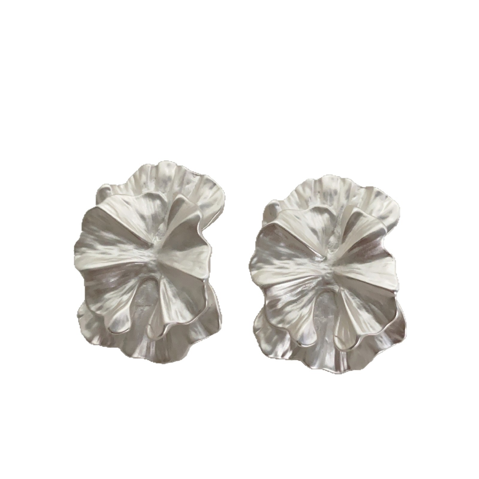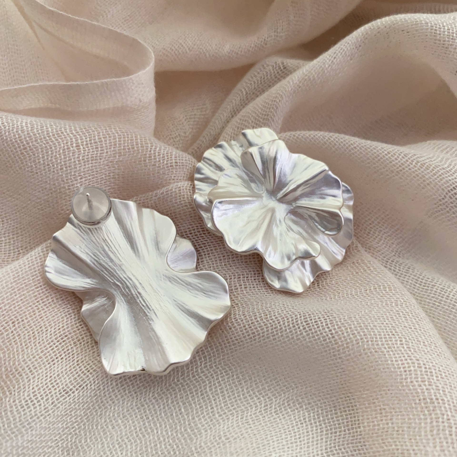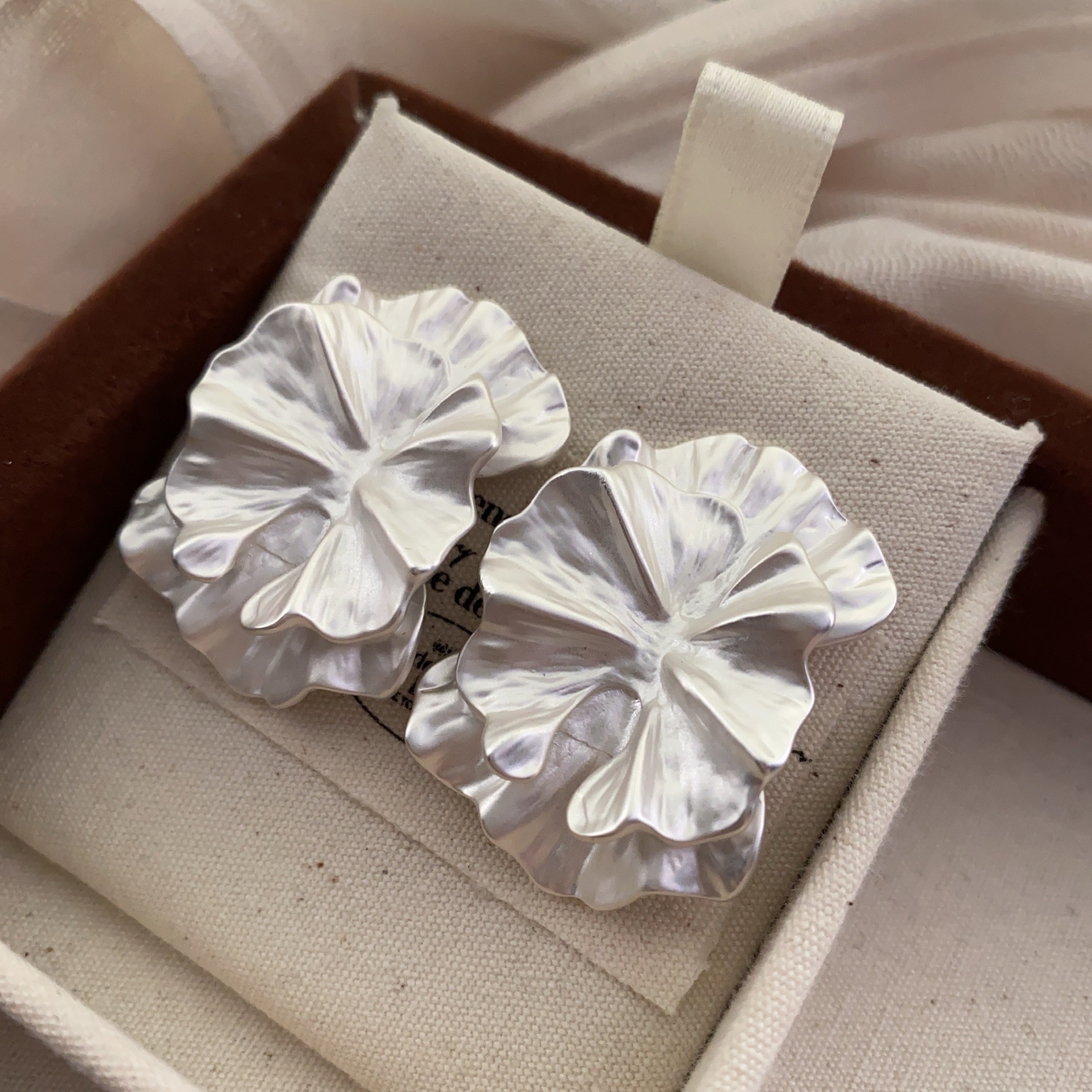 双层花奔耳环女小众设计高级感银色花掰耳钉轻奢时尚夸张气质耳饰