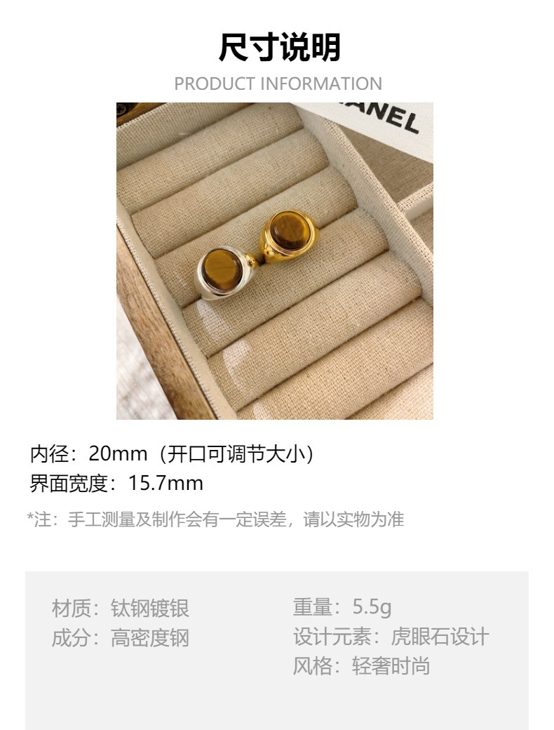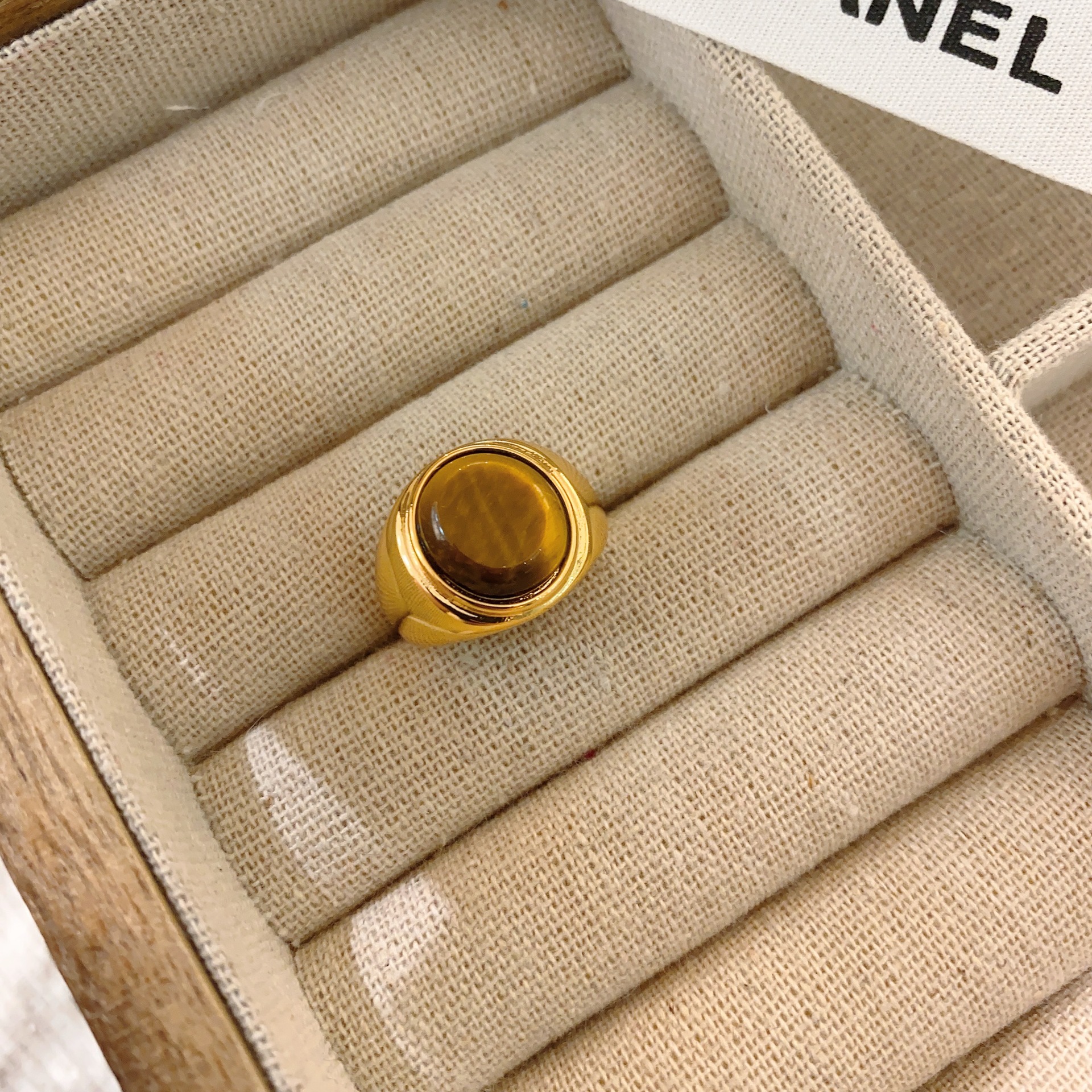 复古金色虎眼宝石中古钛钢镀18K金保色戒指独特小众设计食指指环