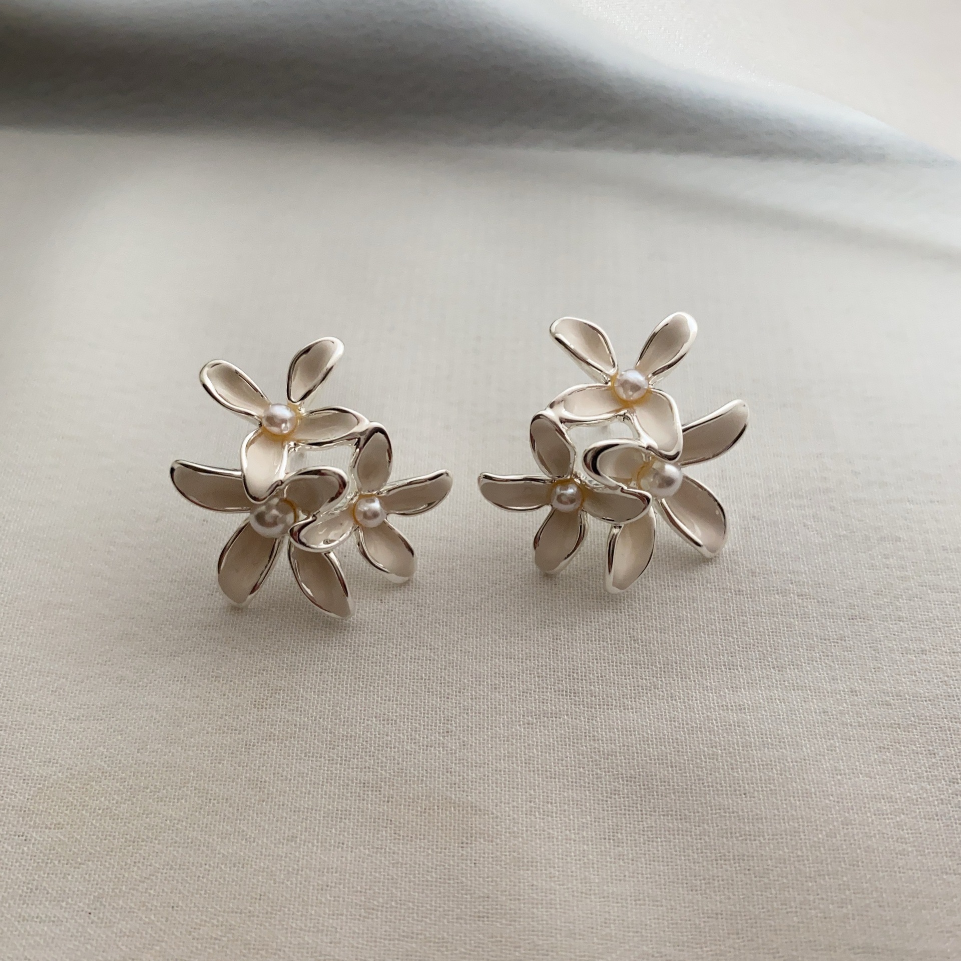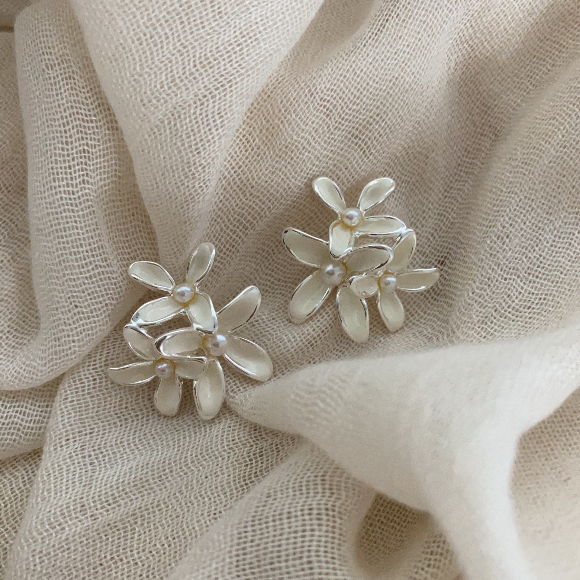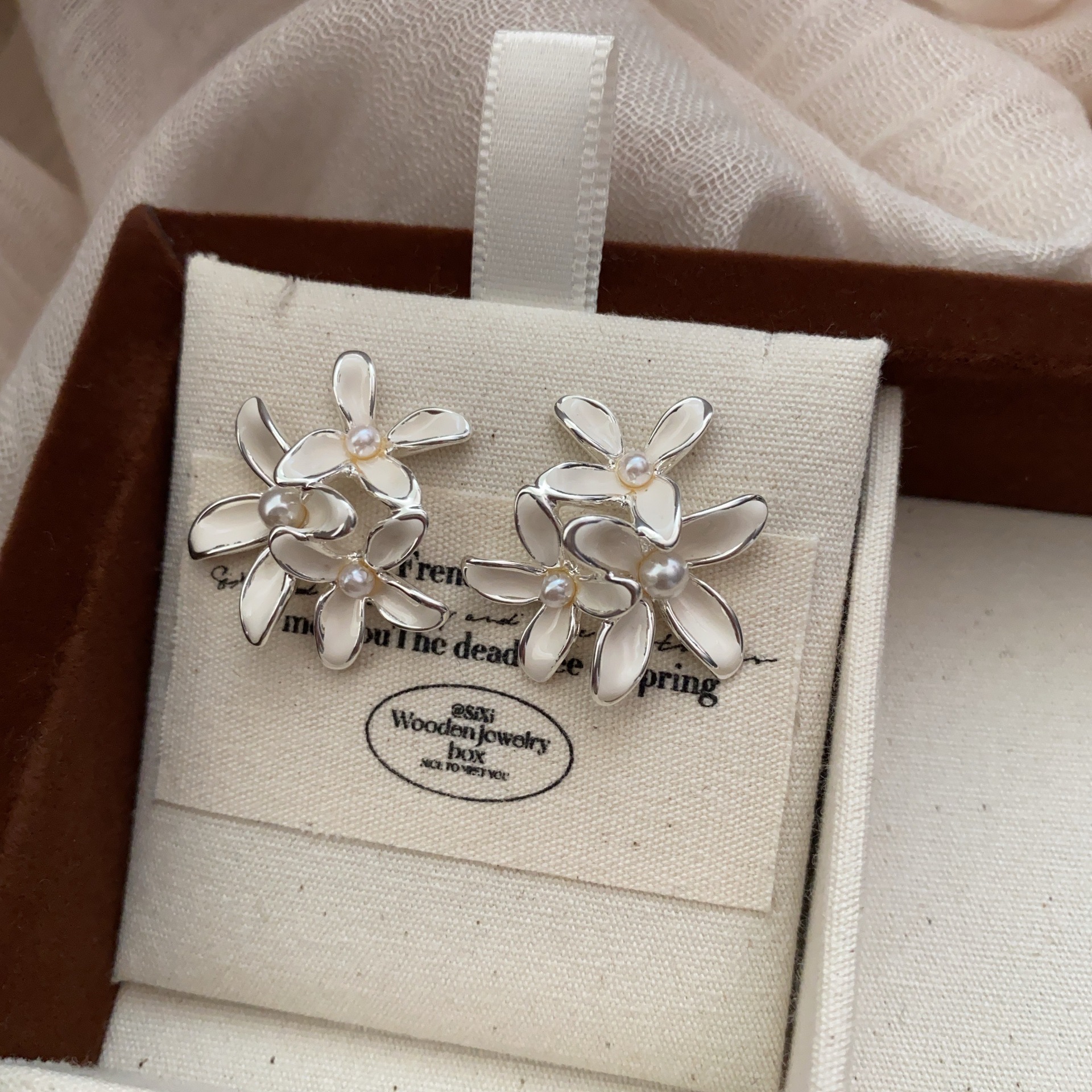 新款法式文艺复古金属珍珠花朵耳钉小众时尚百搭通勤气质耳环耳饰