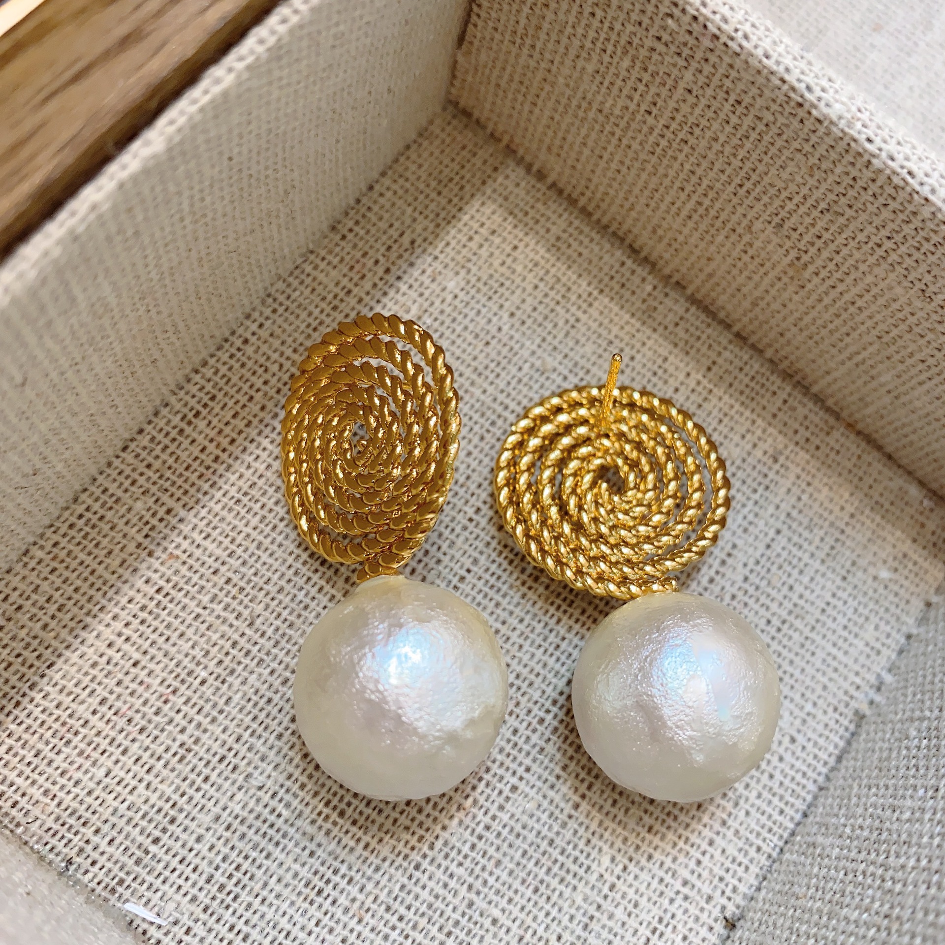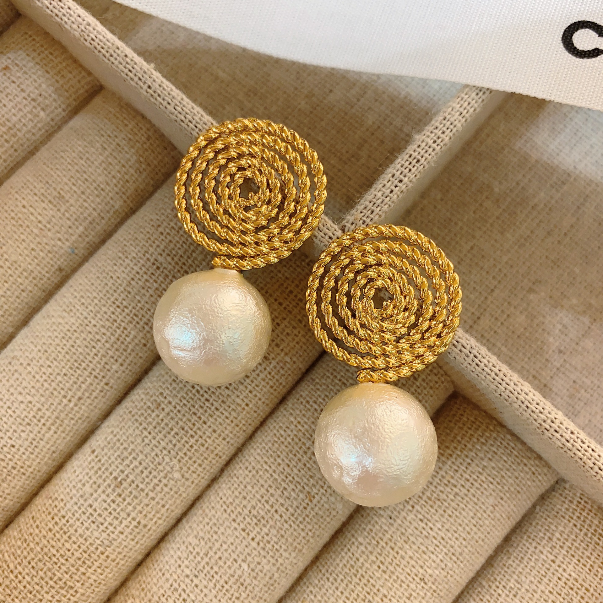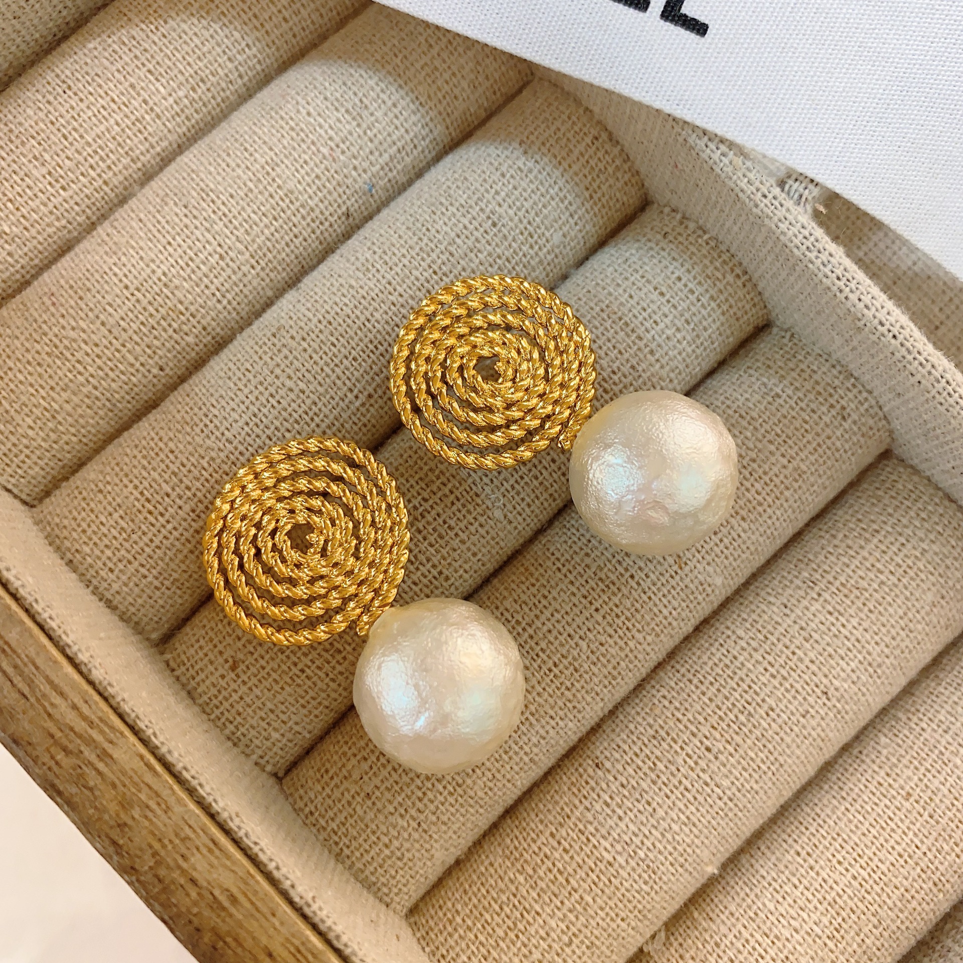 法式高级感耳环欧美新款螺旋草编织搭配棉花珍珠小众法式设计耳钉