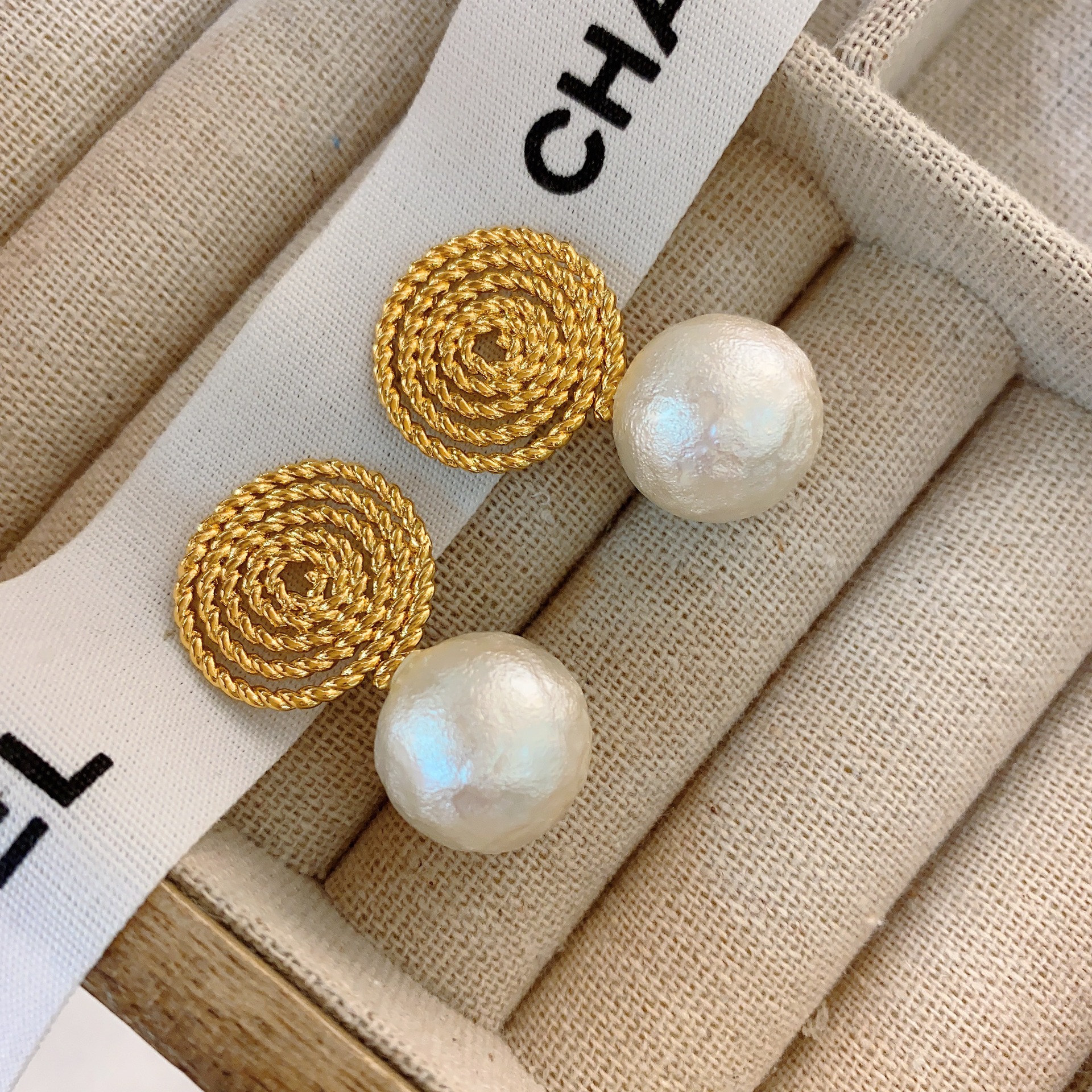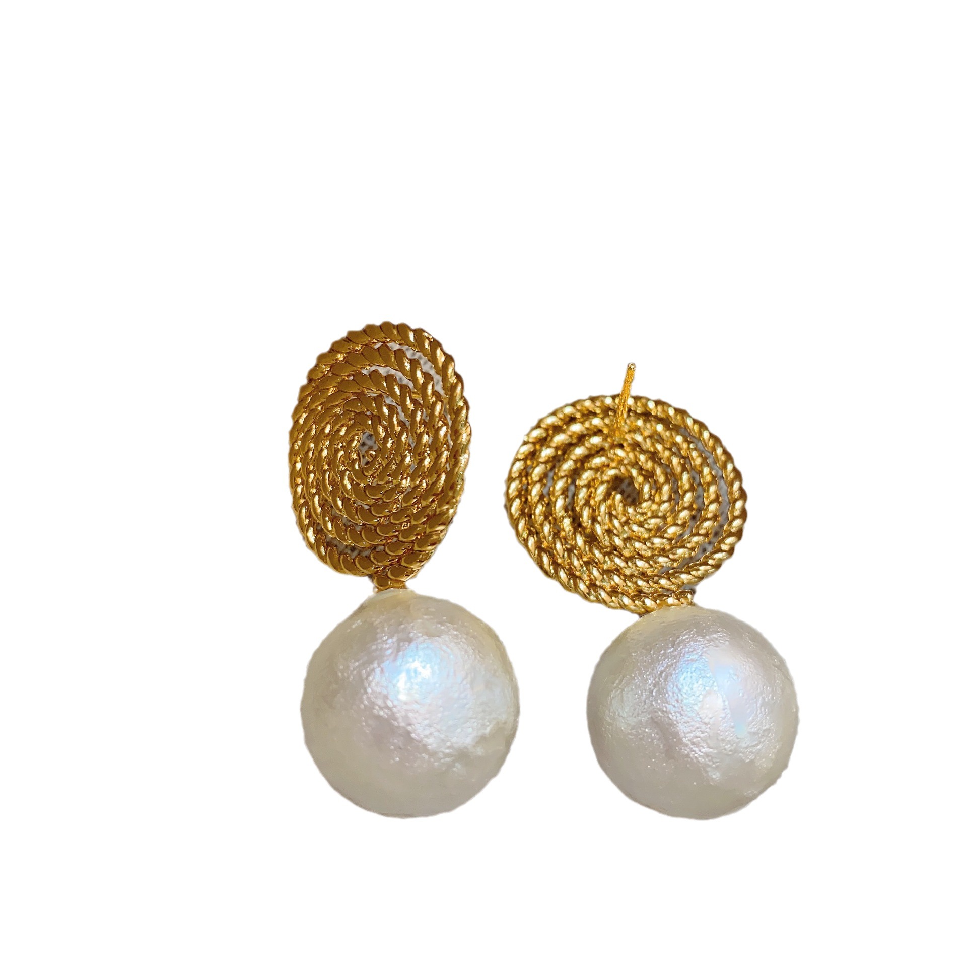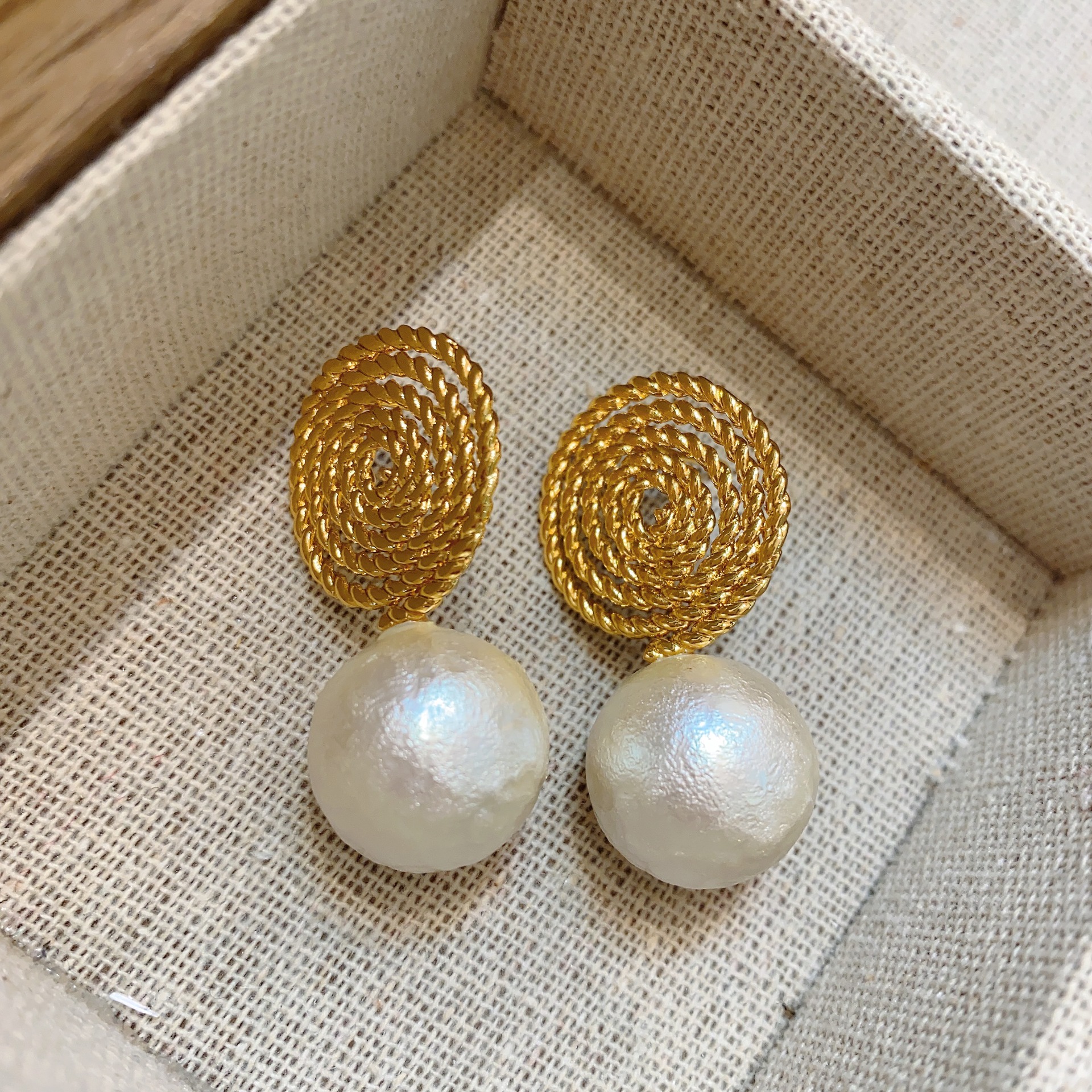 法式高级感耳环欧美新款螺旋草编织搭配棉花珍珠小众法式设计耳钉