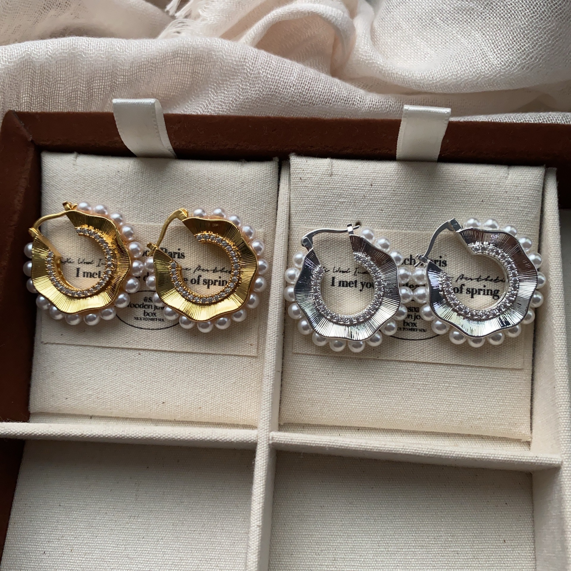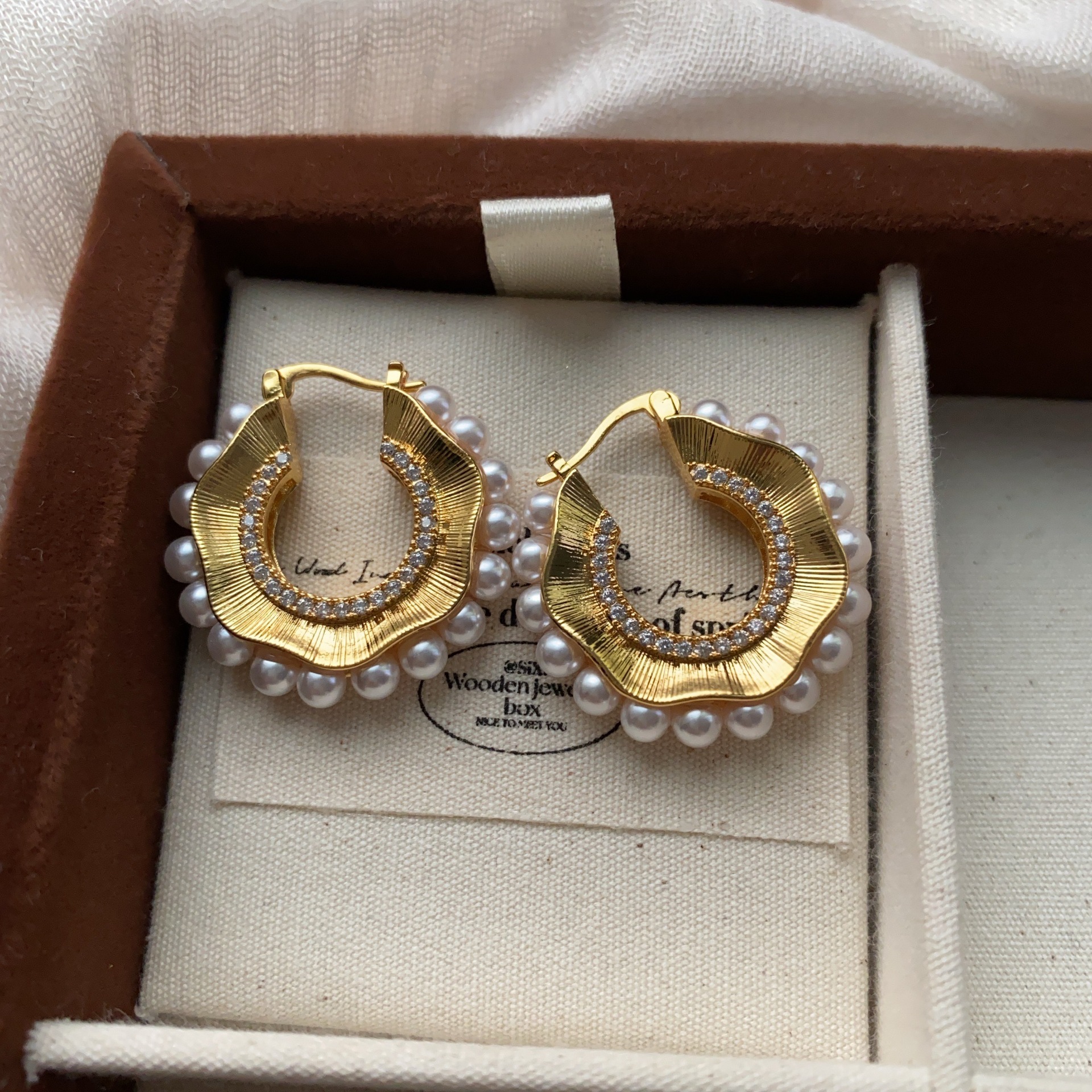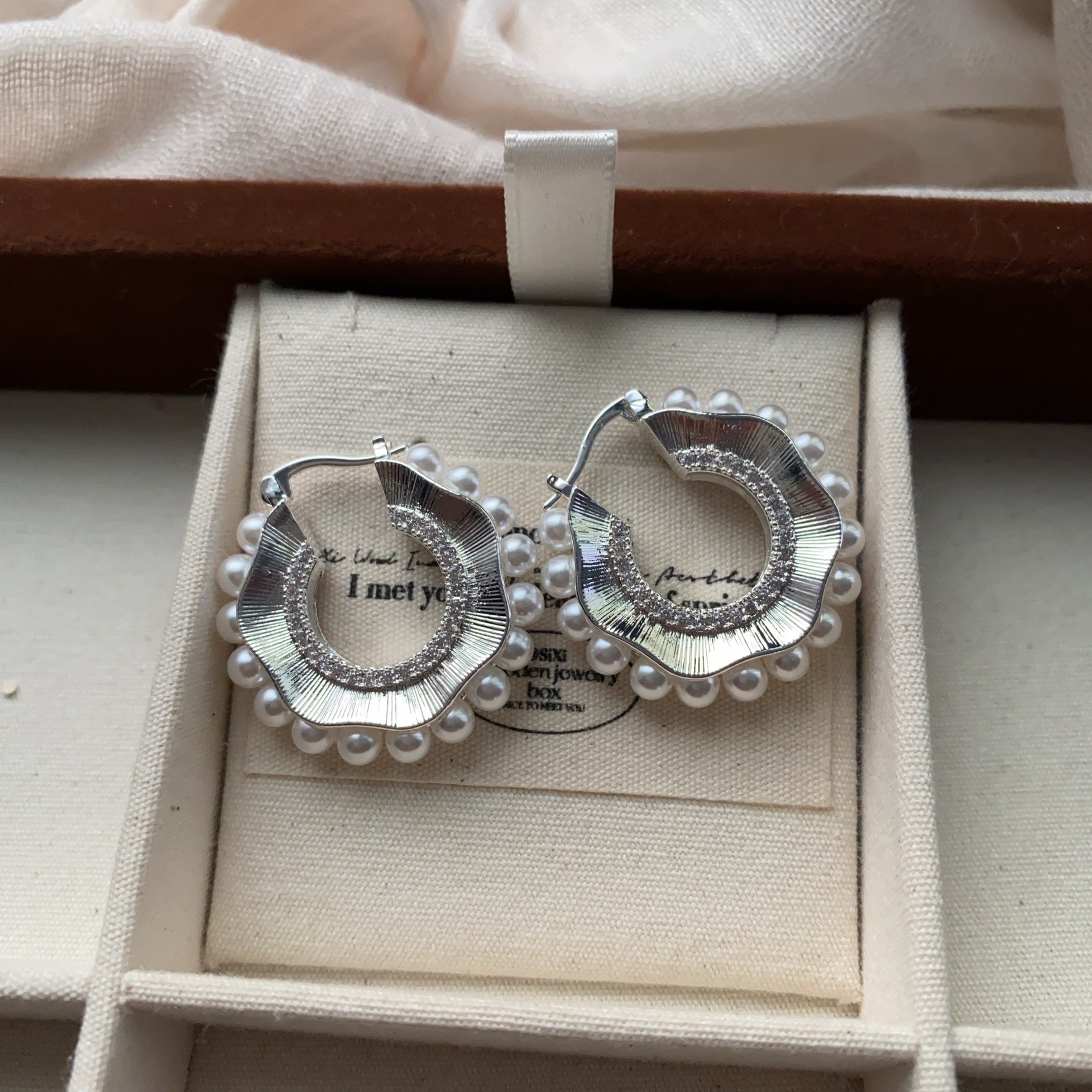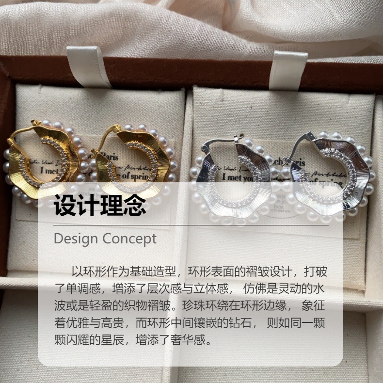 法式复古气质米粒珍珠耳环新款不规则褶皱半圆形耳饰精致气质耳钉