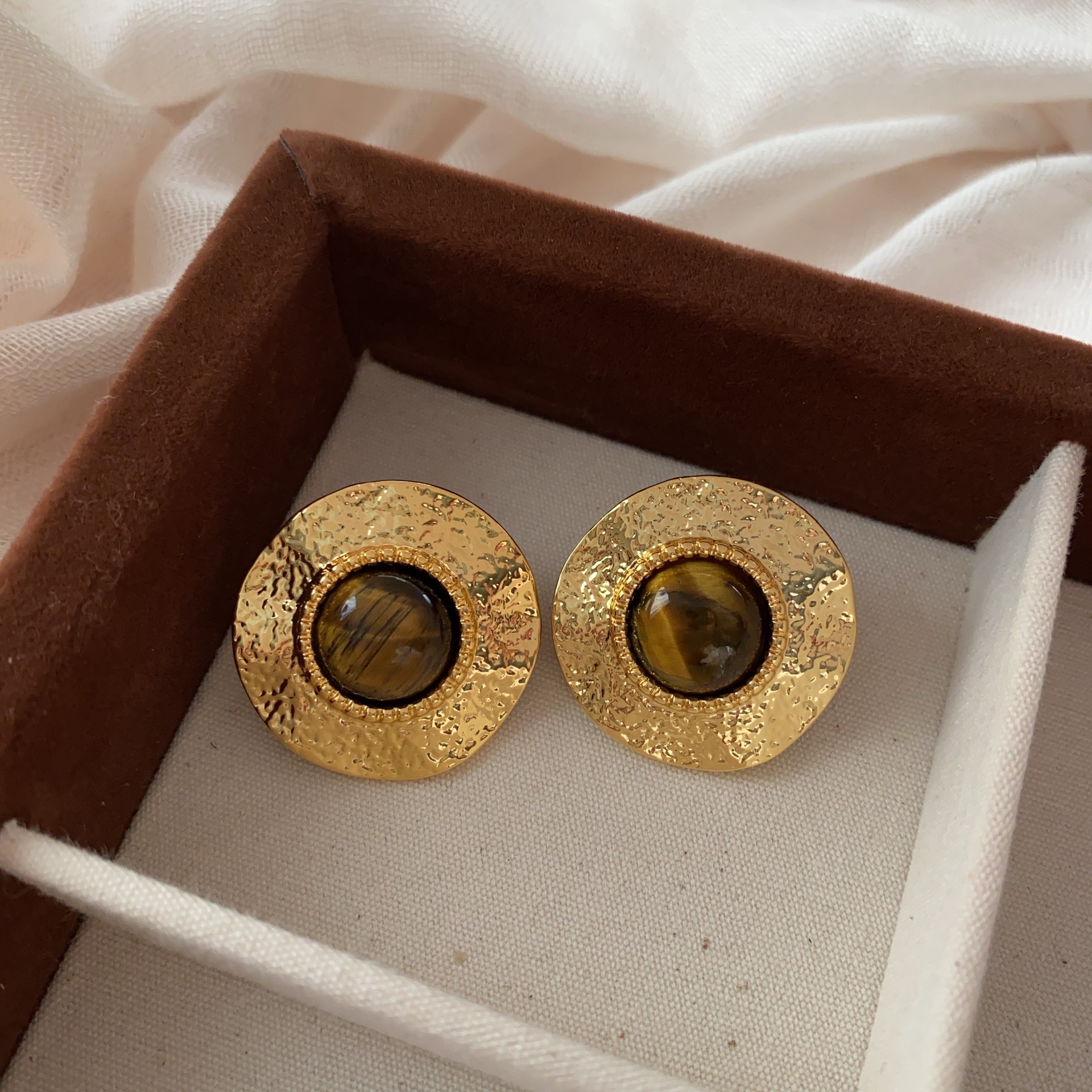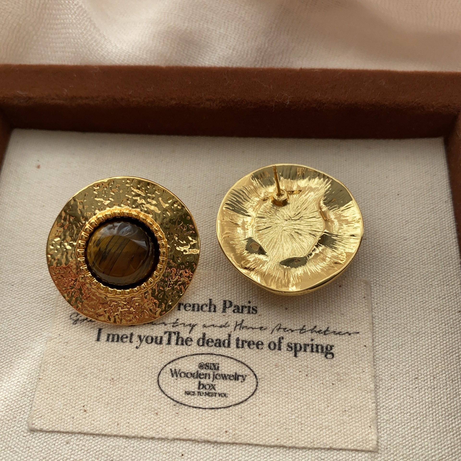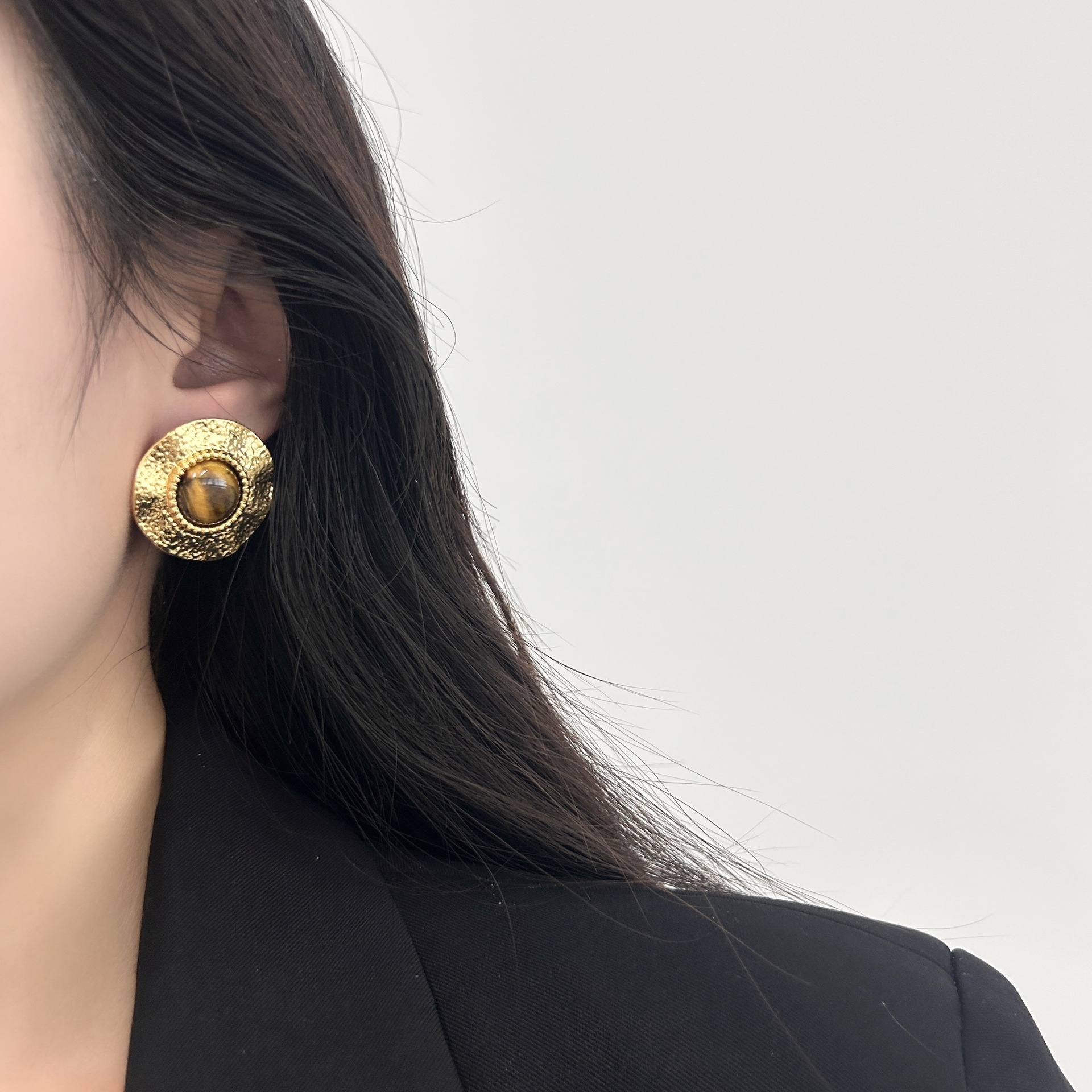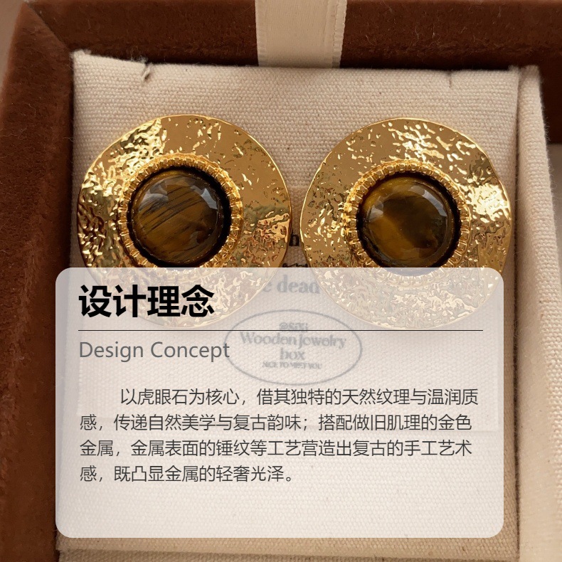 金属虎眼石耳钉耳环复古耳环小众肌理锤纹冷冽光泽轻奢百搭独特感