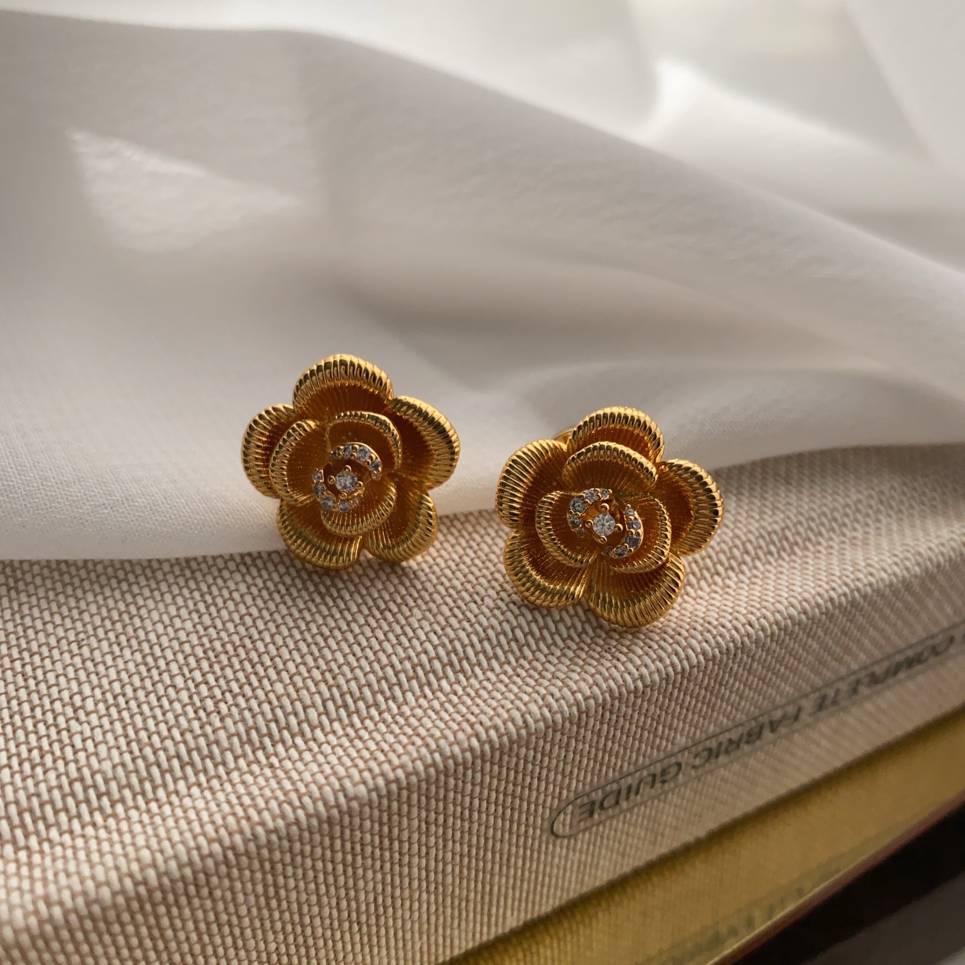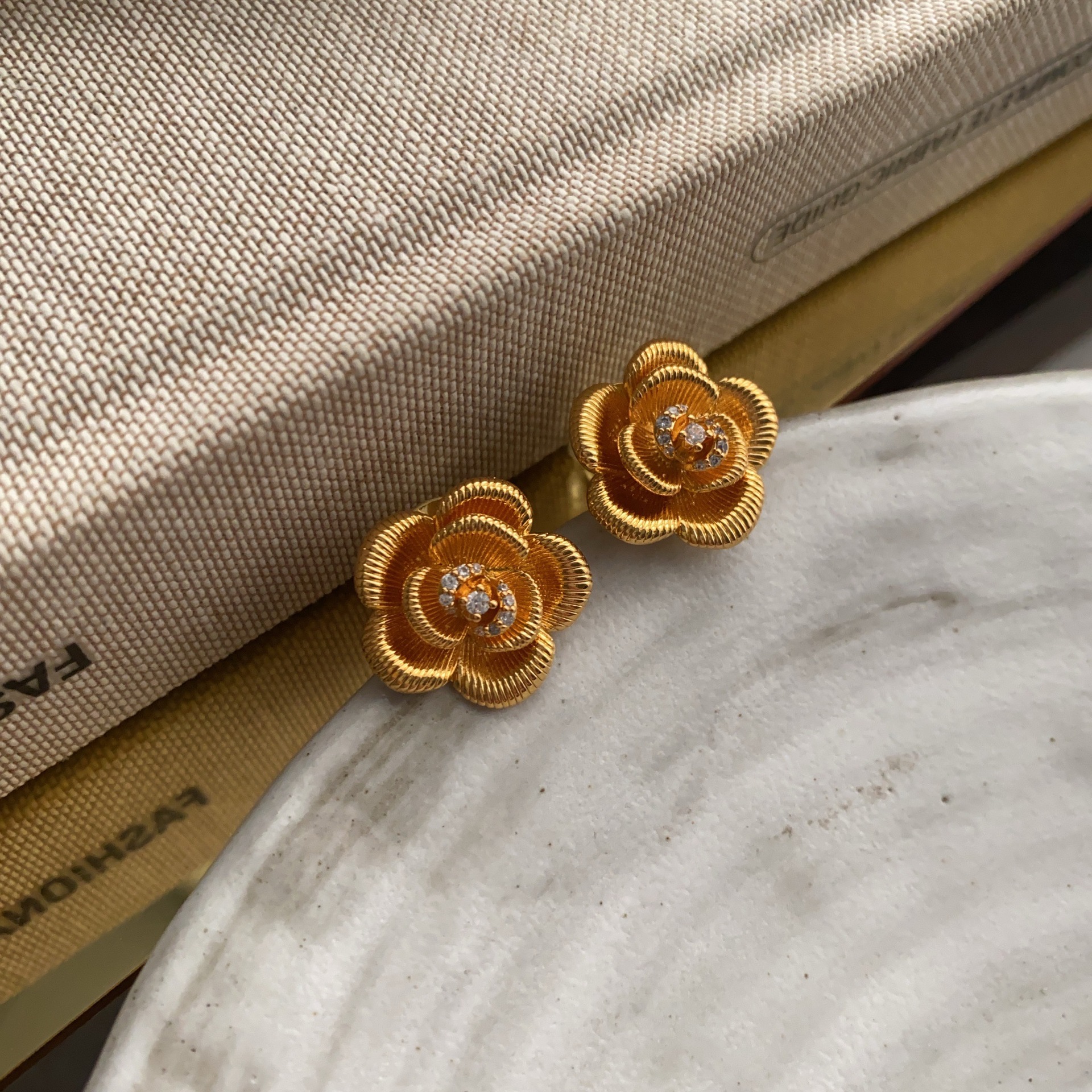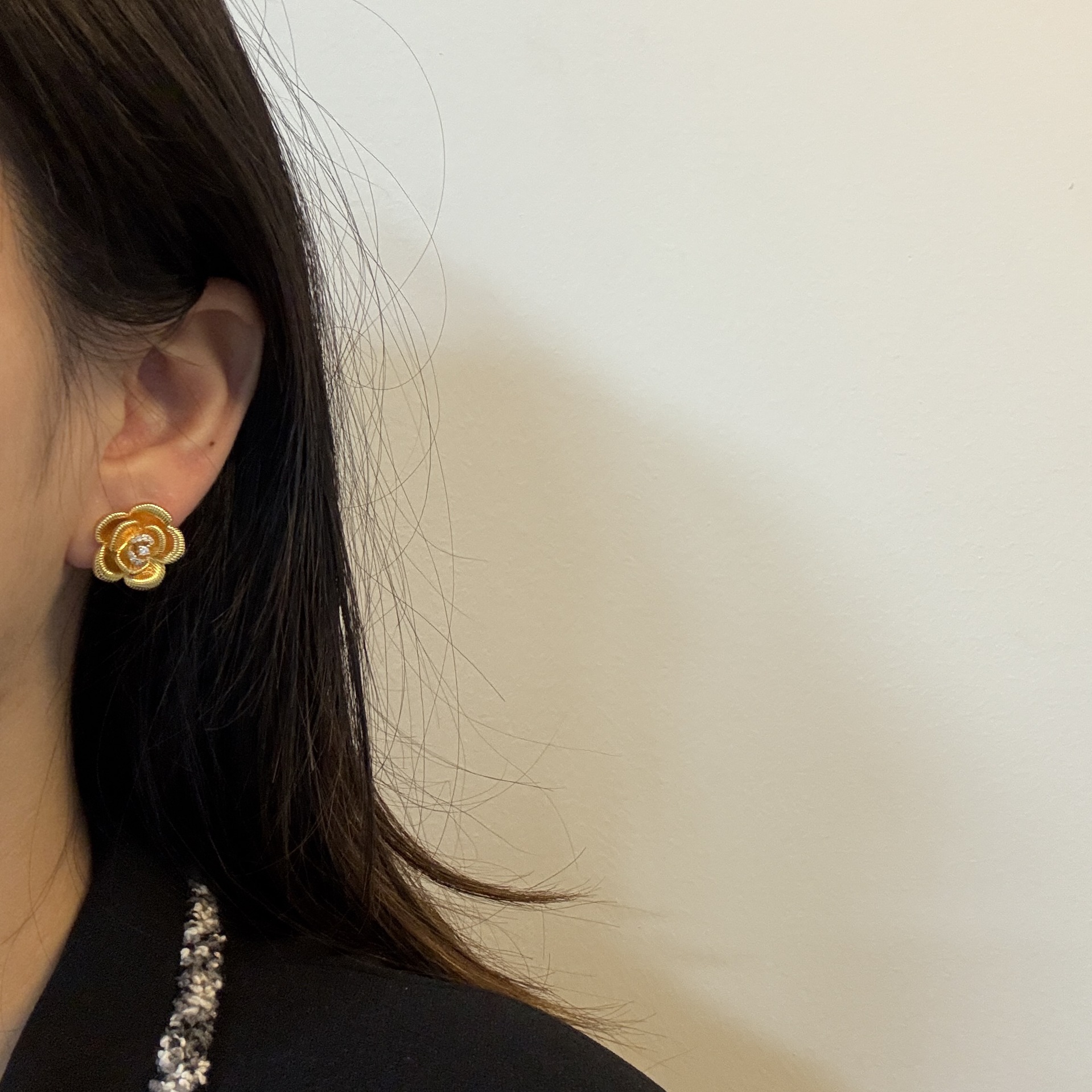 古法镶钻拉丝小金花耳钉复古小众设计感精致花朵耳环小巧百搭耳饰